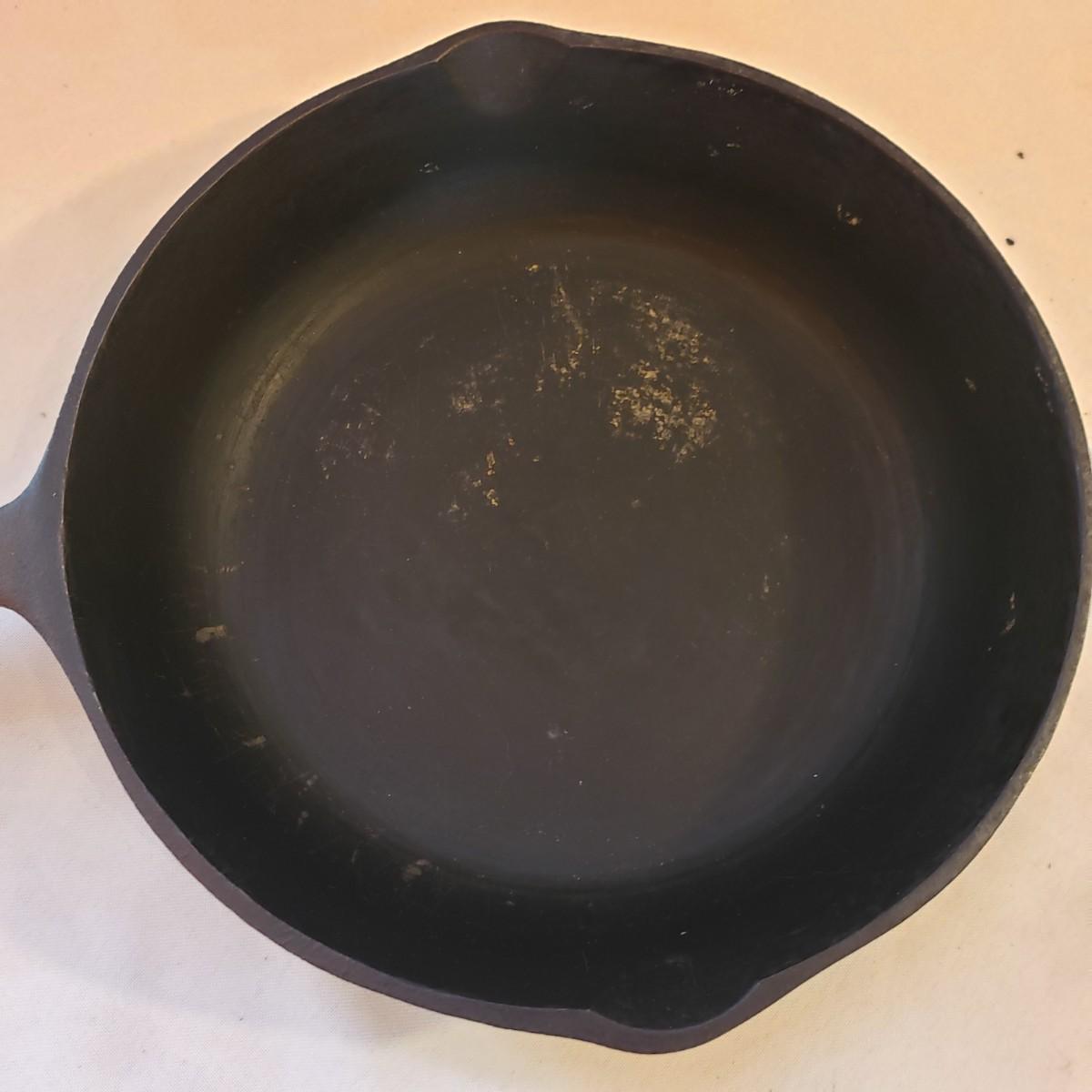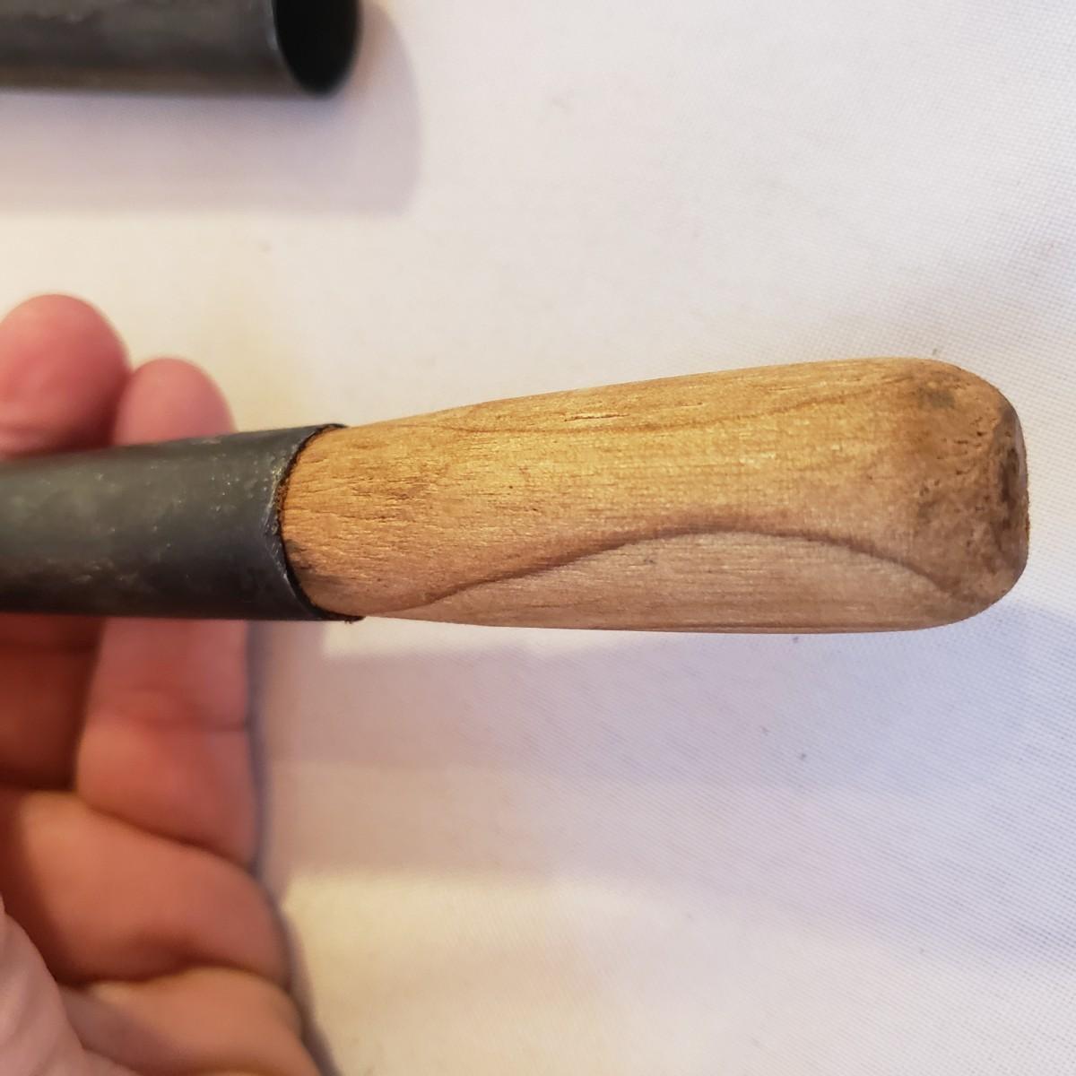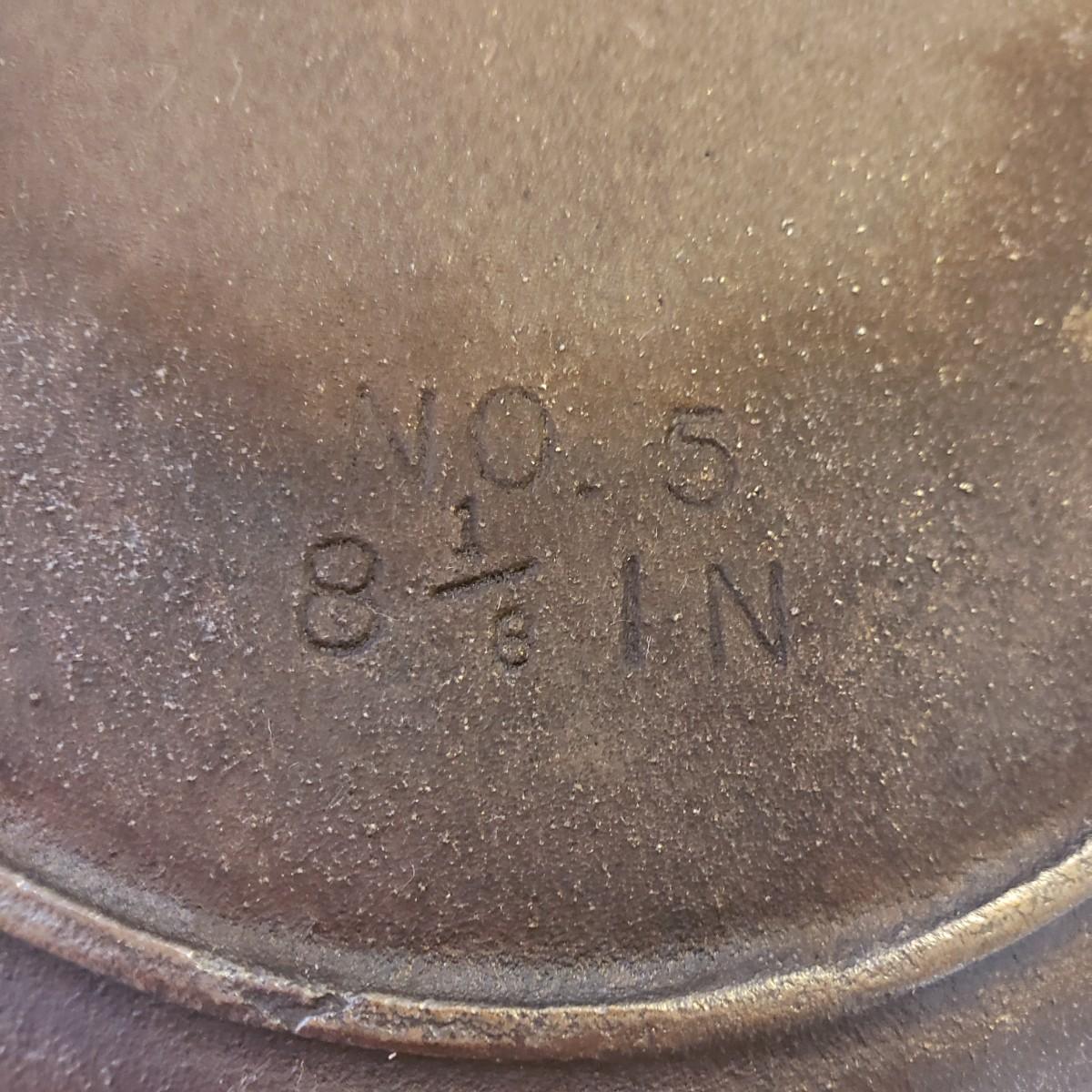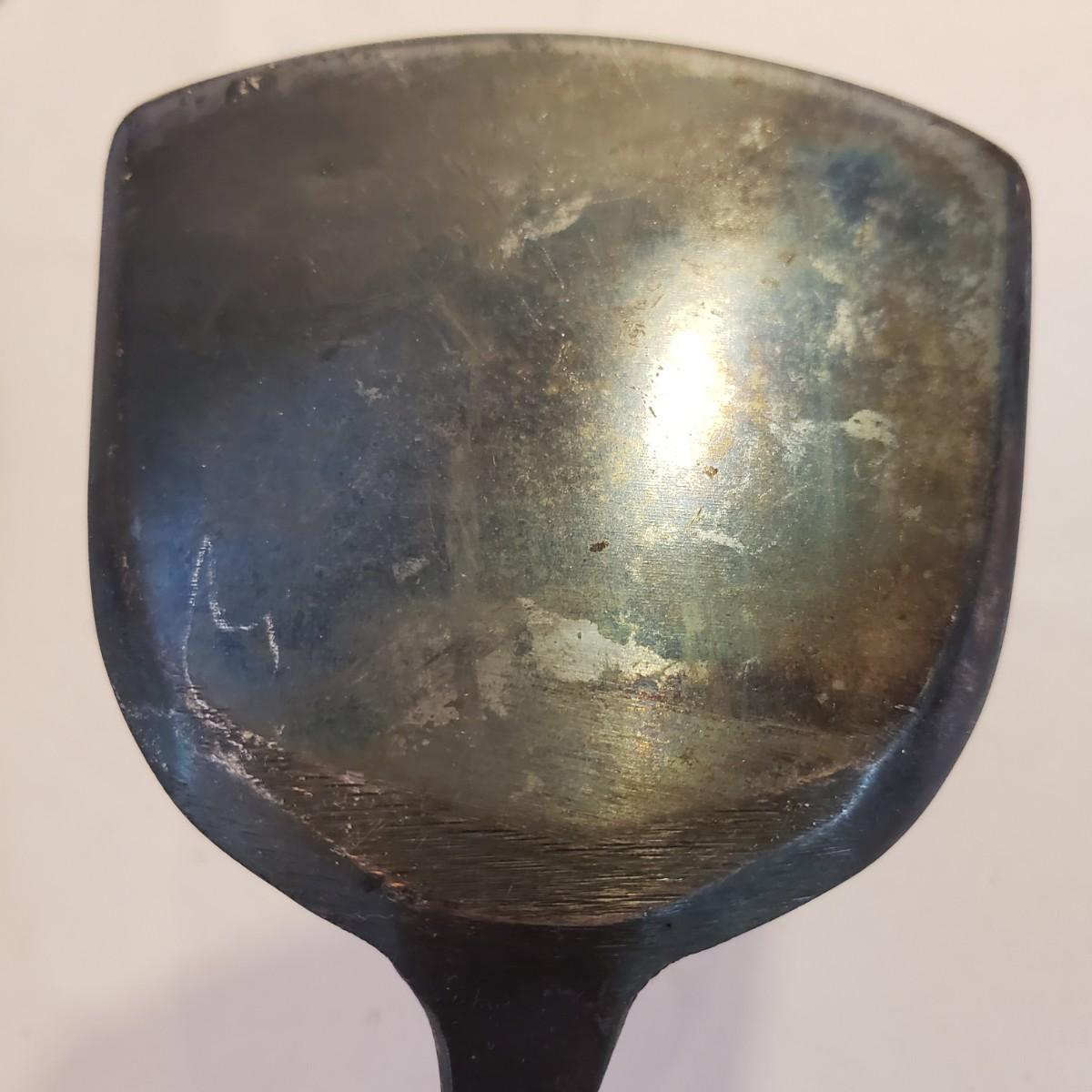 This lot has an 8" No. 5 cast iron pan. There appears to be no rusting on the pan. The metal with wooden end ladle measures 4" x 14". The metal spatula is missing the wood end, see picture.