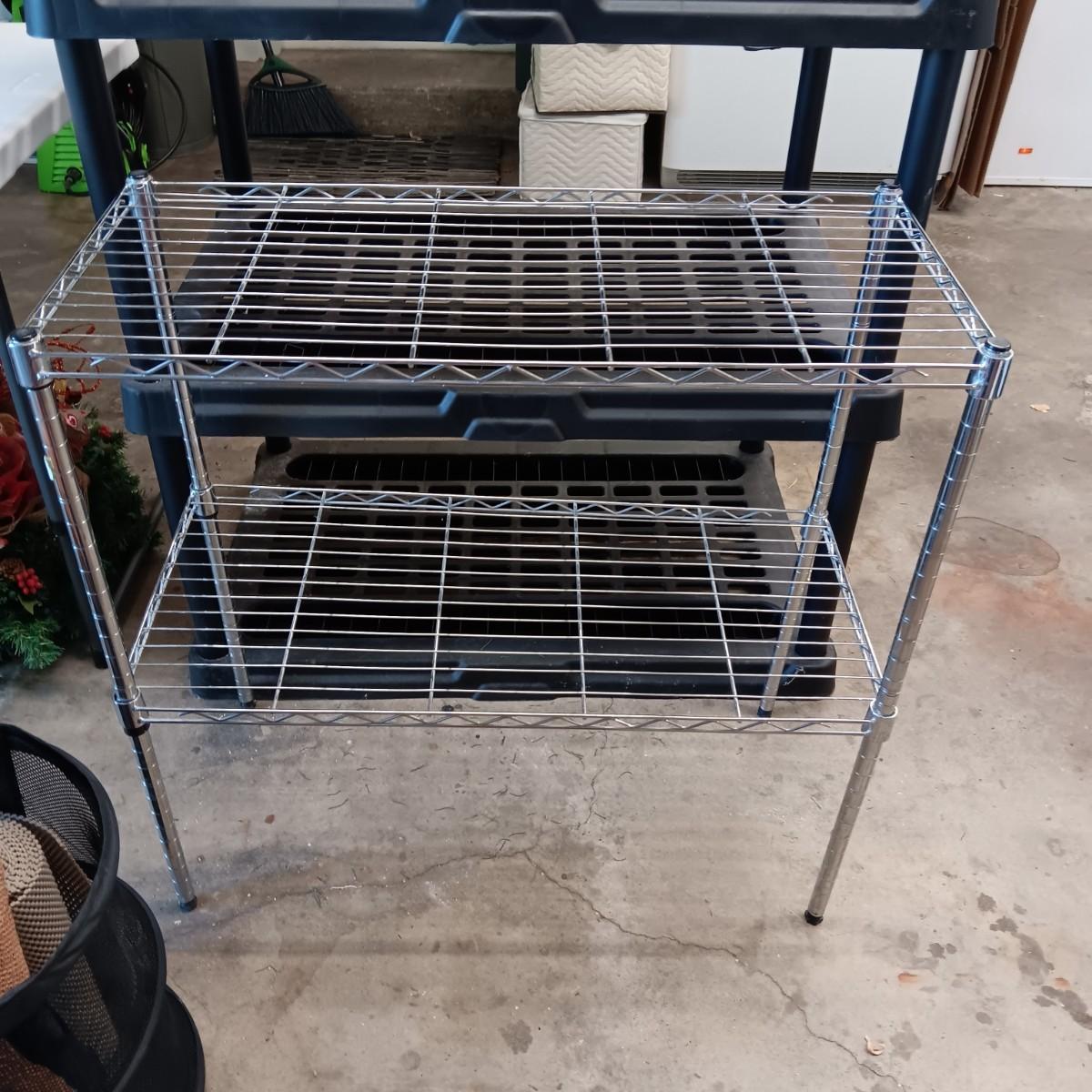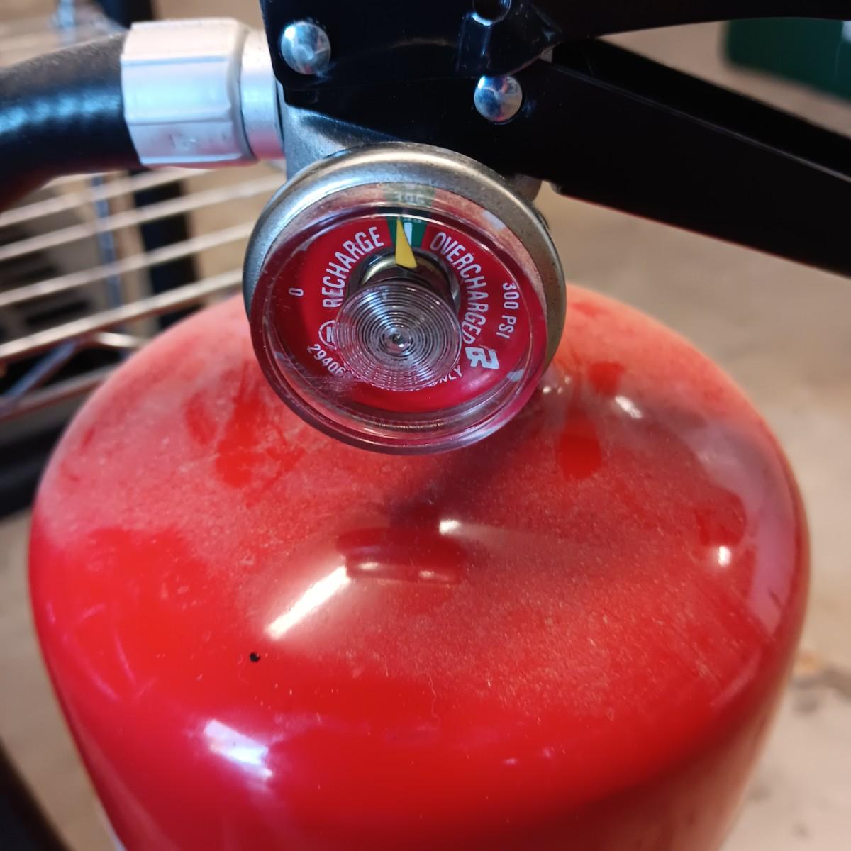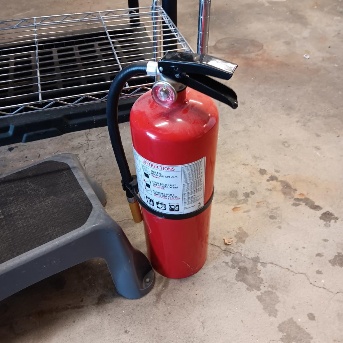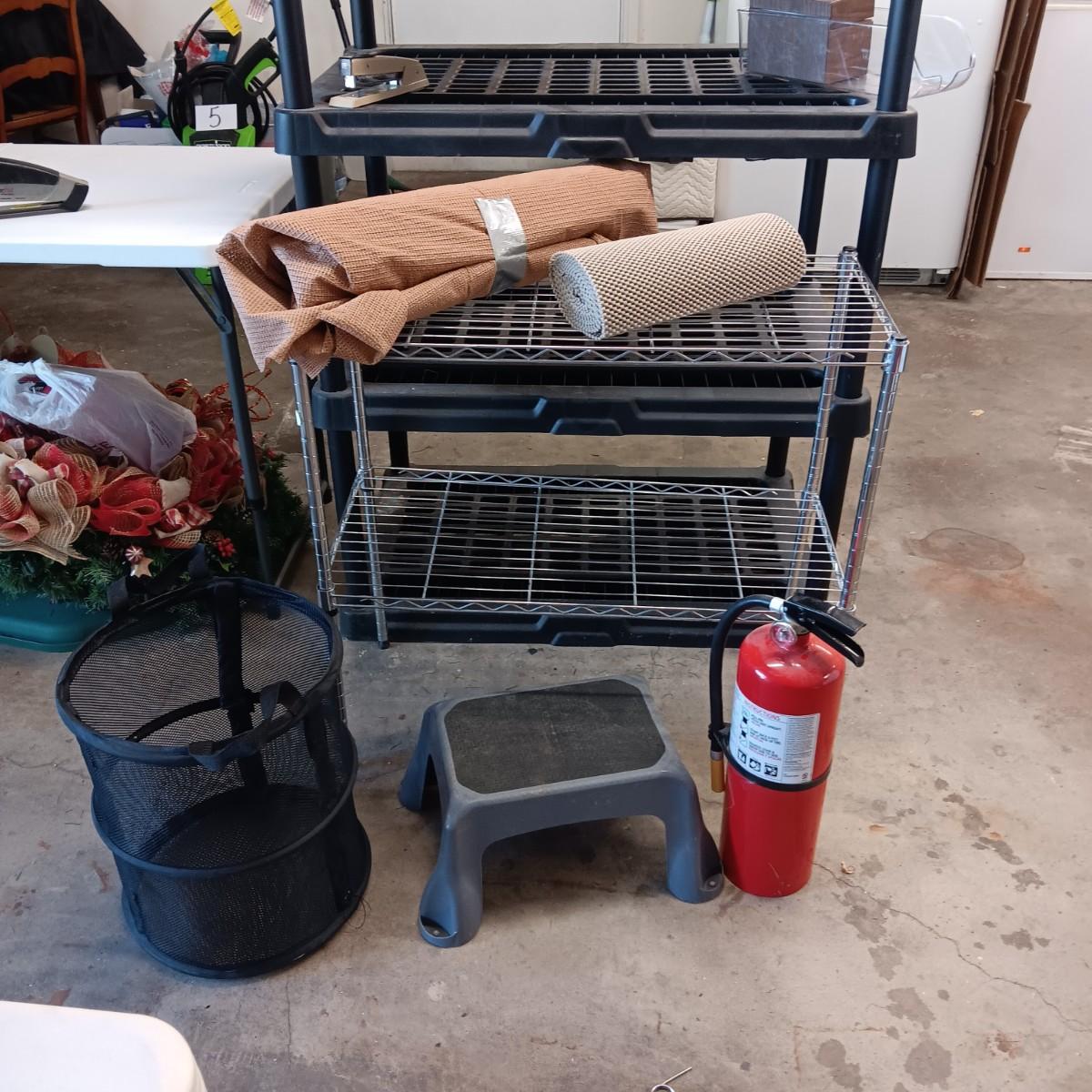 NO SLIDE MATERIAL, SMALL METAL STORAGE SHELF, FIRE EXTINGUISHER & STOOL