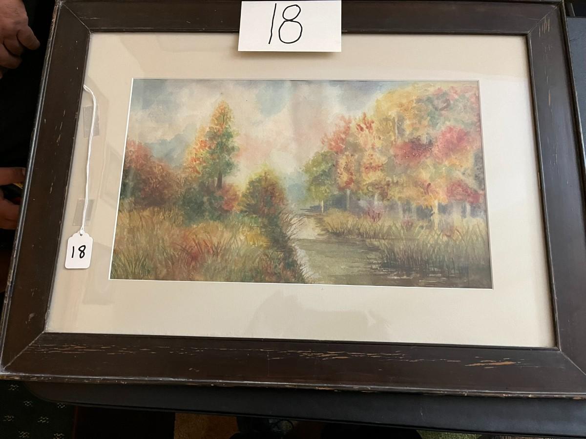 Framed and matted landscape in pastels and autumn colors. Under glass. Older frame is rough. Artist name not determined. Subject is H 9.75" x W 16.25". Overall frame size is H25.5" x 18.75".