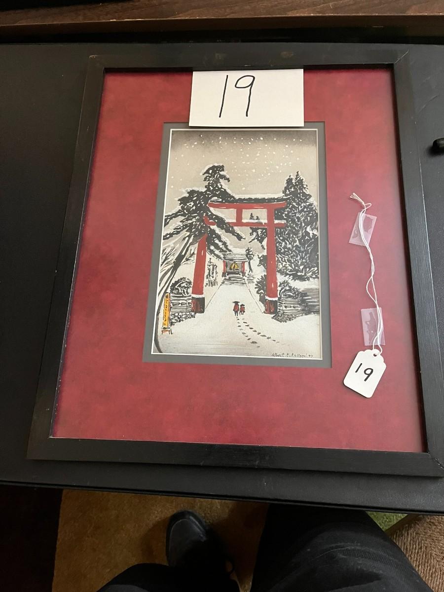 Framed and matted Torii Gate in Snow. Artist is Albert T. Roller '97. Subject is H 10" x W 6.75 ". Overall frame is H 17.75" x 14.75"