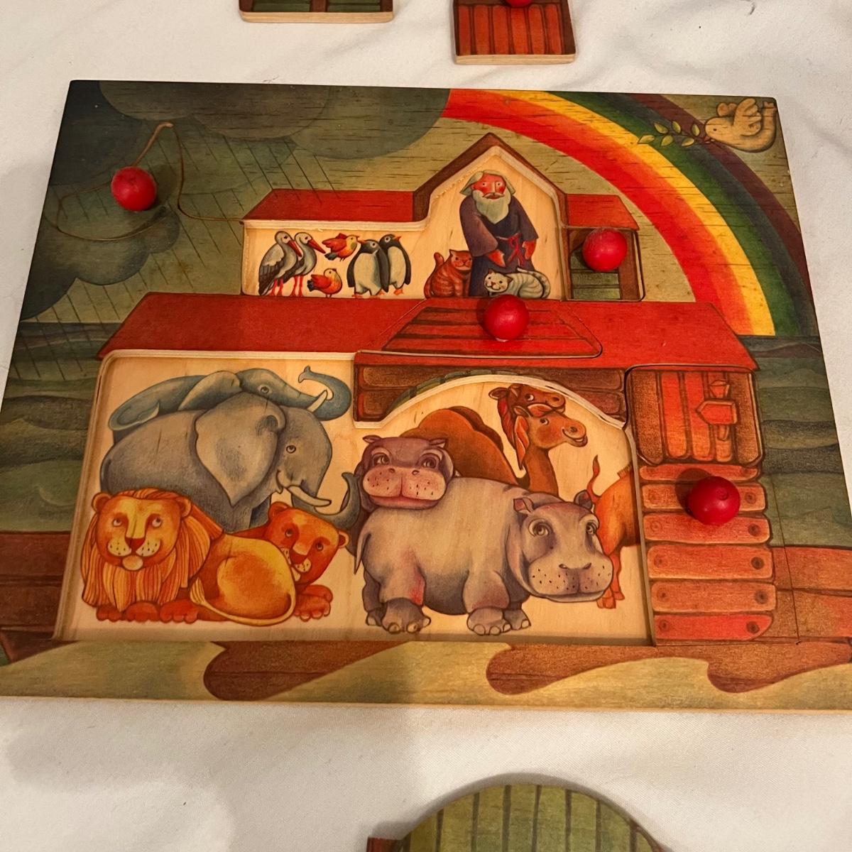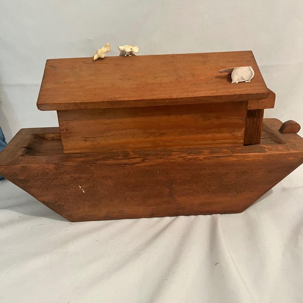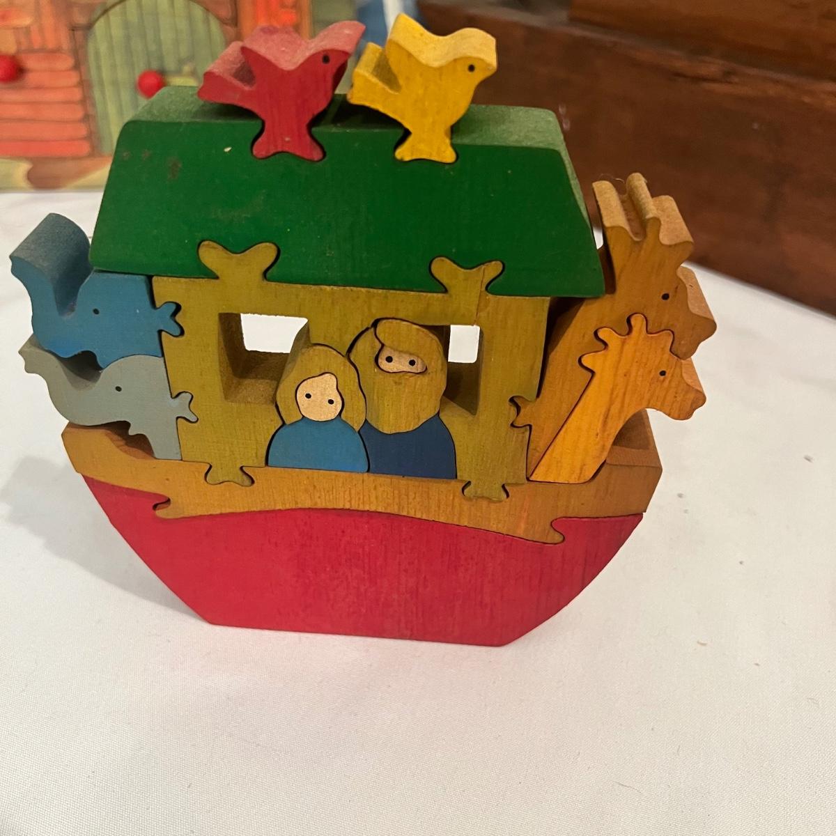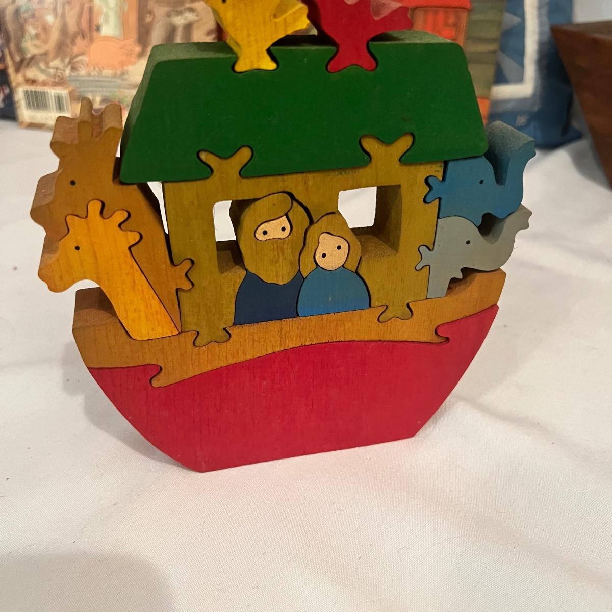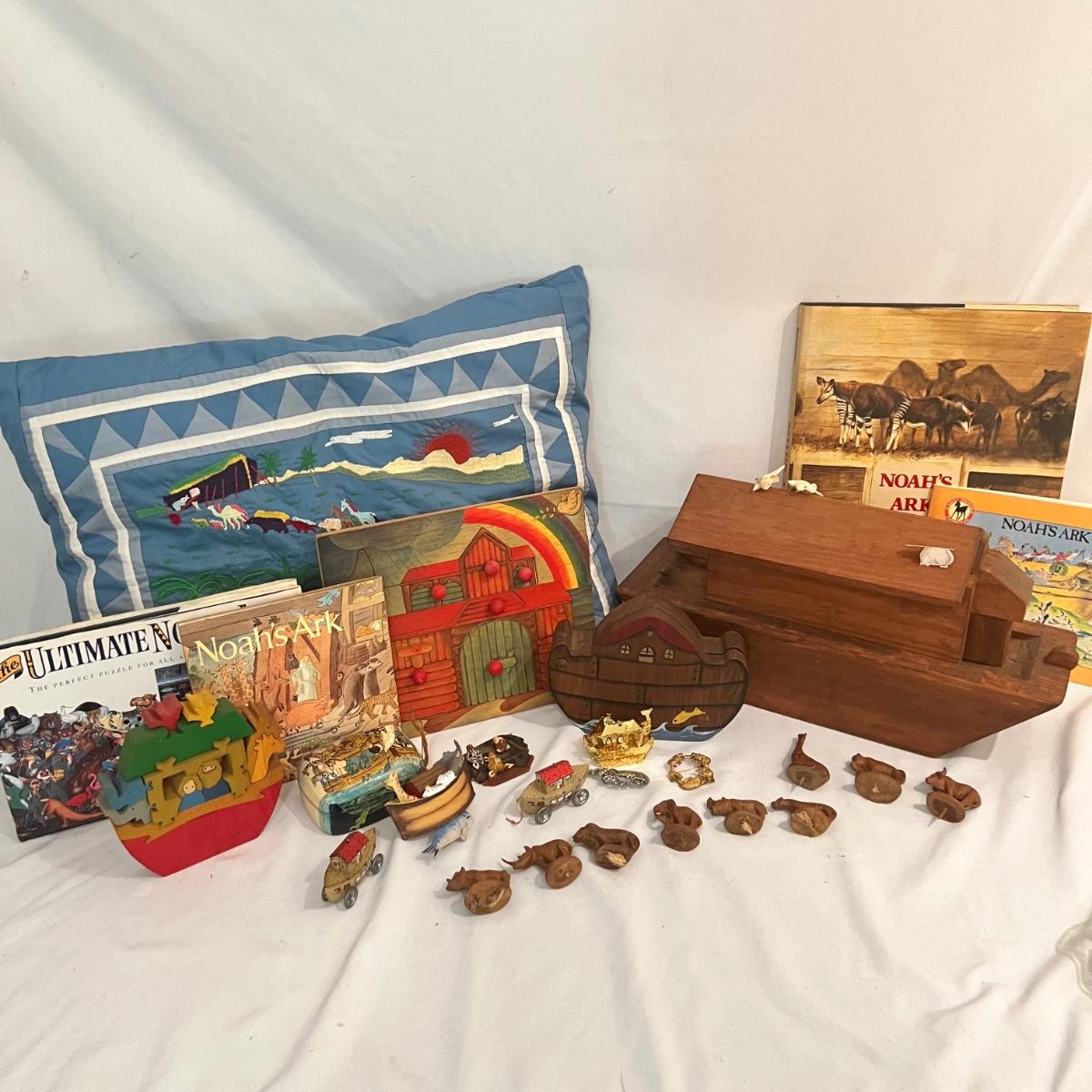 All things Noah's Ark & animals. This lot includes a large pillow, books, puzzles, figurines, ornaments, trinket boxes, and a play toy Ark. The nine carved wooden animal figurines each measure approximately 2.25” x .5” x 2”H. Please note that the bottoms of some of these have broken off. The pillow measures approximately 24” x 5” x 18”H. It has some pet hair and will need to be cleaned. Please see photos for inventory.