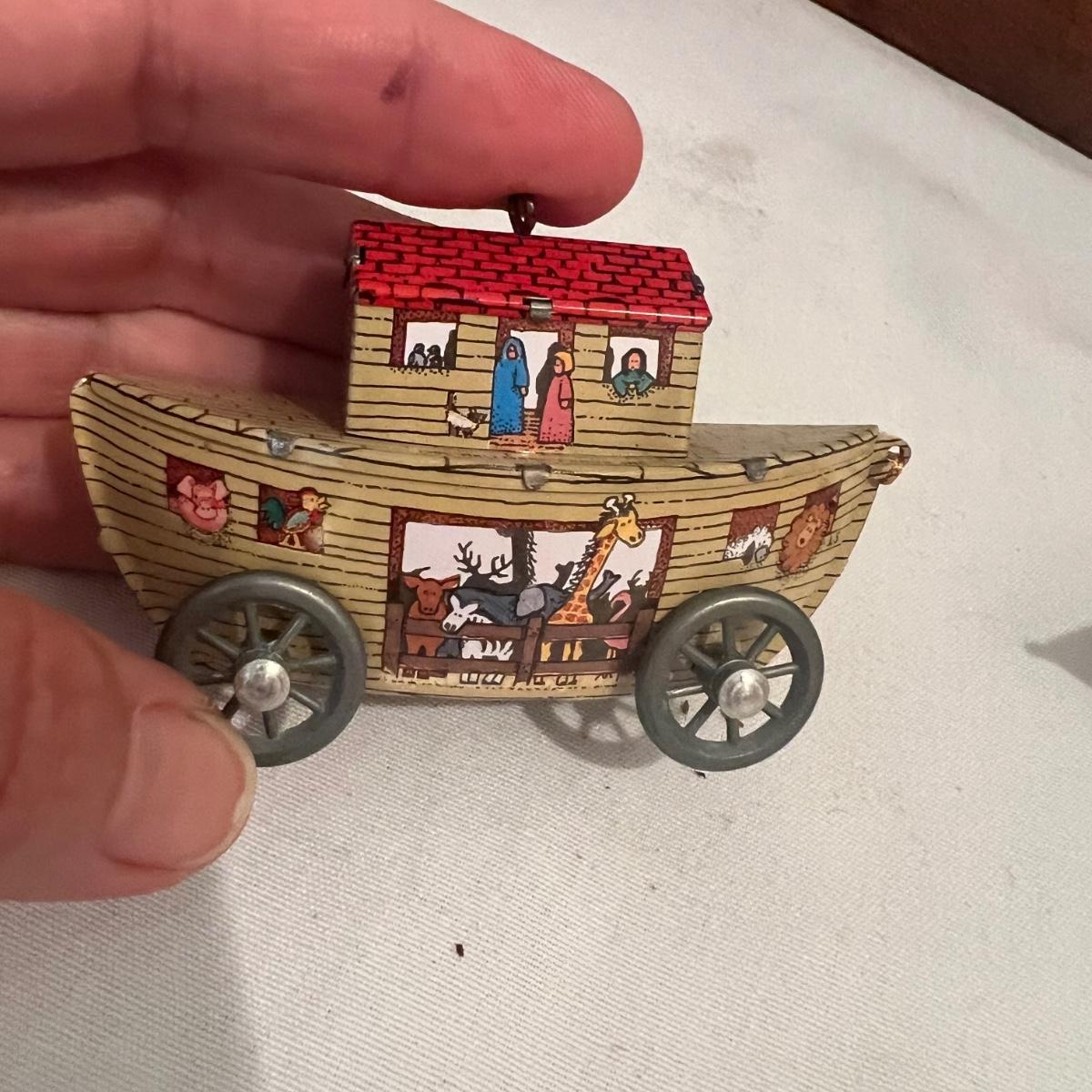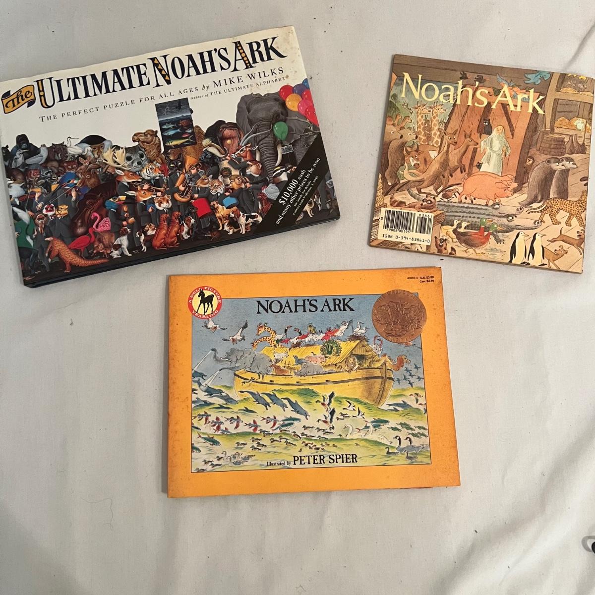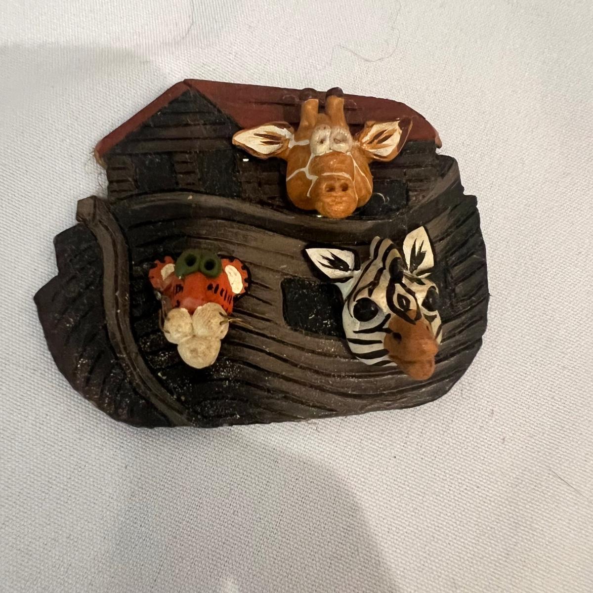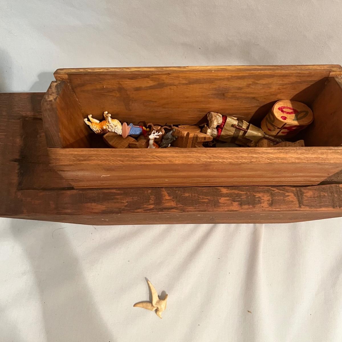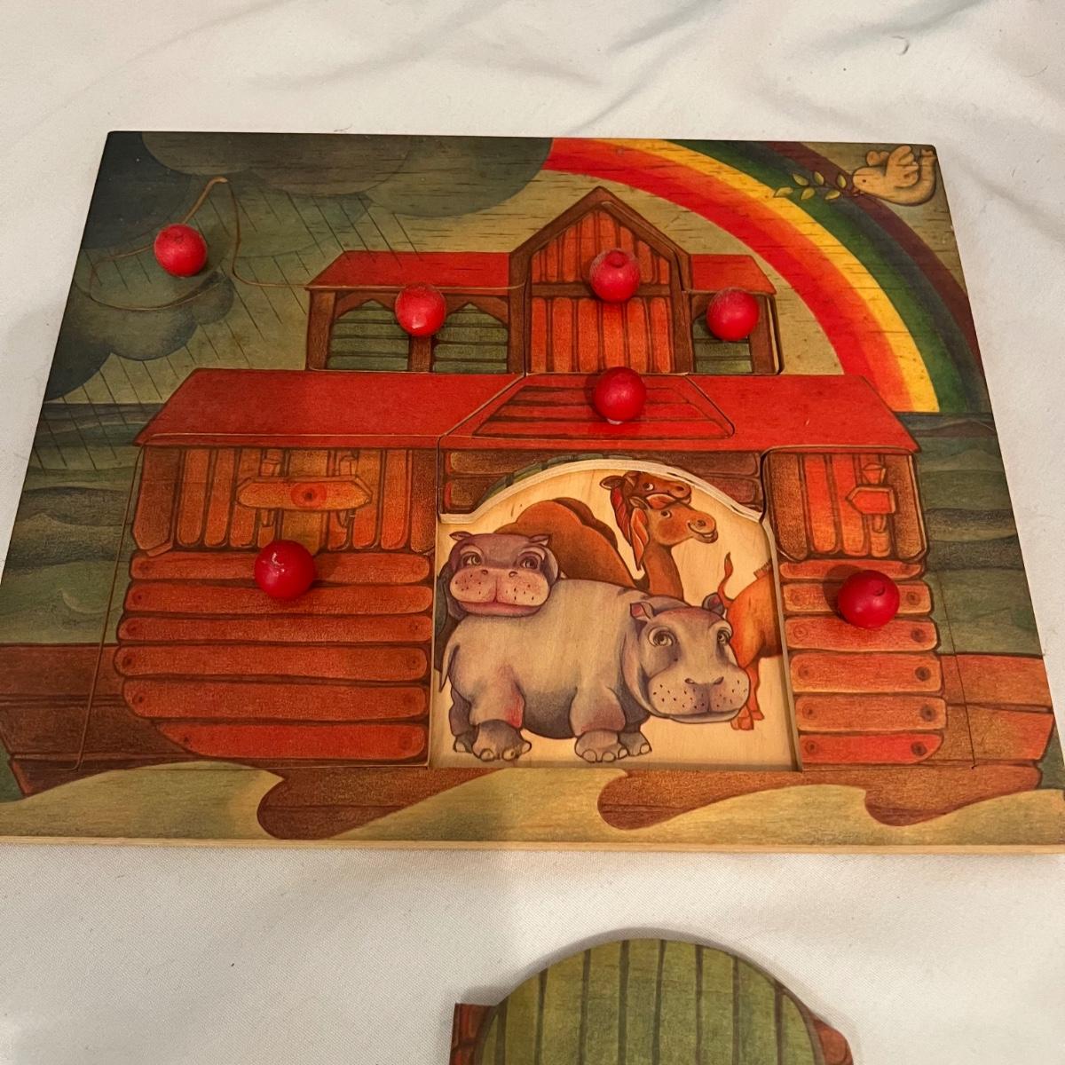 All things Noah's Ark & animals. This lot includes a large pillow, books, puzzles, figurines, ornaments, trinket boxes, and a play toy Ark. The nine carved wooden animal figurines each measure approximately 2.25” x .5” x 2”H. Please note that the bottoms of some of these have broken off. The pillow measures approximately 24” x 5” x 18”H. It has some pet hair and will need to be cleaned. Please see photos for inventory.