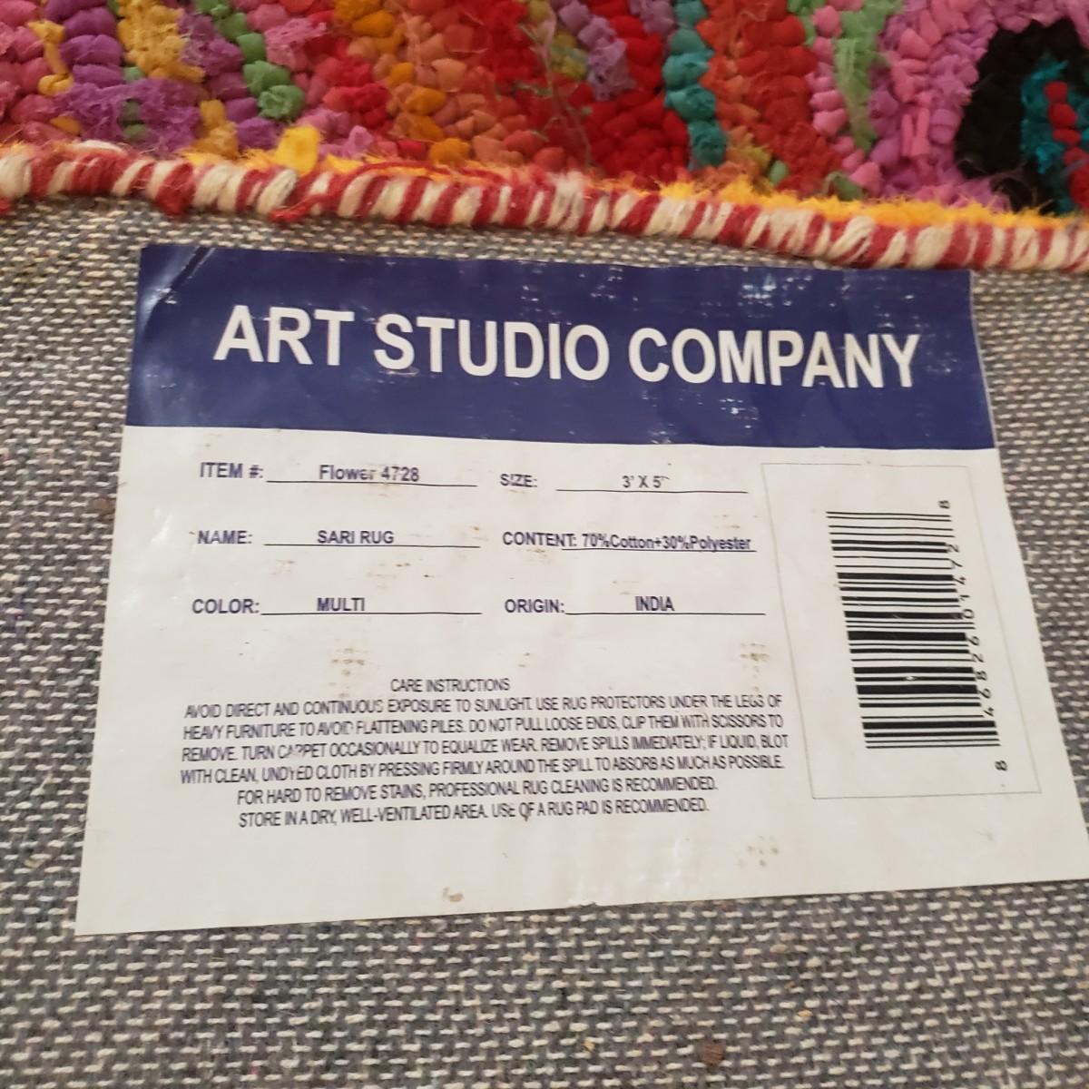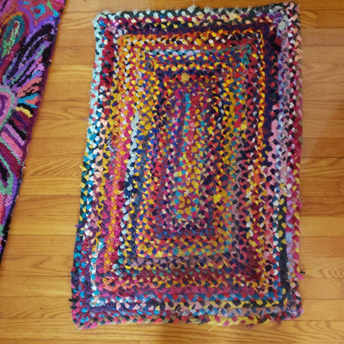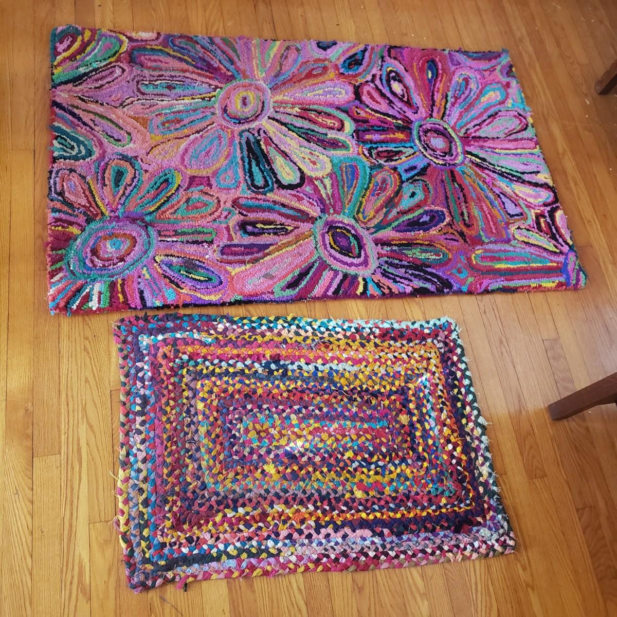 This lot features two multi colored area rugs. The Nomad 2' x 3' hand braided rug is 100% cotton. The braids are sewn together, see picture. The Art Studio Company rug is a flower pattern with a thick backing to it. The floral rug measures 3' x 5'. The rug is 70% cotton and 30% polyester.
