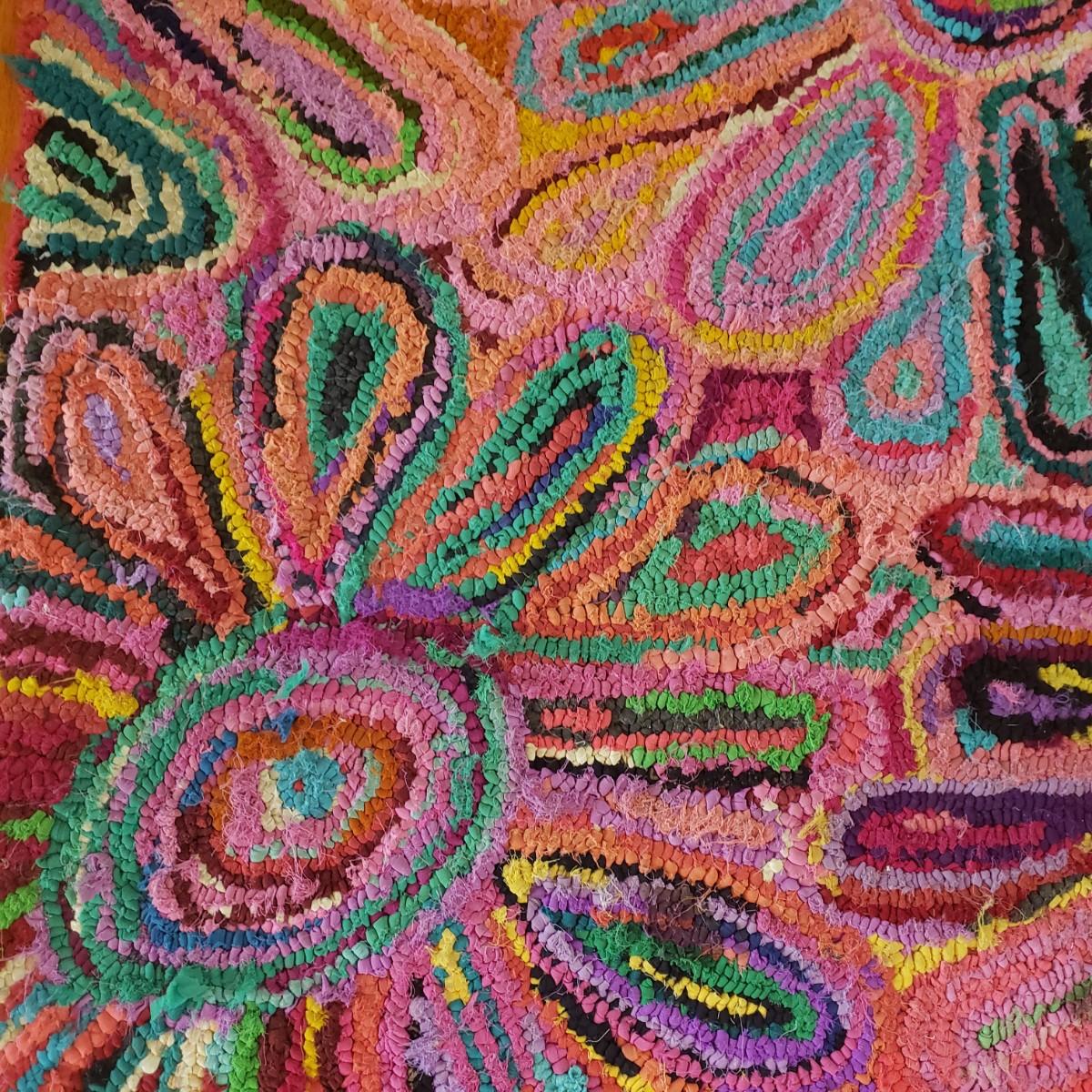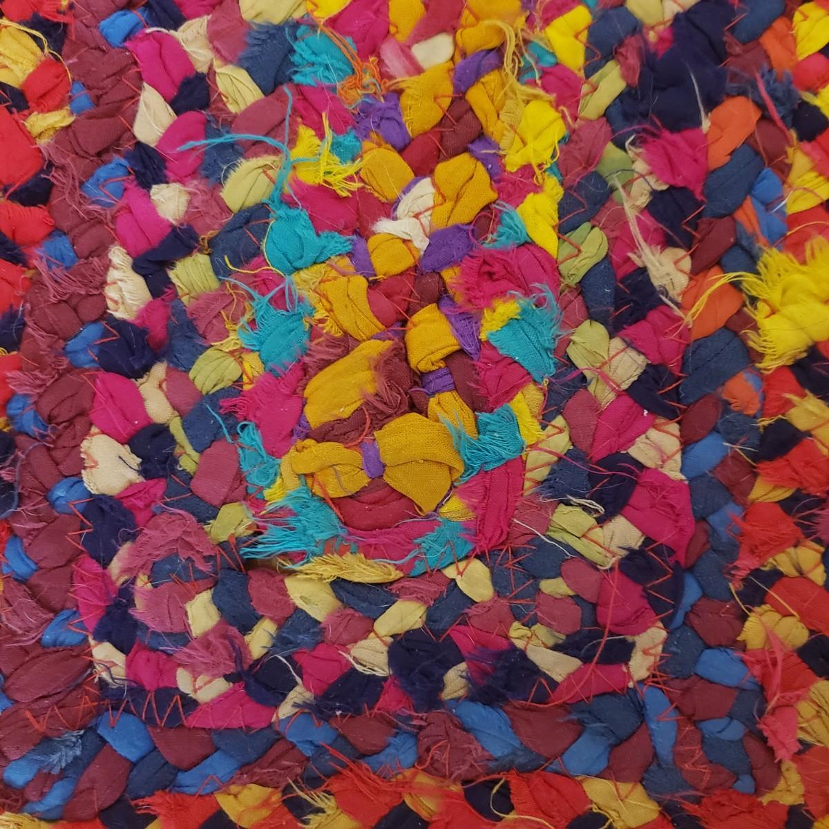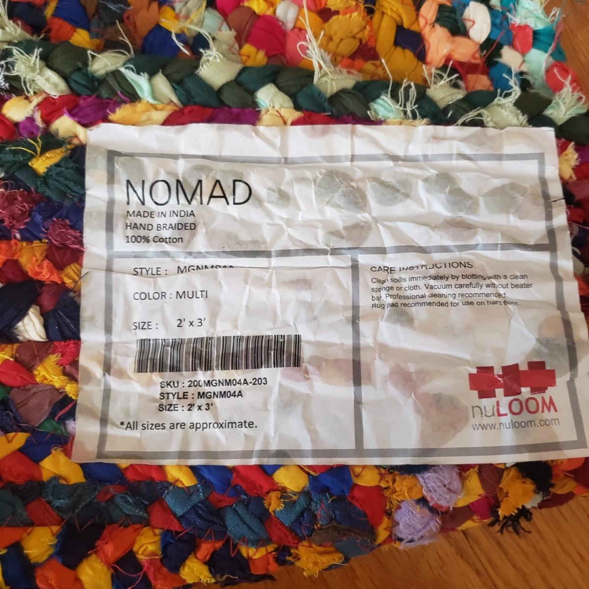 This lot features two multi colored area rugs. The Nomad 2' x 3' hand braided rug is 100% cotton. The braids are sewn together, see picture. The Art Studio Company rug is a flower pattern with a thick backing to it. The floral rug measures 3' x 5'. The rug is 70% cotton and 30% polyester.