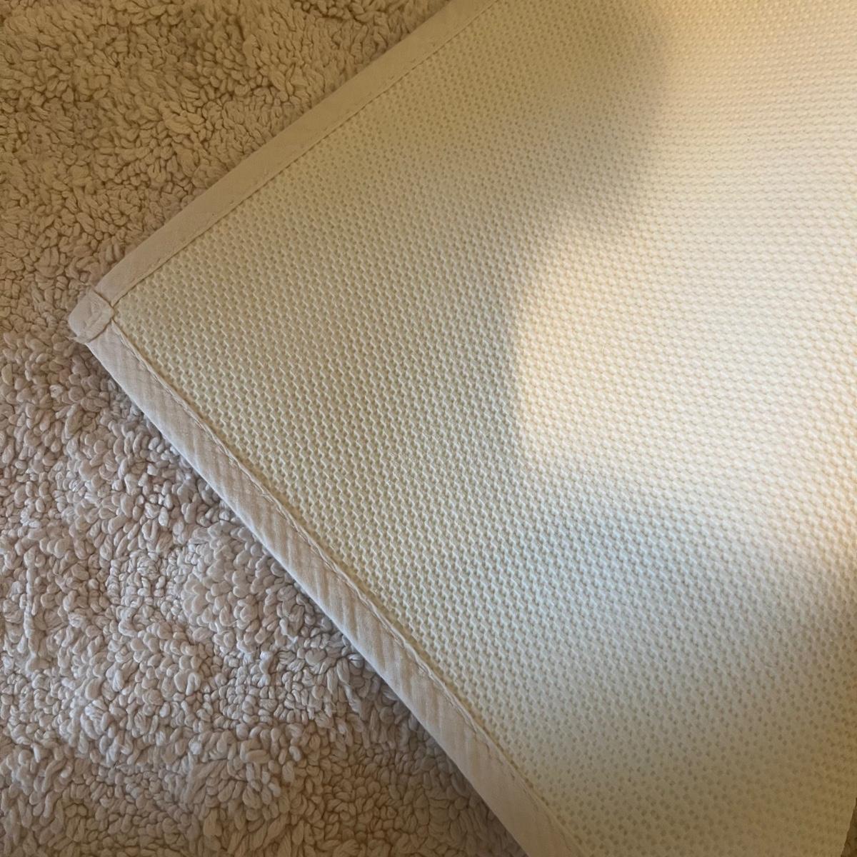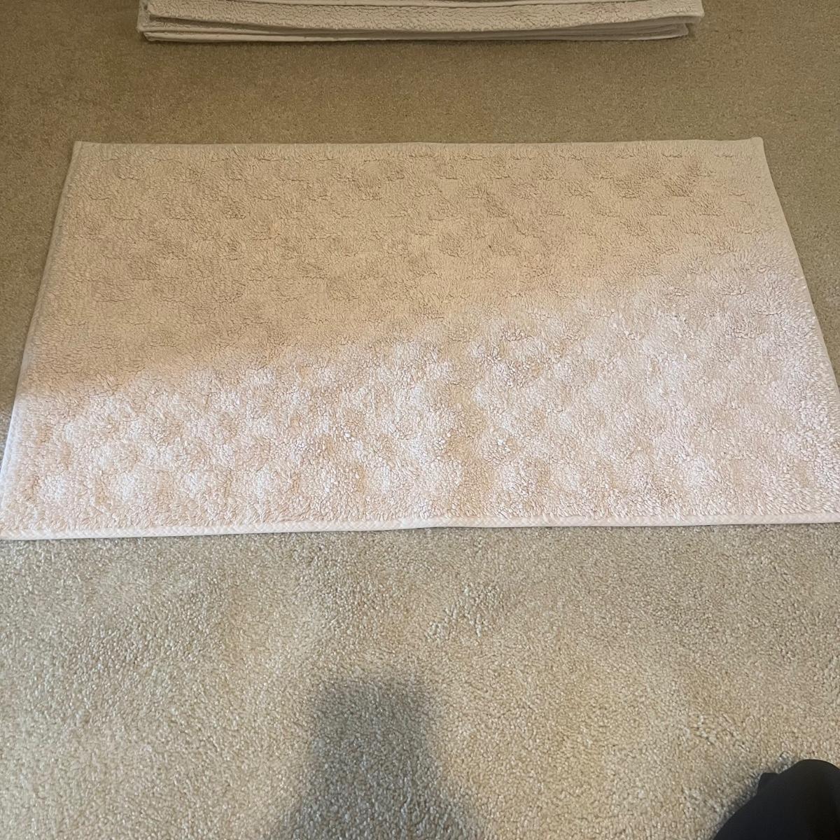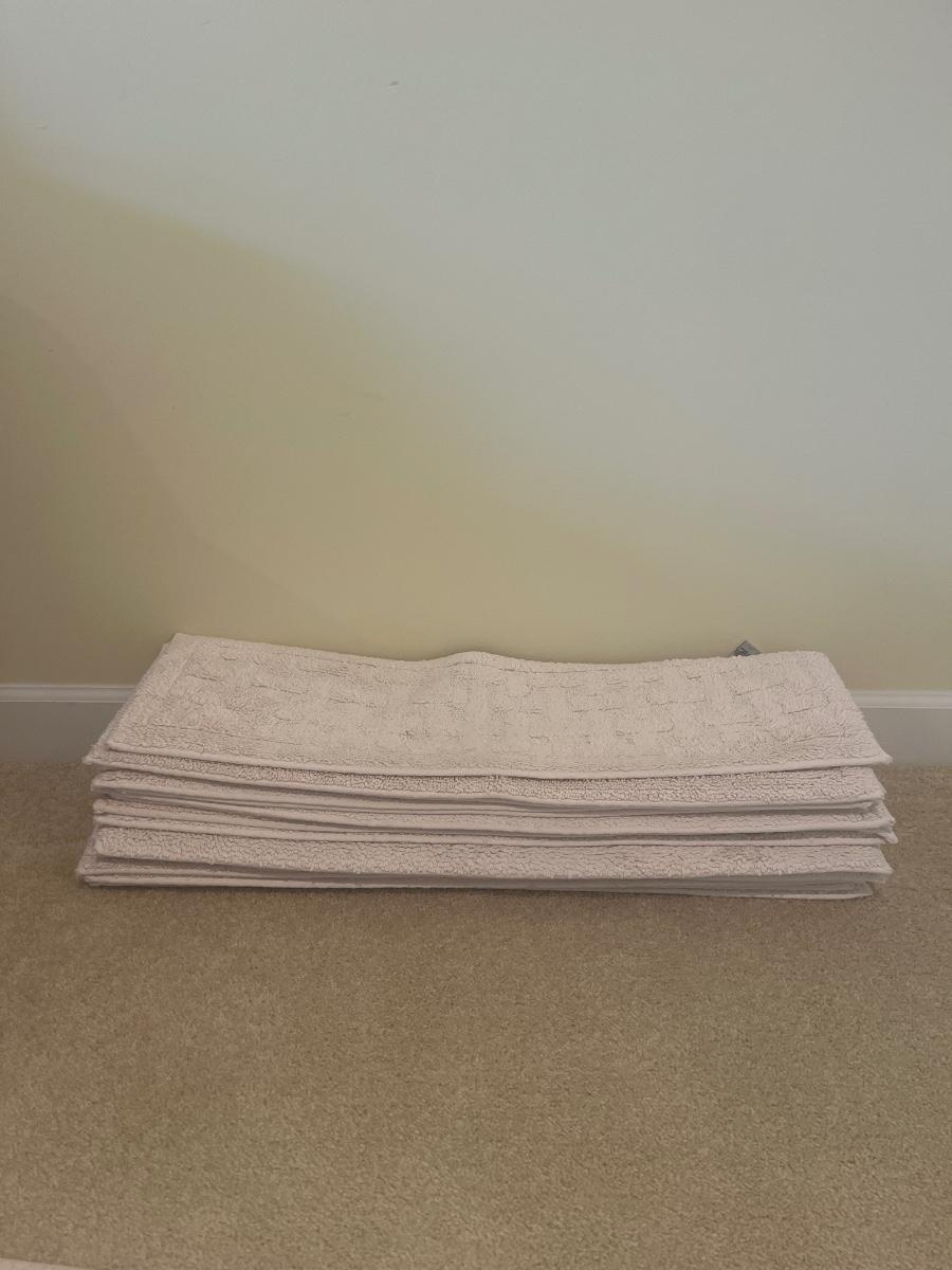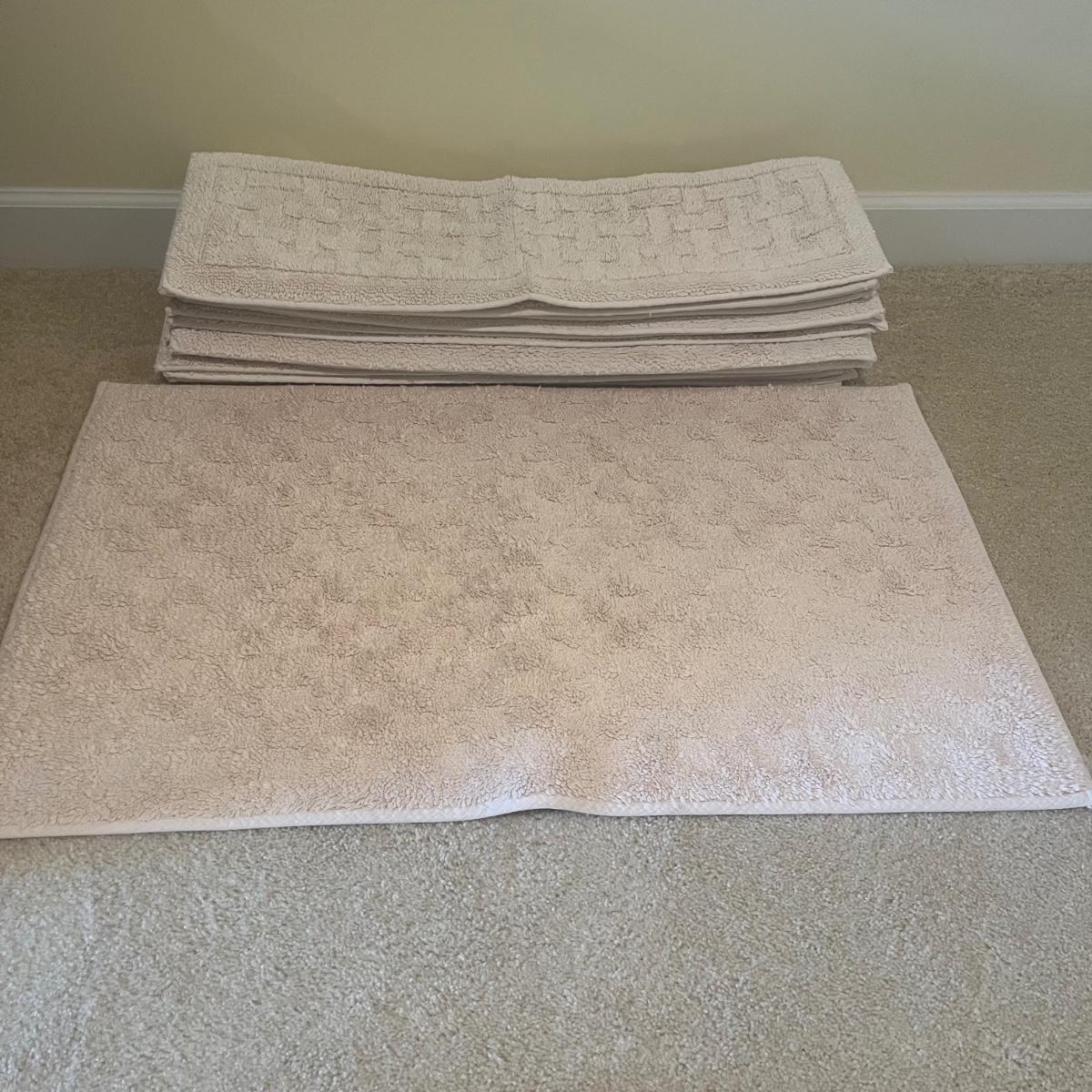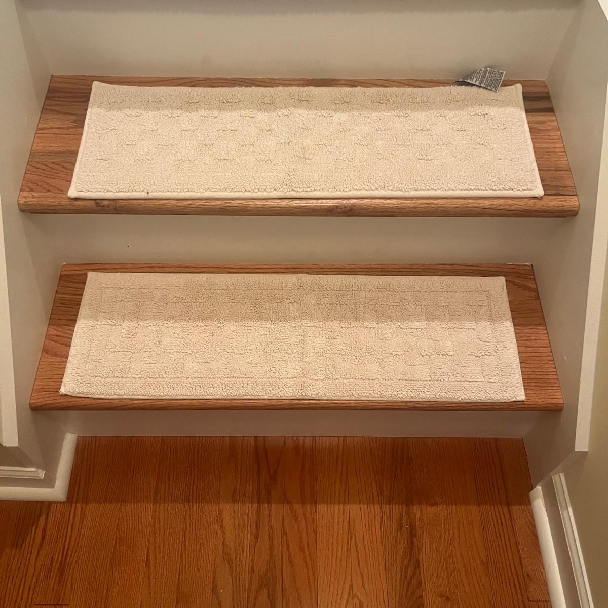 Lot includes 18 cotton carpet stair treads with non slip rubber back and one small matching rug that measures 21” x 35”. Stair treads measure 9.5” x 29”.
