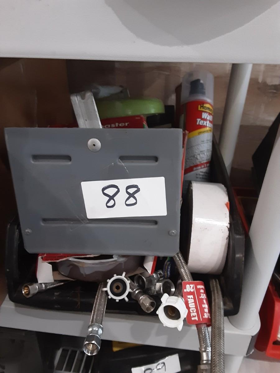 LOT 88 - various hose, tape, john-ring plus,, Everbilt and Fluidmaster wax rings, Wall texture spray, auto parts brakleen, etc. as shown
