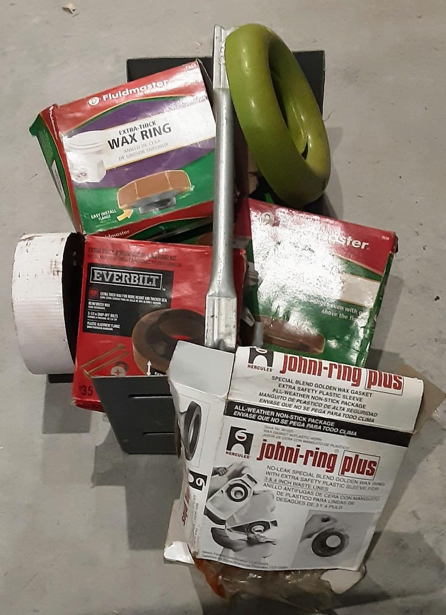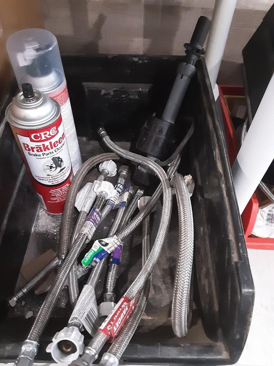 various hose,tape, john-ring plus,, Everbilt and Fluidmaster wax rings, Wall texture spray, auto parts brakleen, etc