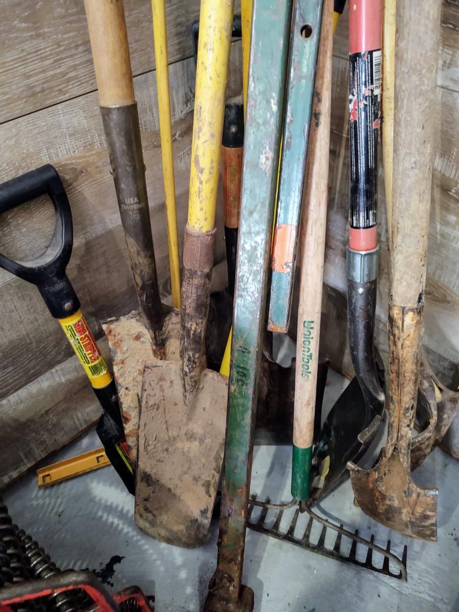 lot 213 - Shovels, spades, rakes,etc.(11) DOES NOT INCLUDE THE YELLOW PROBING ROD