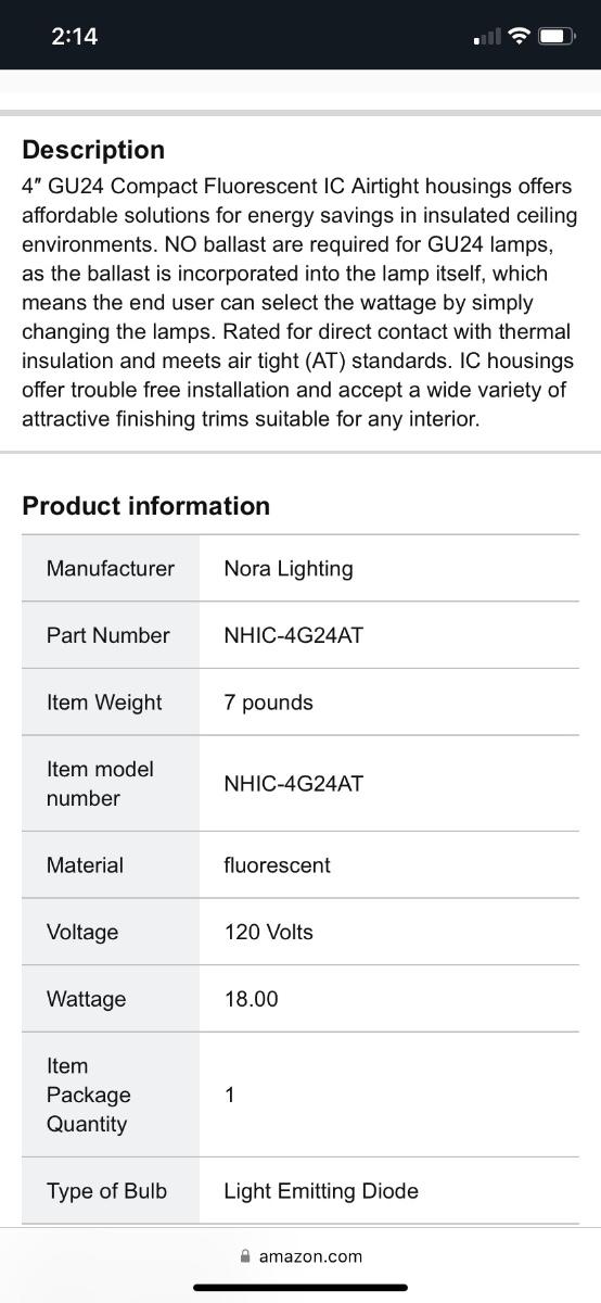 Nora Lighting Recessed 4 26W IC Air-Tight New Construction GU24 Housing NHIC-4G24AT