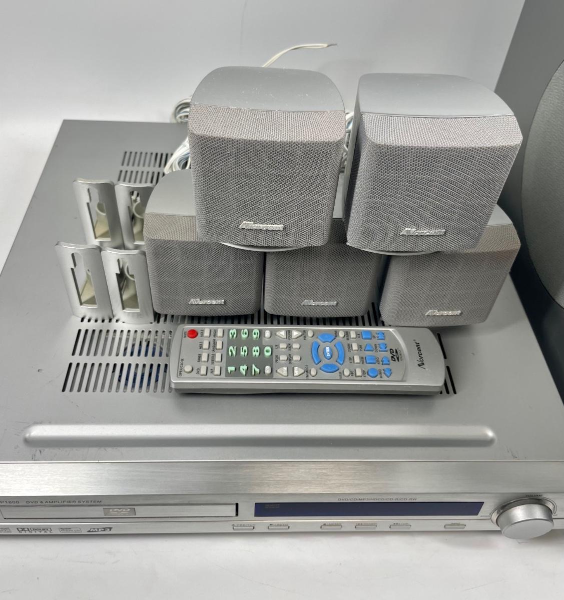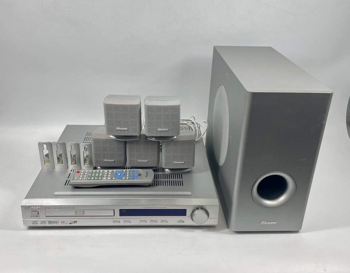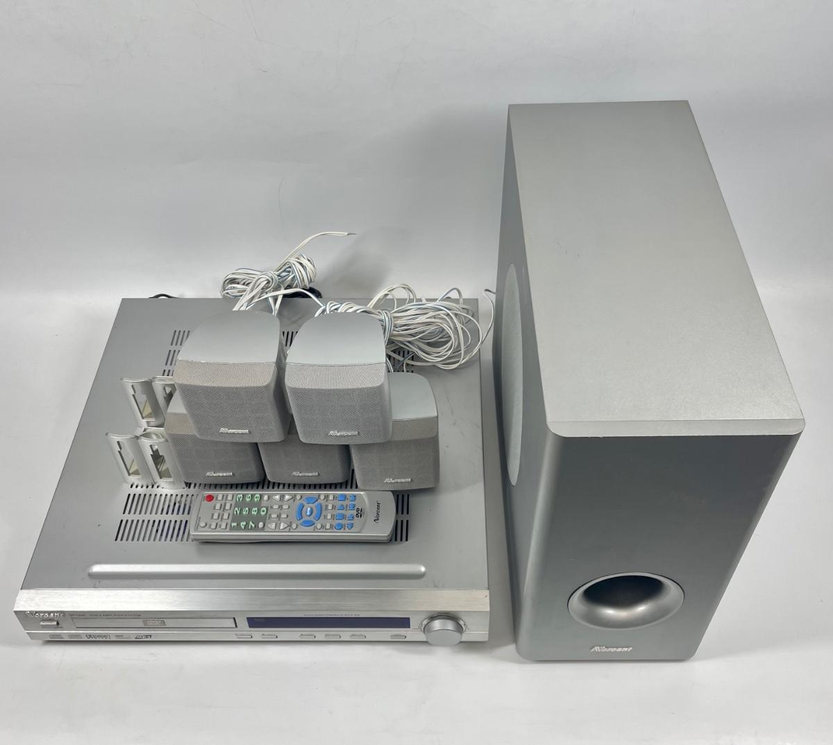 Surround Sound Home Theater System. Handles DVD, CD, CD-R, CD-RW, Kodak CD, MP3. Has AF-FM Stereo, 5 20W satellite speakers, remote, and 50W subwoofer.