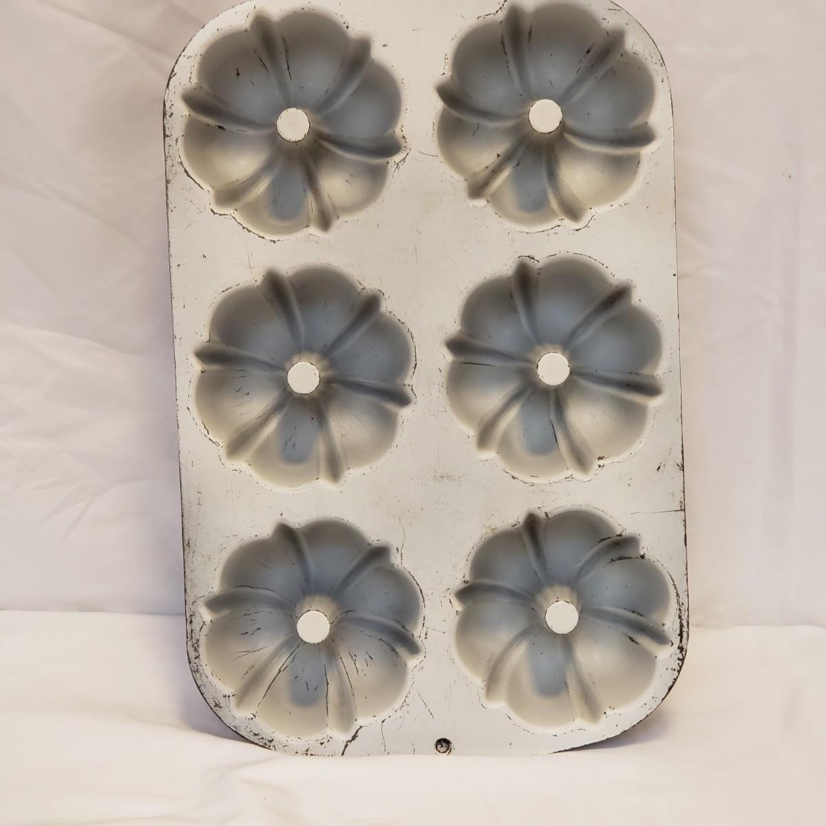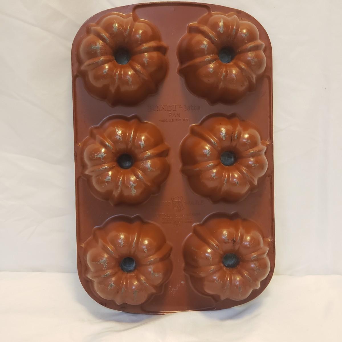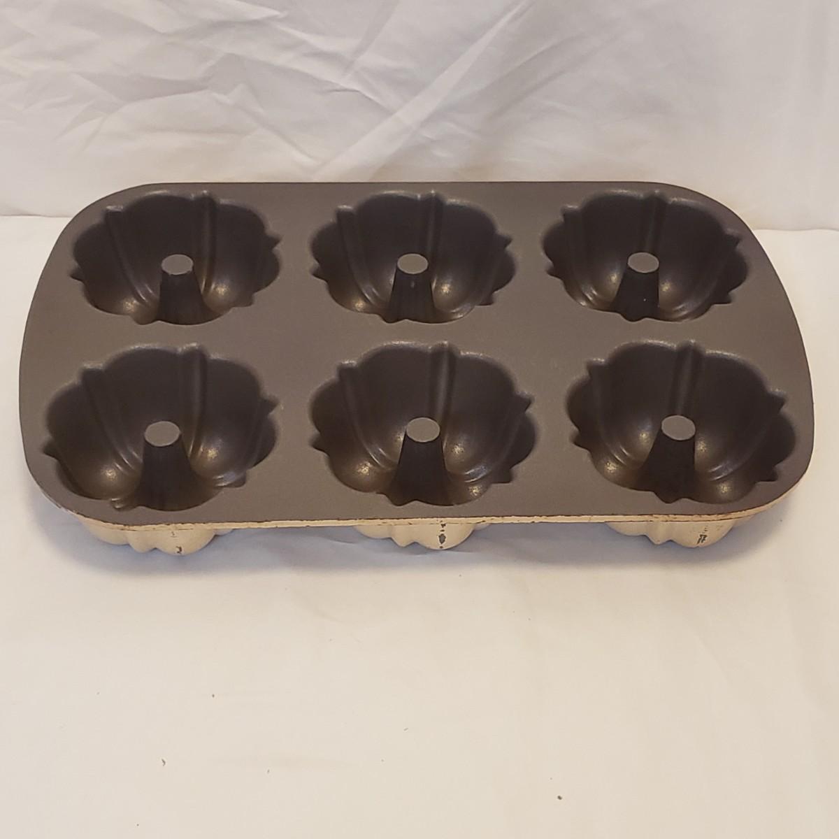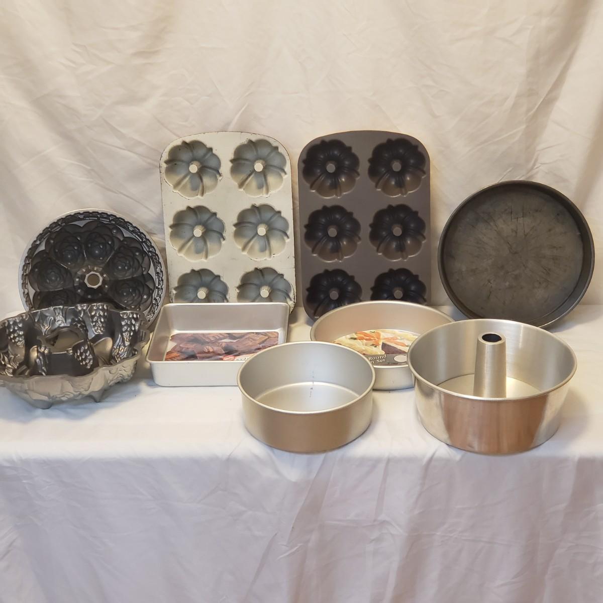 This 9 piece baking lot contains 4 bundt pans from Nordic Ware, two 10 cup Christmas themed pans and two 3 inch pans with 6 cakes in each. The 6 cake pans have ware on them, see pictures for details. The oldest pan also has ware, as seen in the pictures.