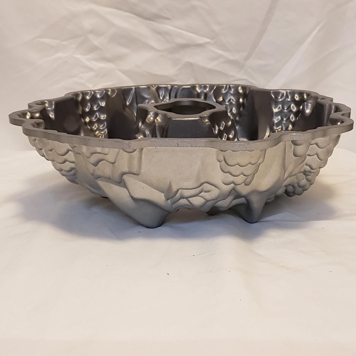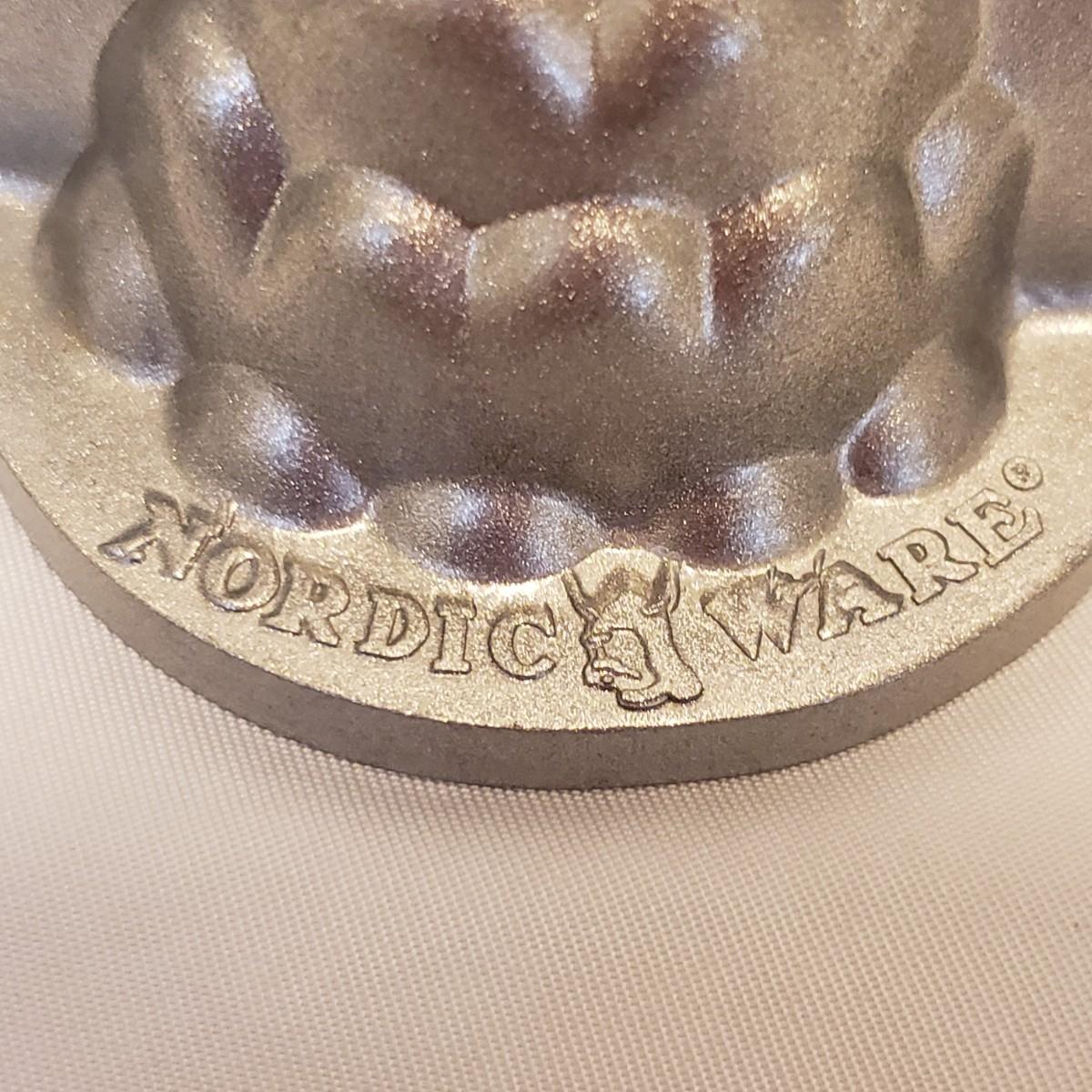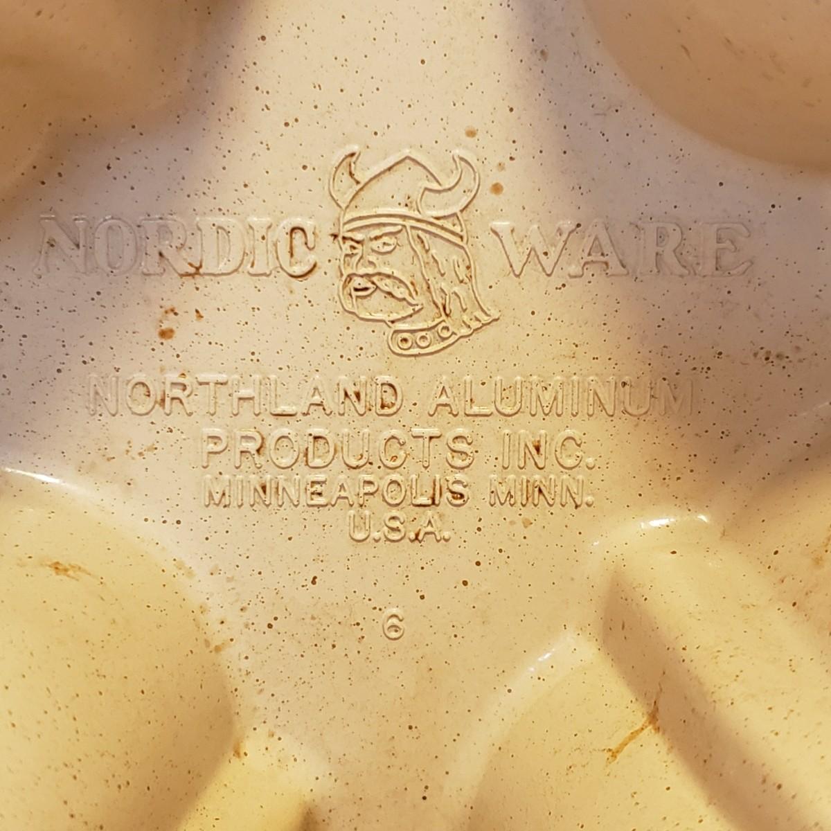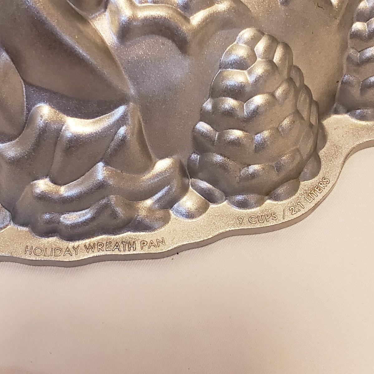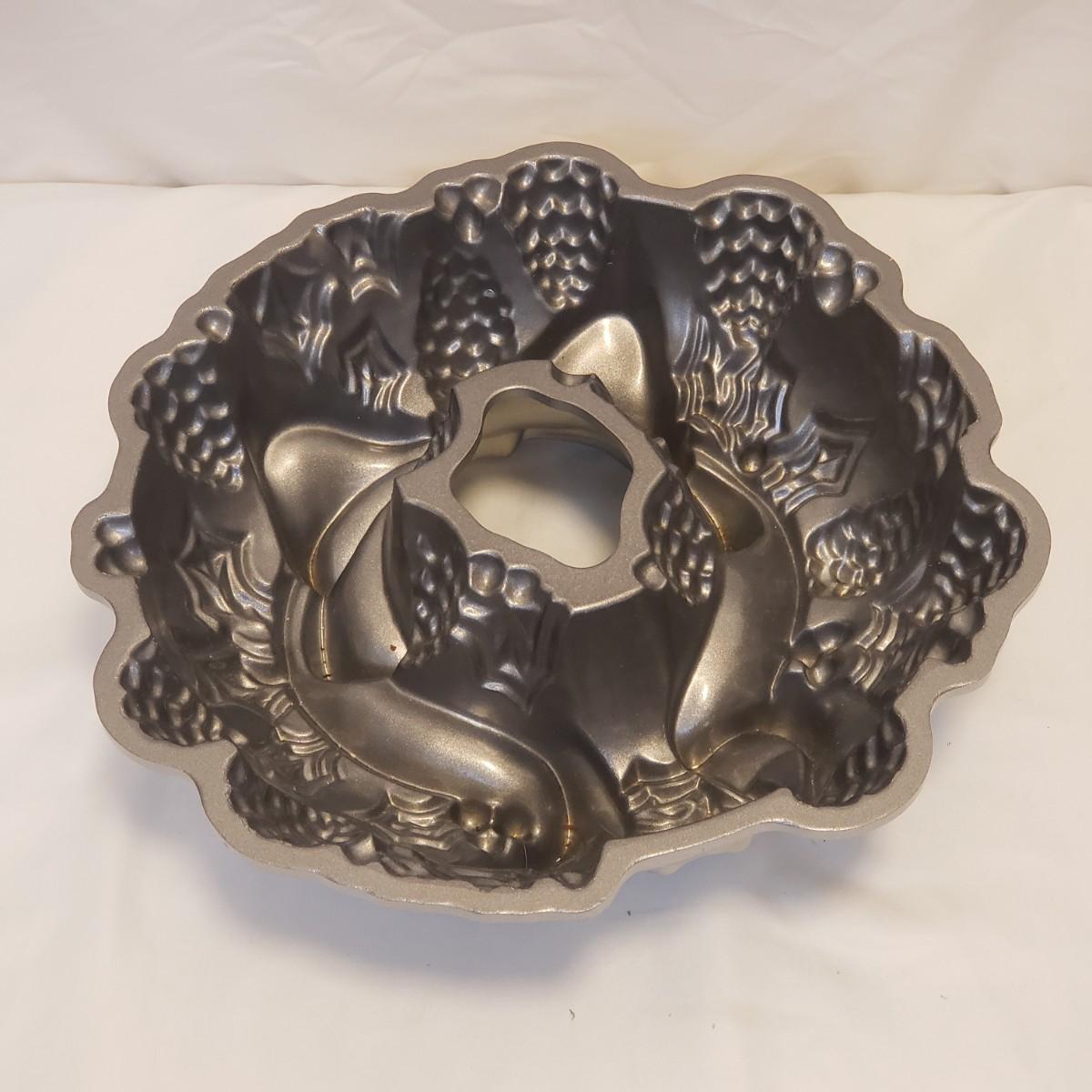 This 9 piece baking lot contains 4 bundt pans from Nordic Ware, two 10 cup Christmas themed pans and two 3 inch pans with 6 cakes in each. The 6 cake pans have ware on them, see pictures for details. The oldest pan also has ware, as seen in the pictures.