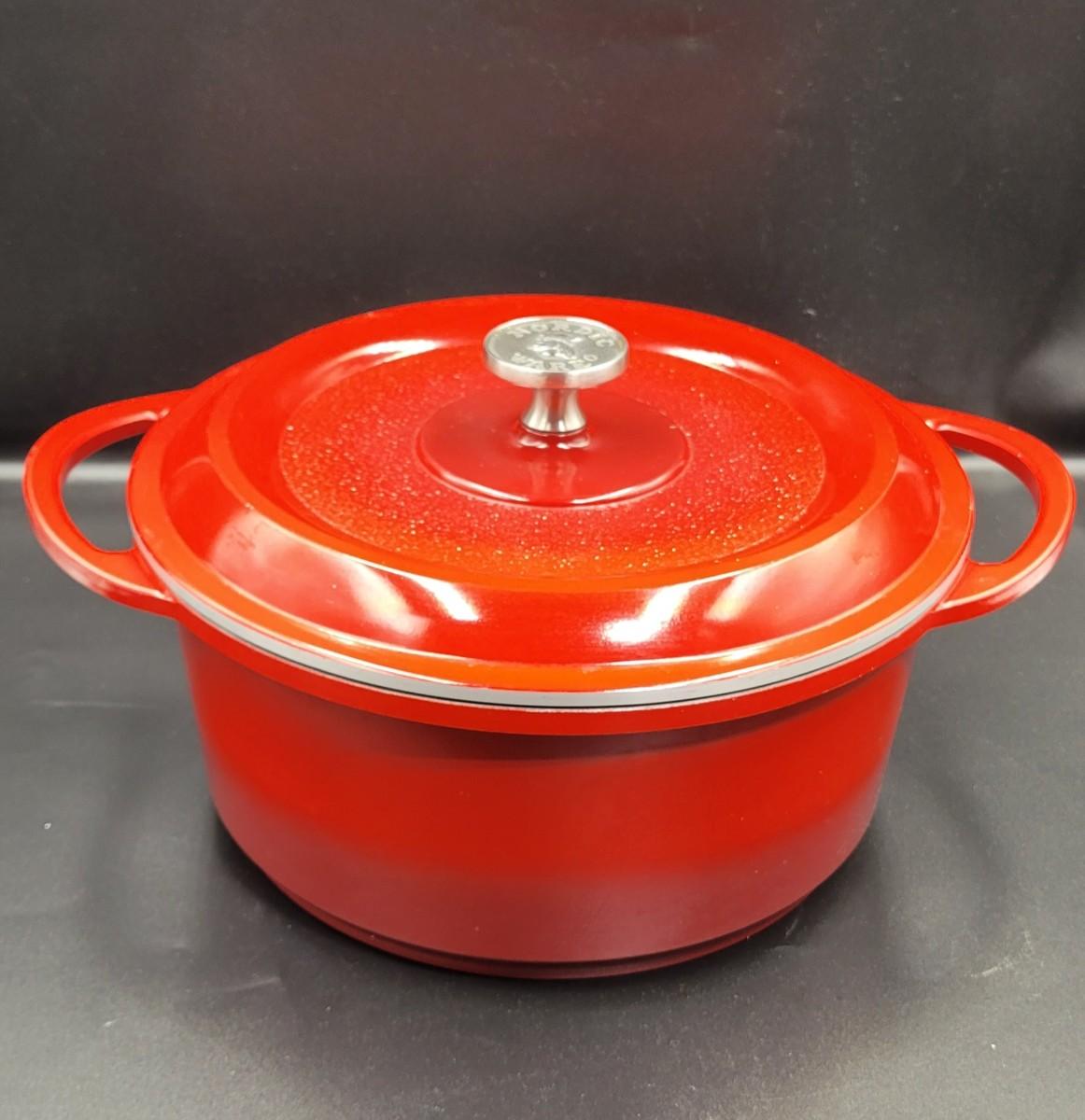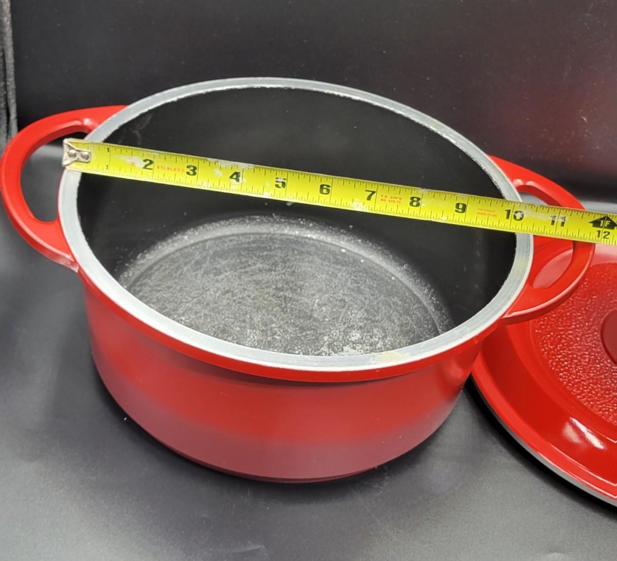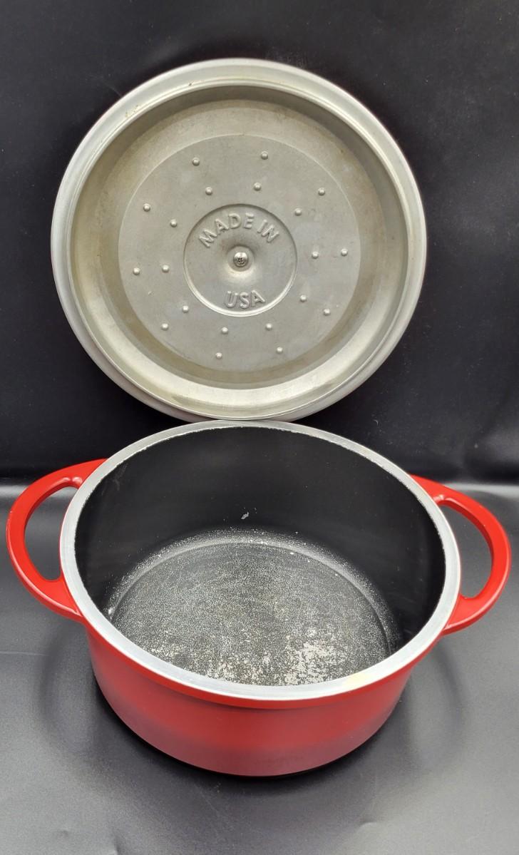 Enameled cast aluminum. Some wear for usage seen inside. In great condition