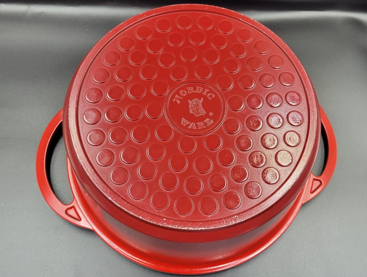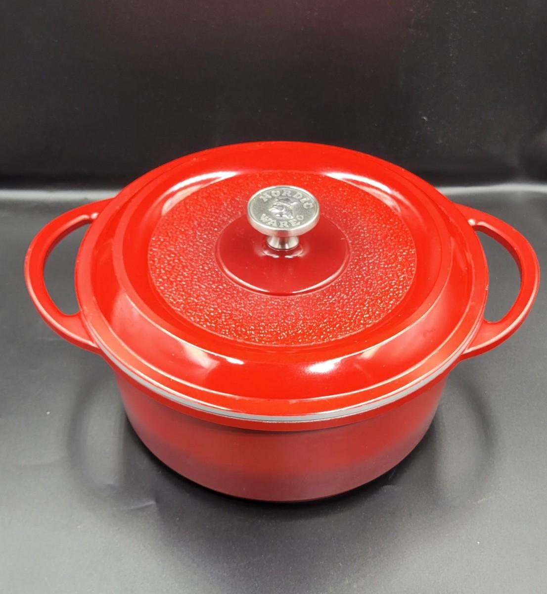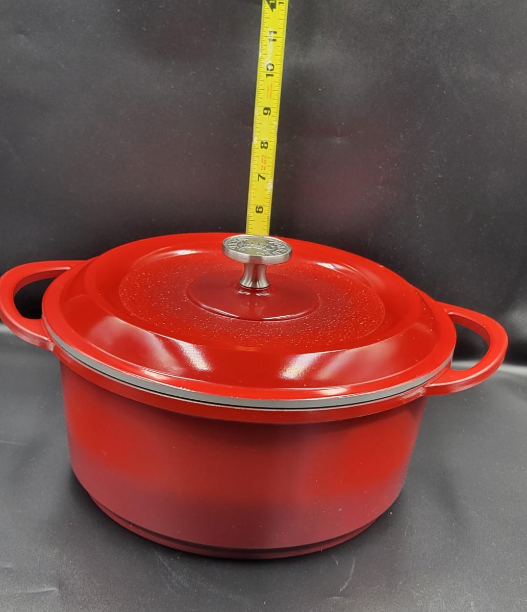 Enameled cast aluminum. Some wear for usage seen inside. In great condition