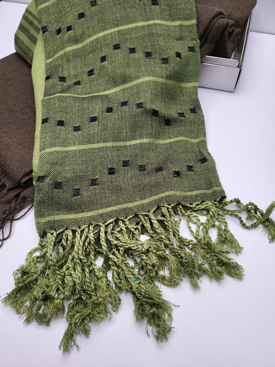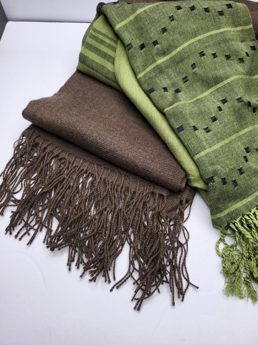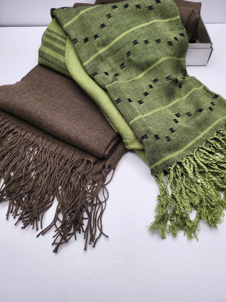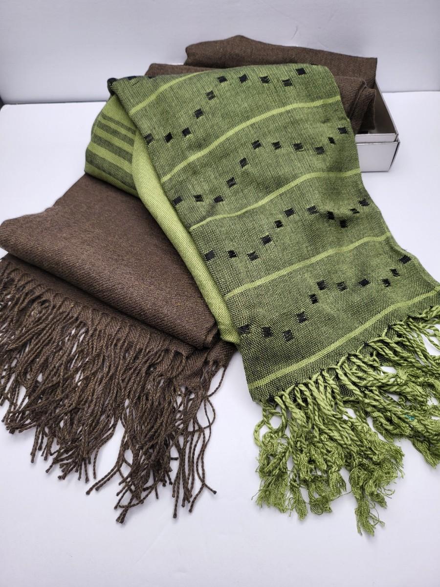 Two high quality, long shoulder/neck wrap scarves. Chocolate brown with fringe is Nordstrom brand and comes with gift box. Measures 80" long x 28" wide. The second one is a luxurious, soft green pattern scarf with fringe. Feels like a blend of cashmere & silk. No tag. Measures 64" long x 25" wide.