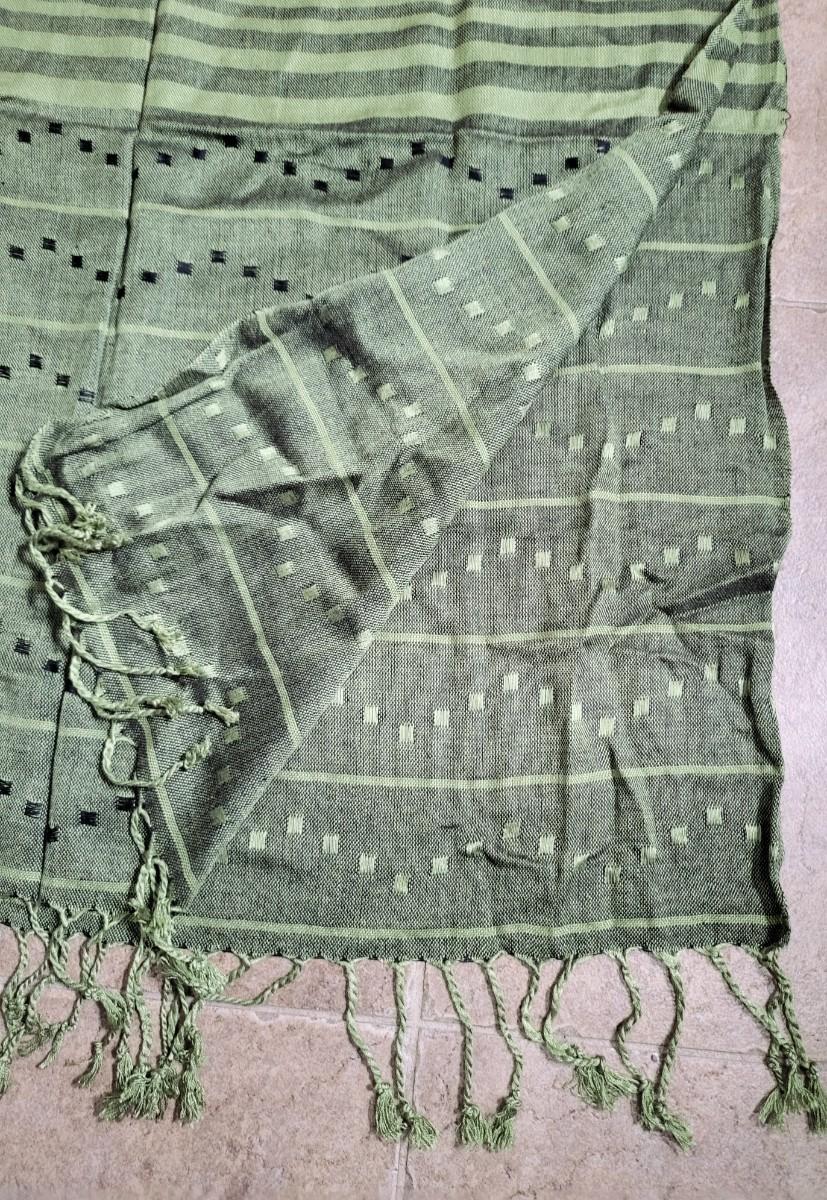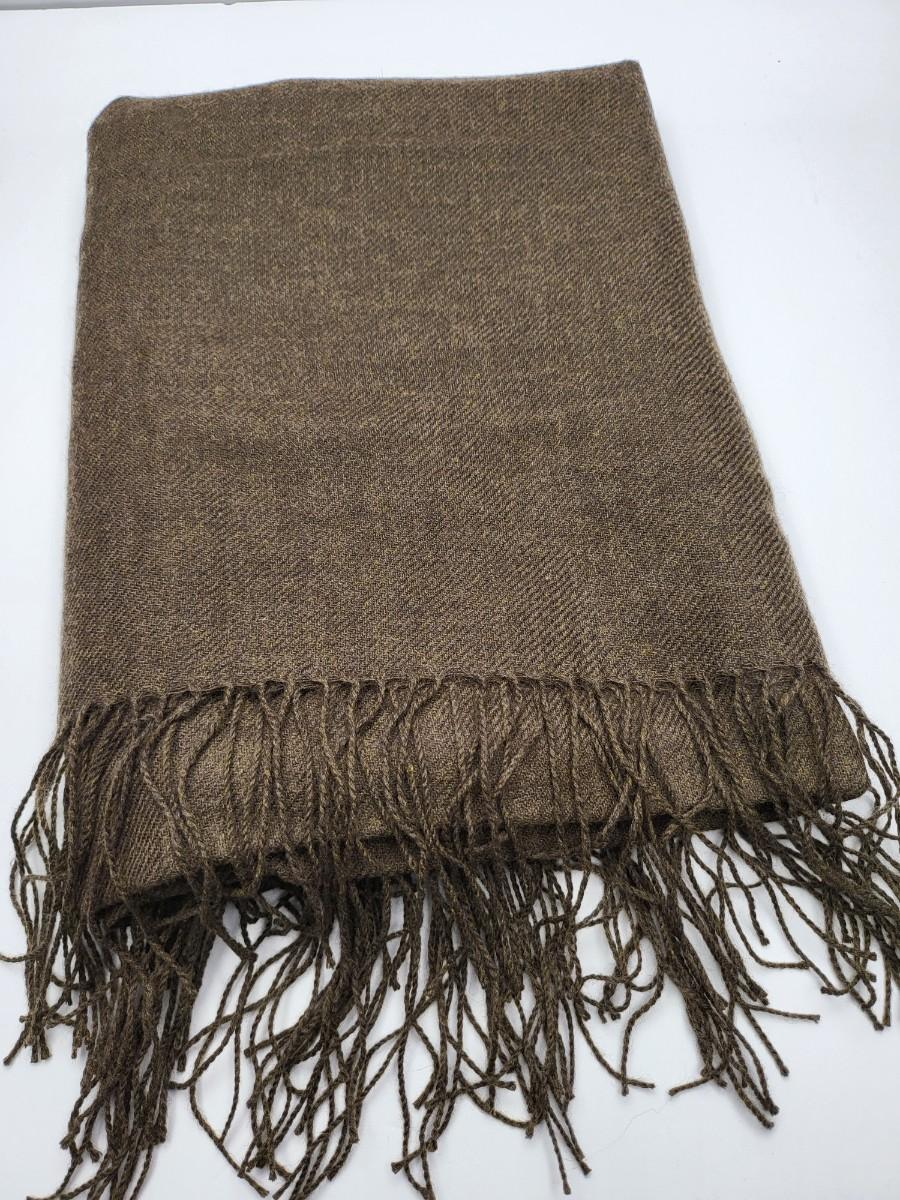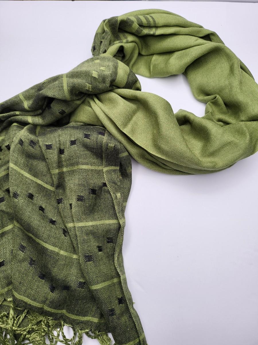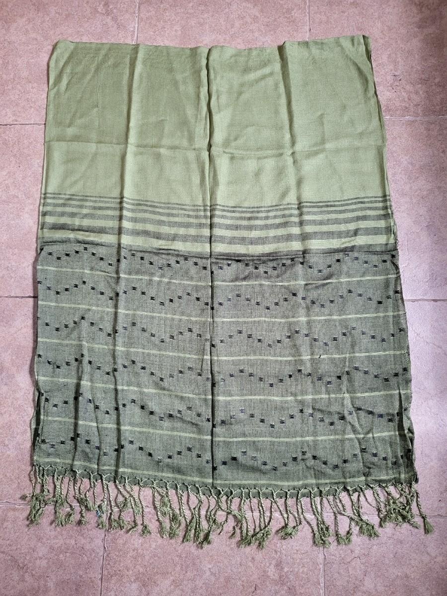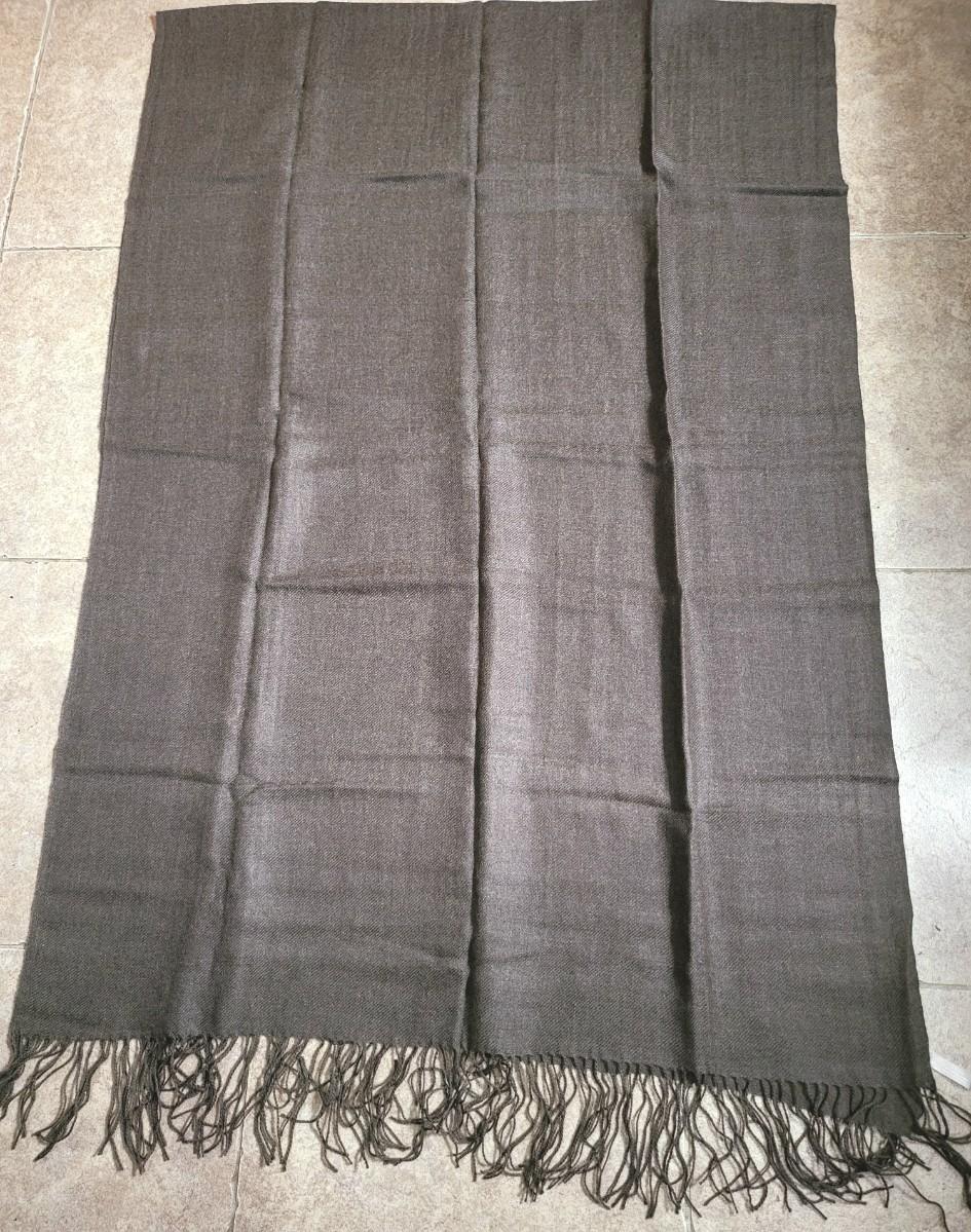 Two high quality, long shoulder/neck wrap scarves. Chocolate brown with fringe is Nordstrom brand and comes with gift box. Measures 80" long x 28" wide. The second one is a luxurious, soft green pattern scarf with fringe. Feels like a blend of cashmere & silk. No tag. Measures 64" long x 25" wide.