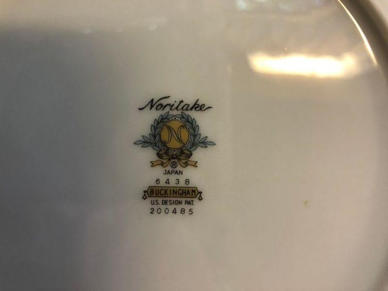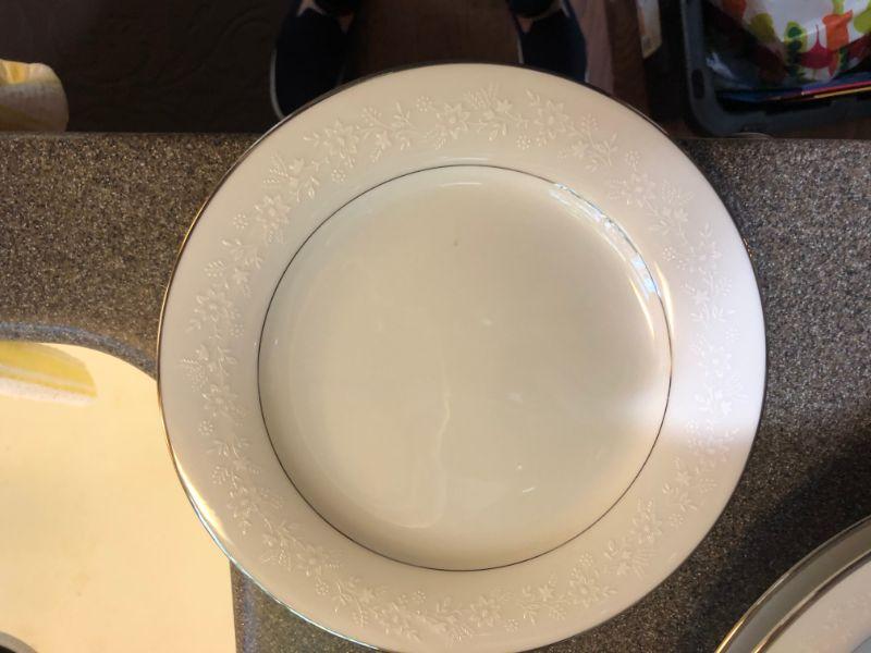 This is the Buckingham Platinum classic. Price includes 10 dinner plates, 6 salad plates, 7 butter plates 7 teacups, 11 saucers, 2 small dip bowls, 2 large oval serving pieces, 1 vegetable serving bowl and a sugar and creamer (missing the lids)..