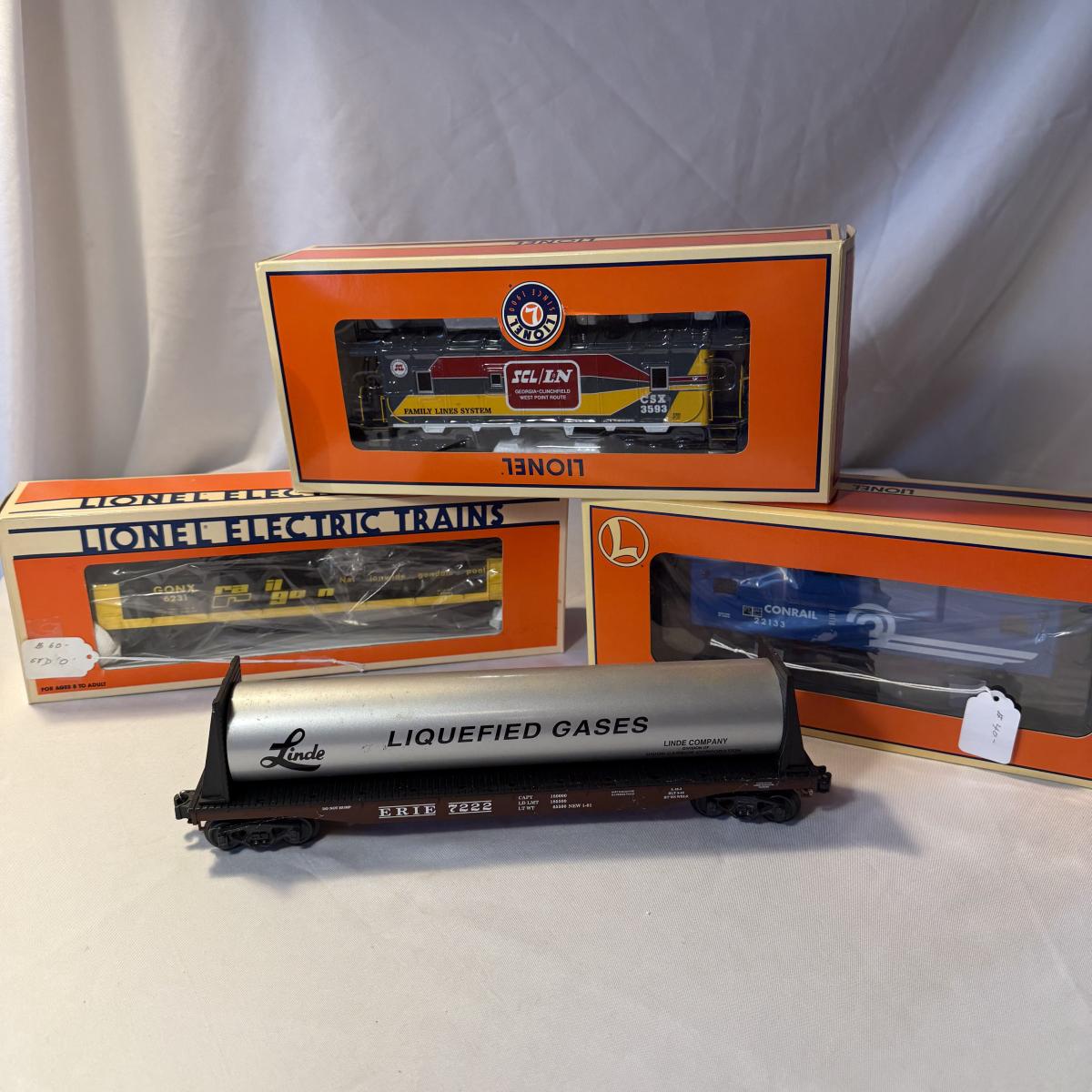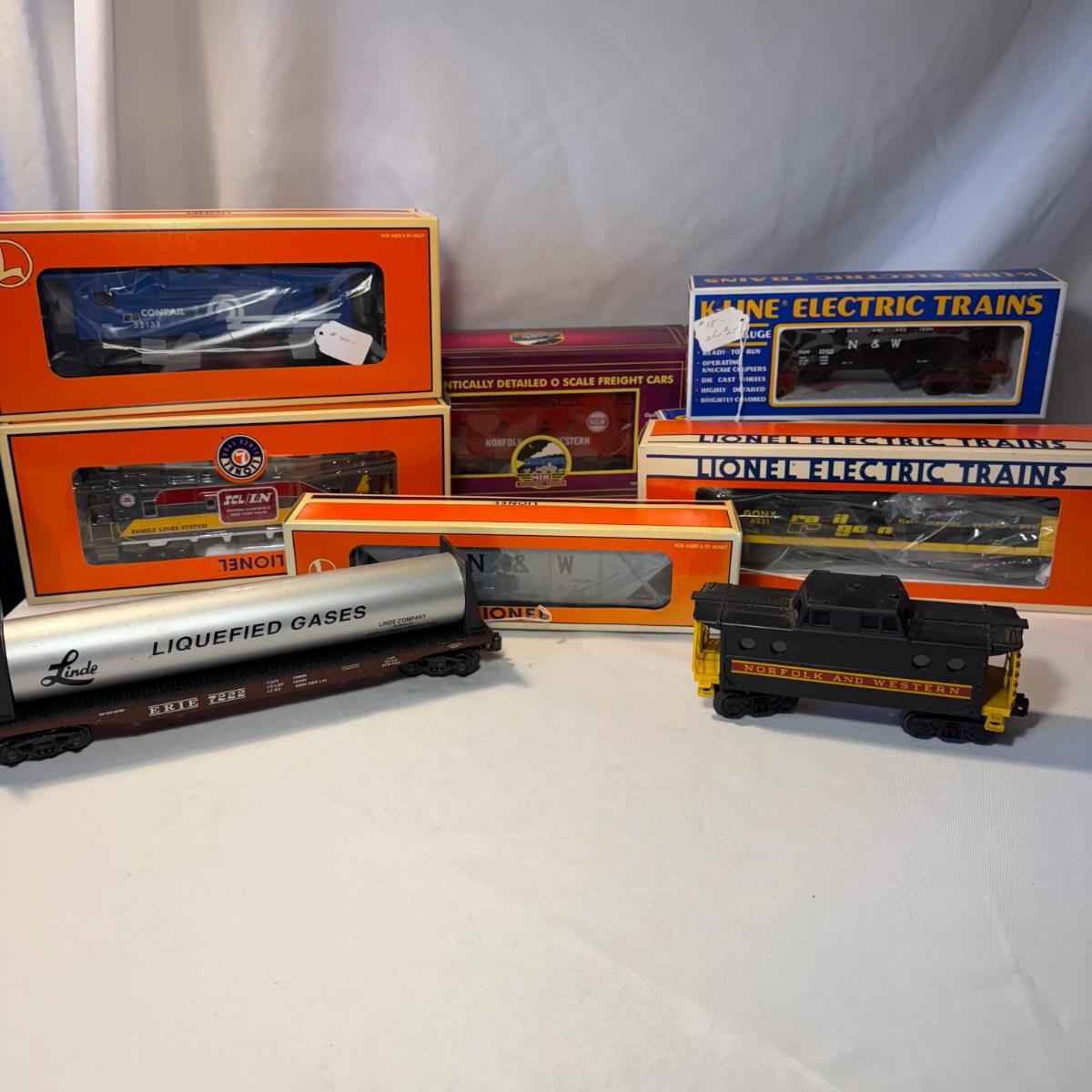 This lot contains a total of nine O-Gauge cars, most are Norfolk and Western and come with their original box. See photos for full inventory. Shipping available. Please note that any price tag seen on an item was not put there by Sterling Transitions and does not reflect the current value of the item.