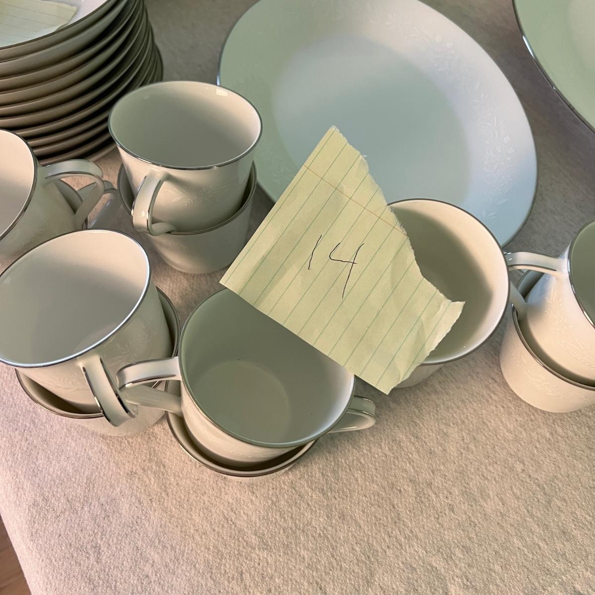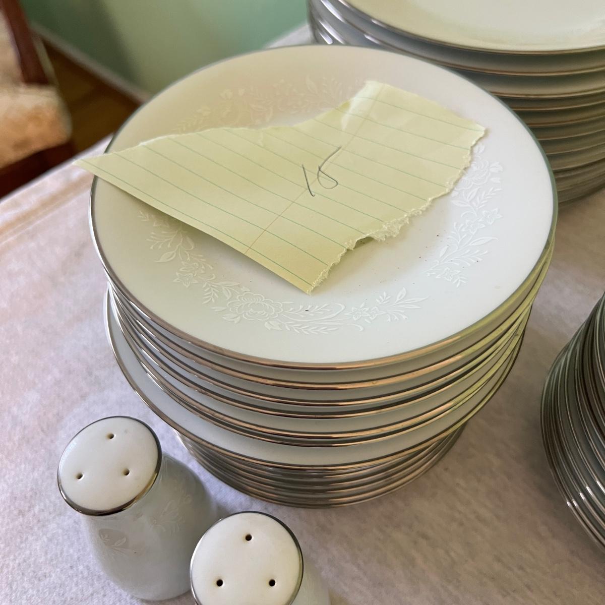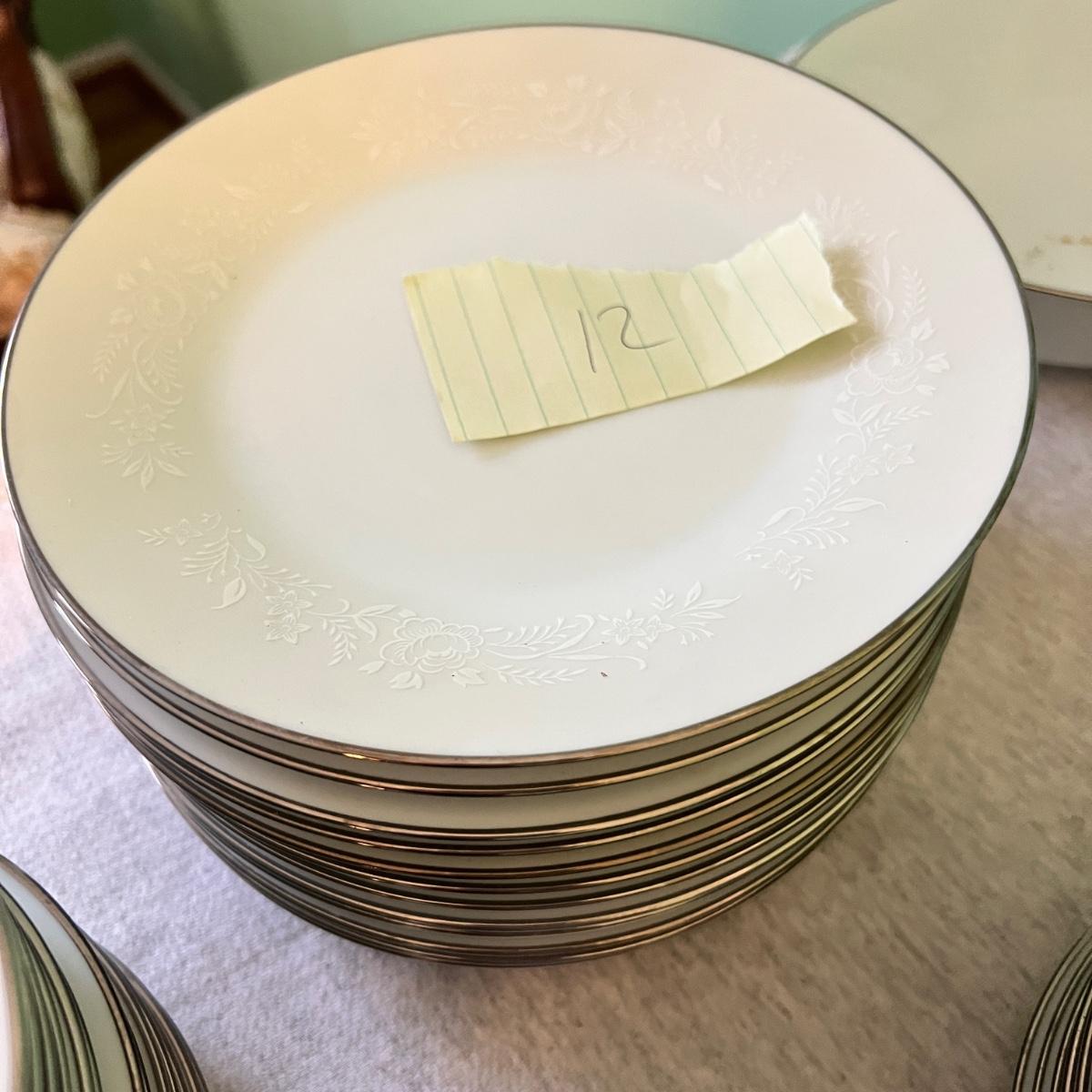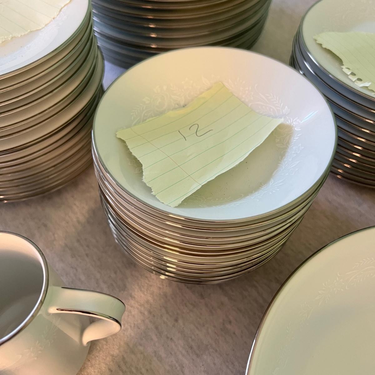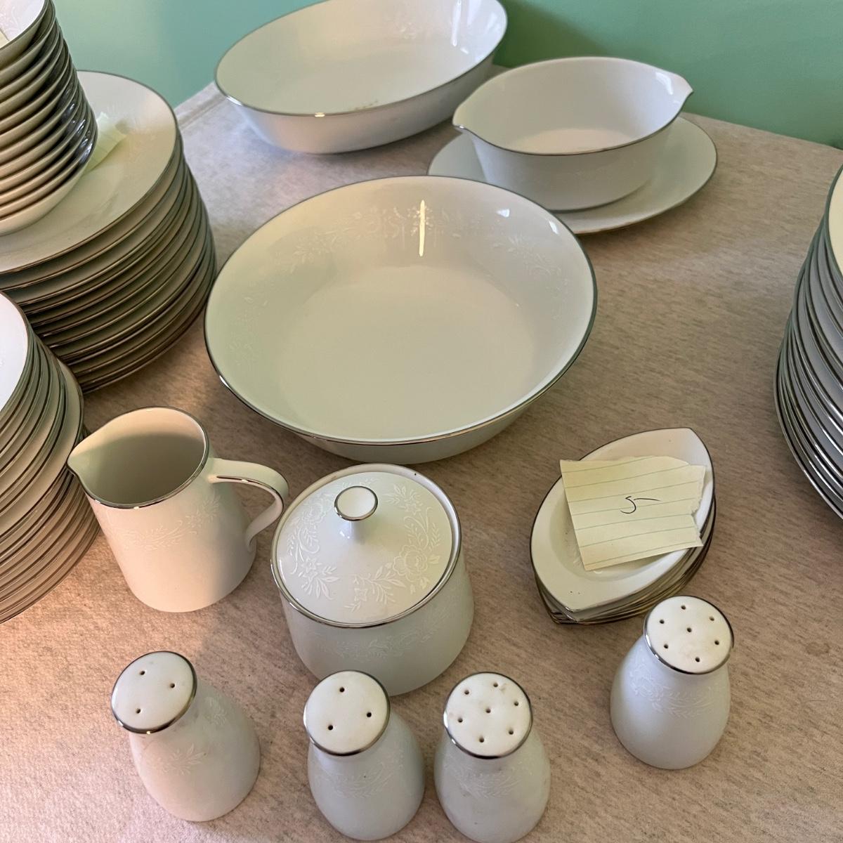 White Floral Design with Platinum Trim. 102 pieces. Set includes 14 tea cup plates, 14 tea cups, 5 small tea bag plates, 12 small bowls, 12 salad plates, 12 dinner plates, 12 bread plates, 11 soup bowls, 2 salt shakers, 2 pepper shakers, 1 creamer, 1 sugar, 1 gravy boat, 2 serving plates, 2 serving bowls. NOTE: PICK UP ONLY IN DUNKIRK MD.