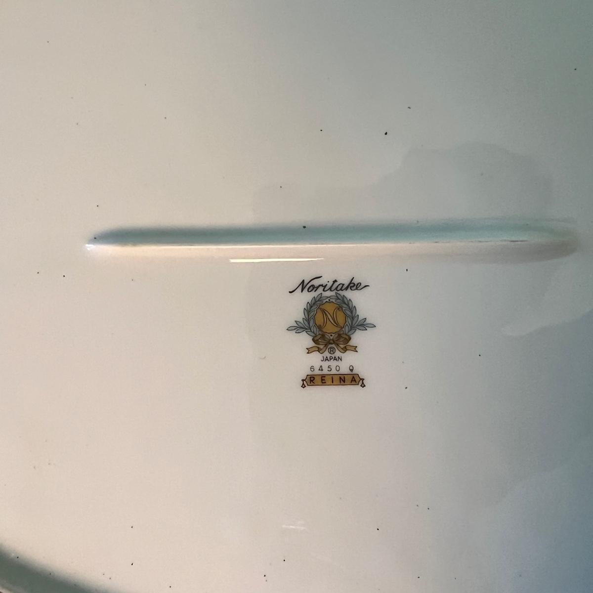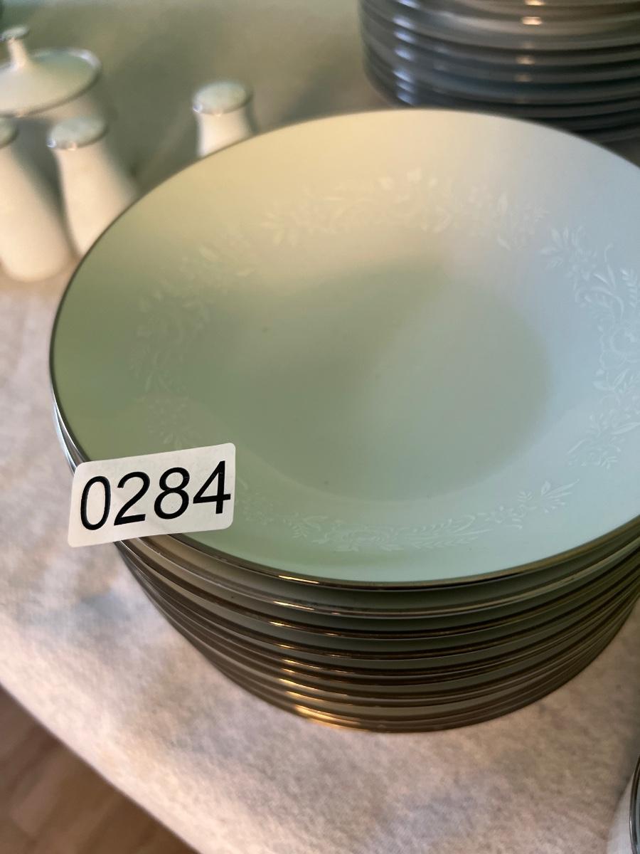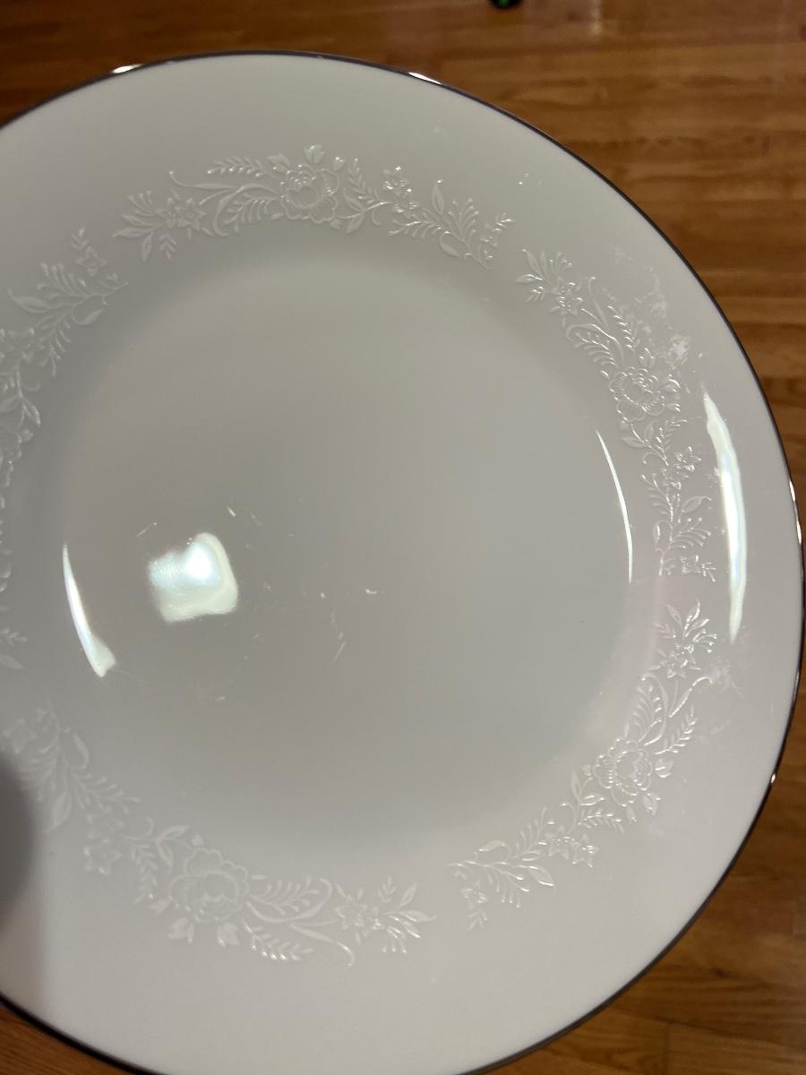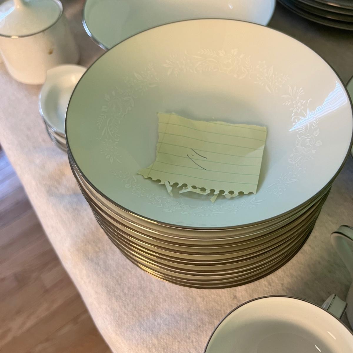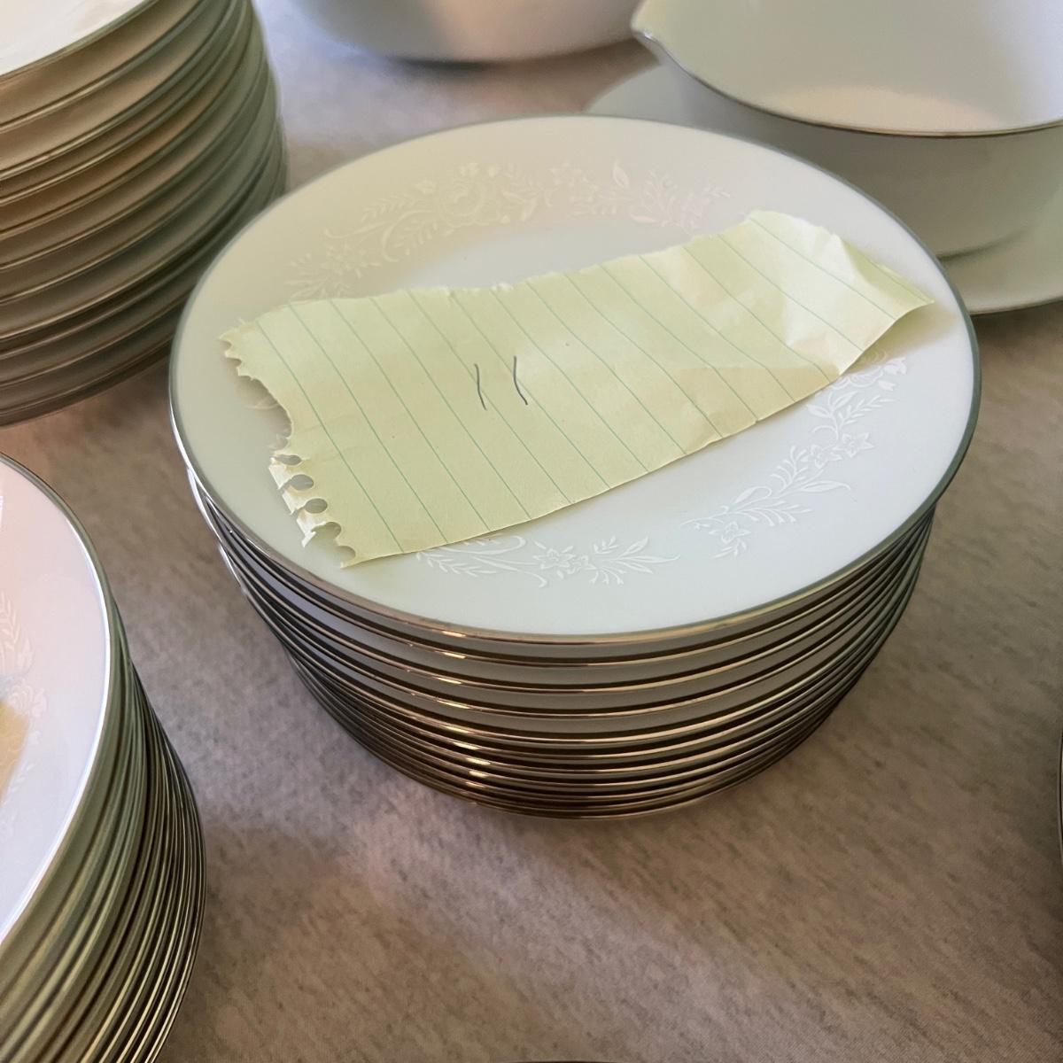 White Floral Design with Platinum Trim. 102 pieces. Set includes 14 tea cup plates, 14 tea cups, 5 small tea bag plates, 12 small bowls, 12 salad plates, 12 dinner plates, 12 bread plates, 11 soup bowls, 2 salt shakers, 2 pepper shakers, 1 creamer, 1 sugar, 1 gravy boat, 2 serving plates, 2 serving bowls. NOTE: PICK UP ONLY IN DUNKIRK MD.