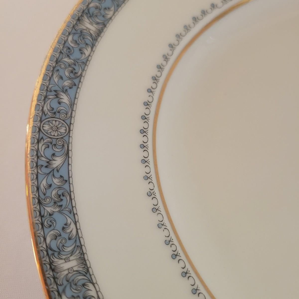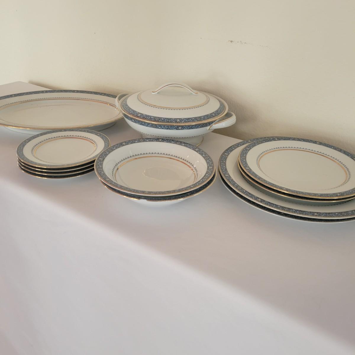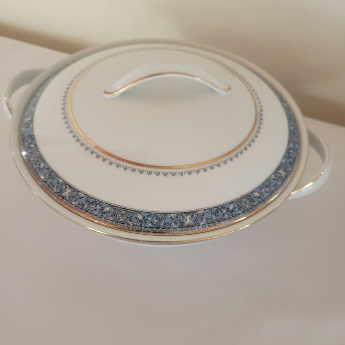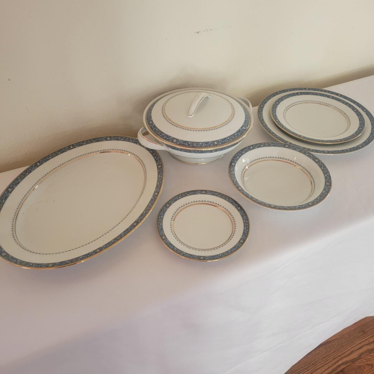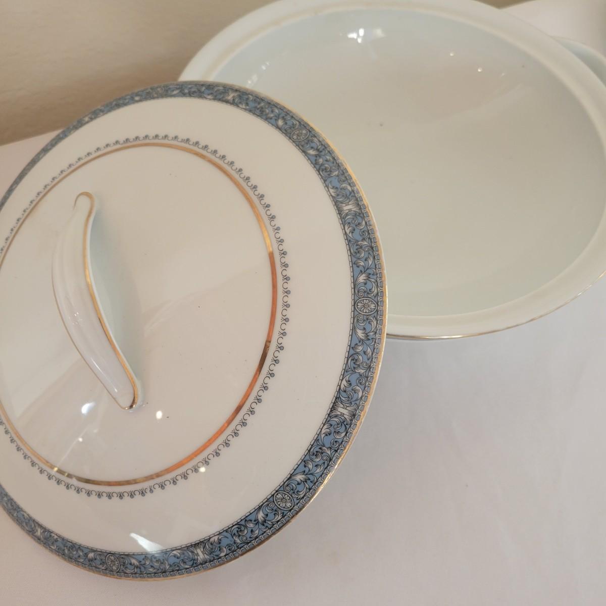Noritake China in good condition that has one bowl with a chip in it. This china set is manufactured by Noritake and is harcourt pattern that is a blue scroll with gold accents. Included is a large serving dish that measures approximately 13.5" x 10.5" x 1.5". This collection also includes a lidded soup bowl, two dinner plates, two salad plates, two bowls and four bread plates. Shipping available. Shipping can be costly. We suggest calling our local UPS with dimensions and getting an estimate before bidding: (828) 252-6930.