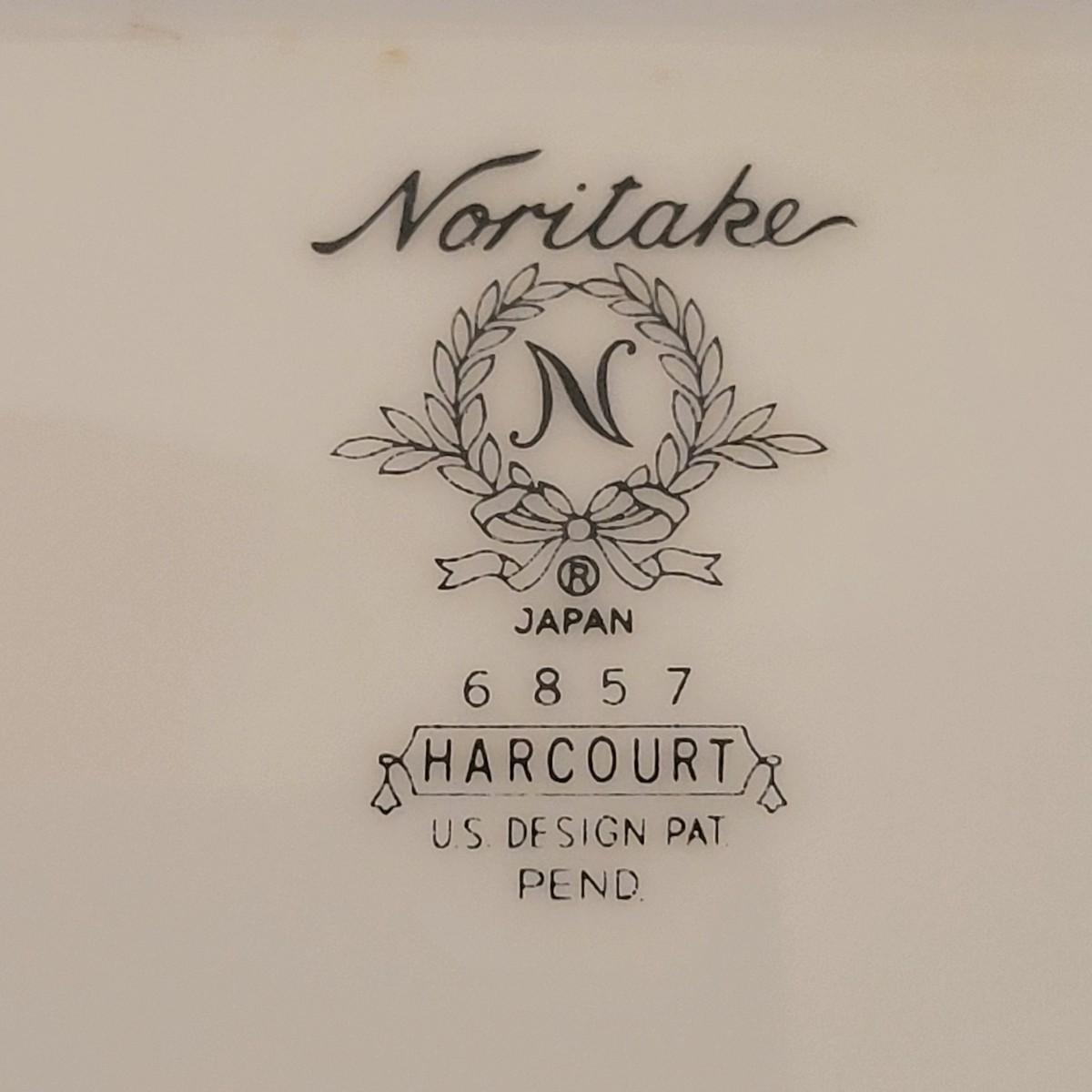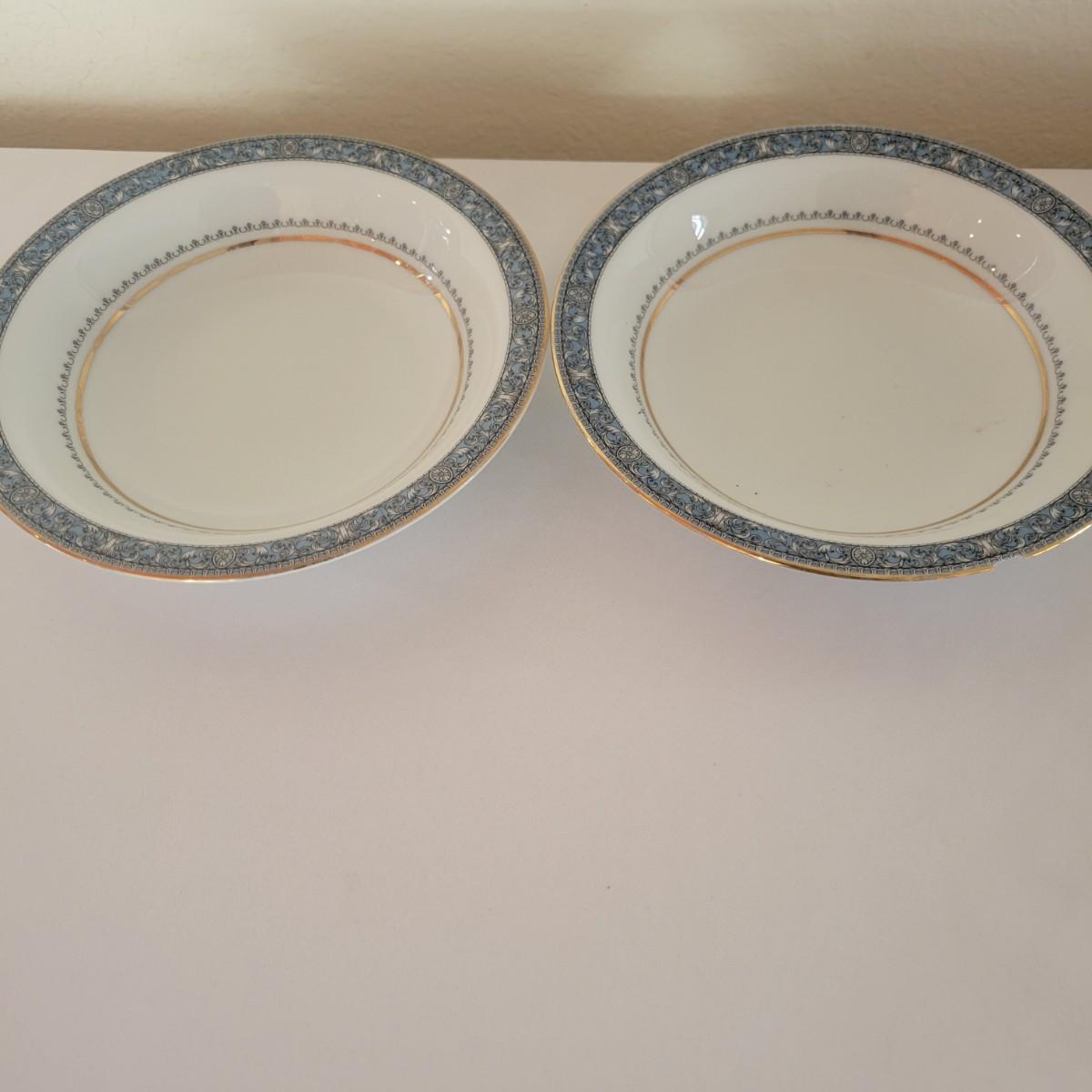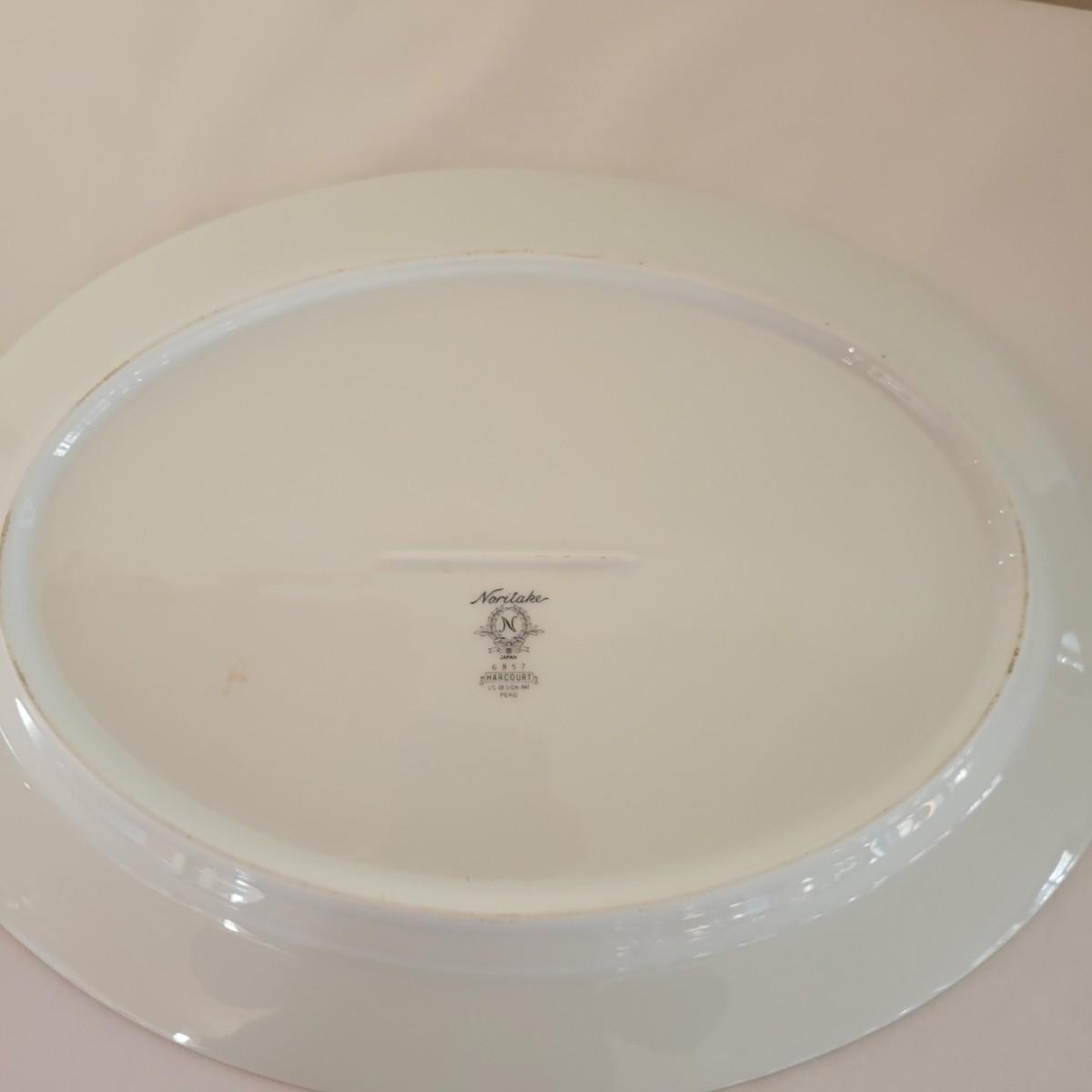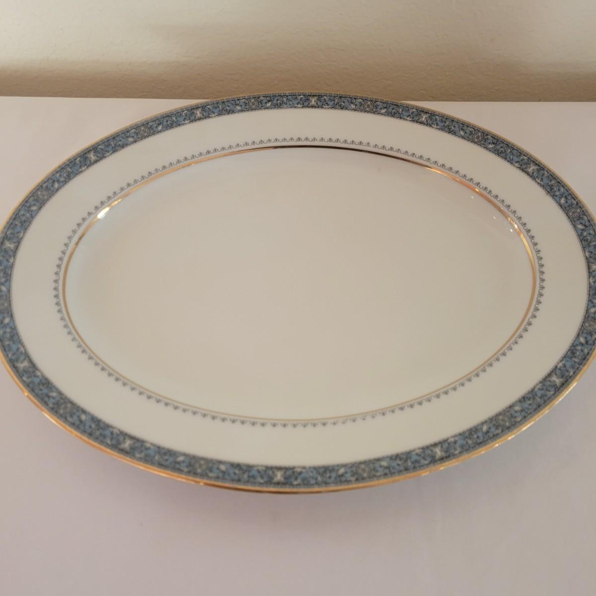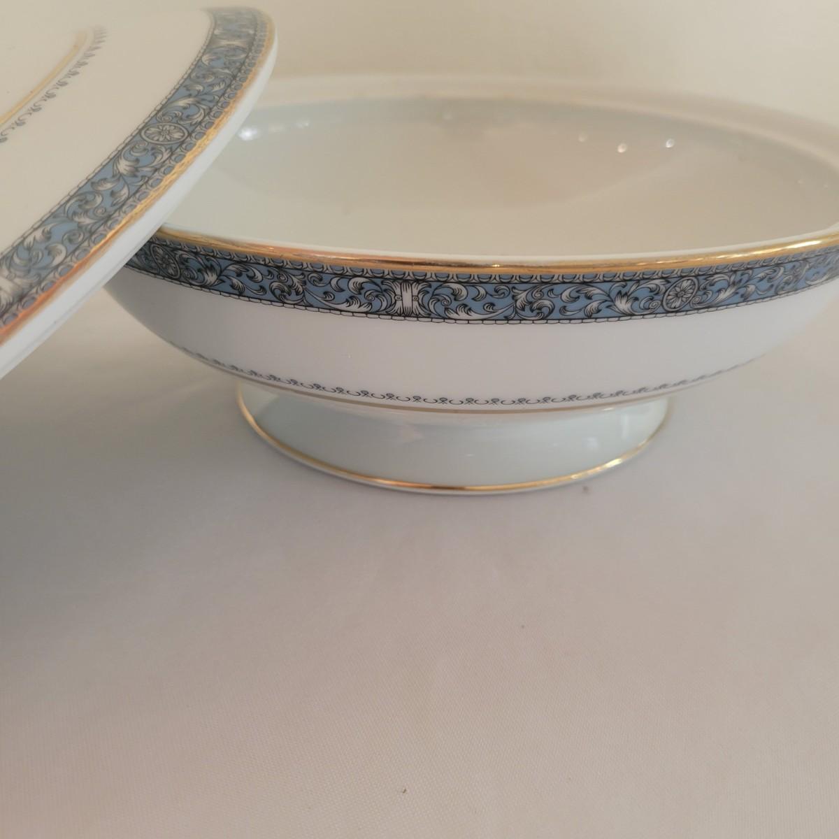 Noritake China in good condition that has one bowl with a chip in it. This china set is manufactured by Noritake and is harcourt pattern that is a blue scroll with gold accents. Included is a large serving dish that measures approximately 13.5" x 10.5" x 1.5". This collection also includes a lidded soup bowl, two dinner plates, two salad plates, two bowls and four bread plates. Shipping available. Shipping can be costly. We suggest calling our local UPS with dimensions and getting an estimate before bidding: (828) 252-6930.