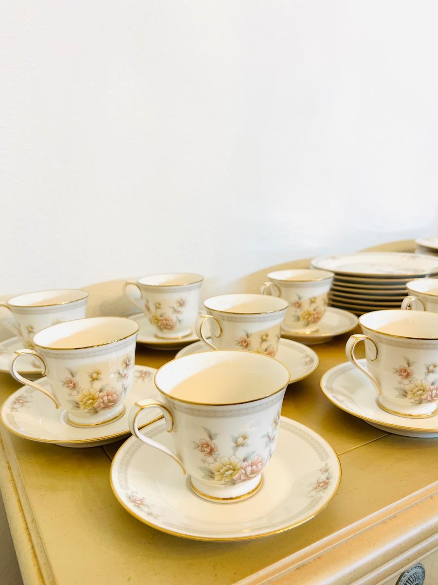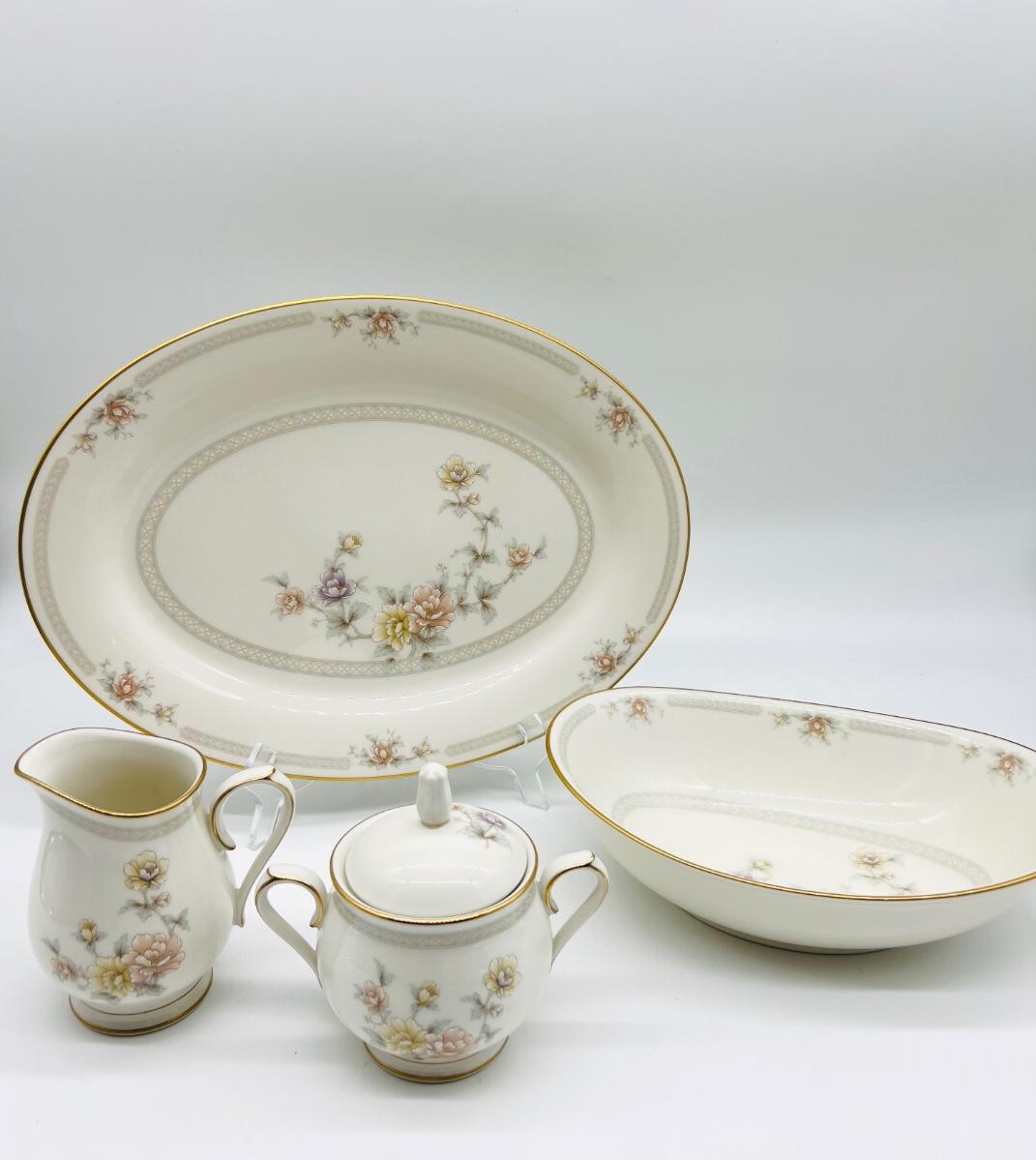 NORITAKE CHINA set. CERVANTES Ivory China.8 dinner plates 10 1/2", 8 salad plates 8 1/4", 8 bread and butter plates 6 1/2", 1 sugar bowl & lid, 1 creamer,1 oval vegetable bowl 9", oval serving platter 14', 8 footed cup & saucer sets. 36 total pieces.