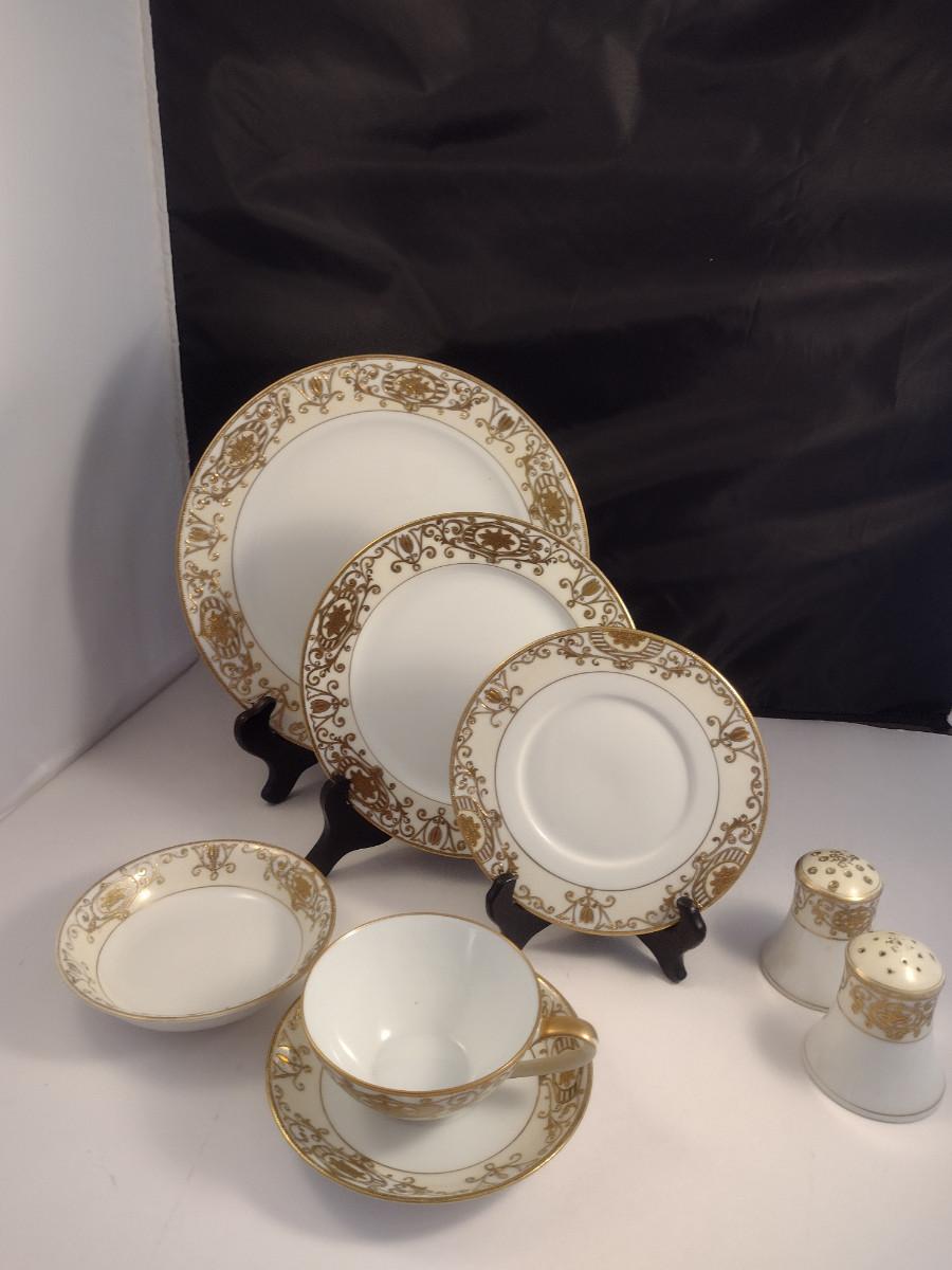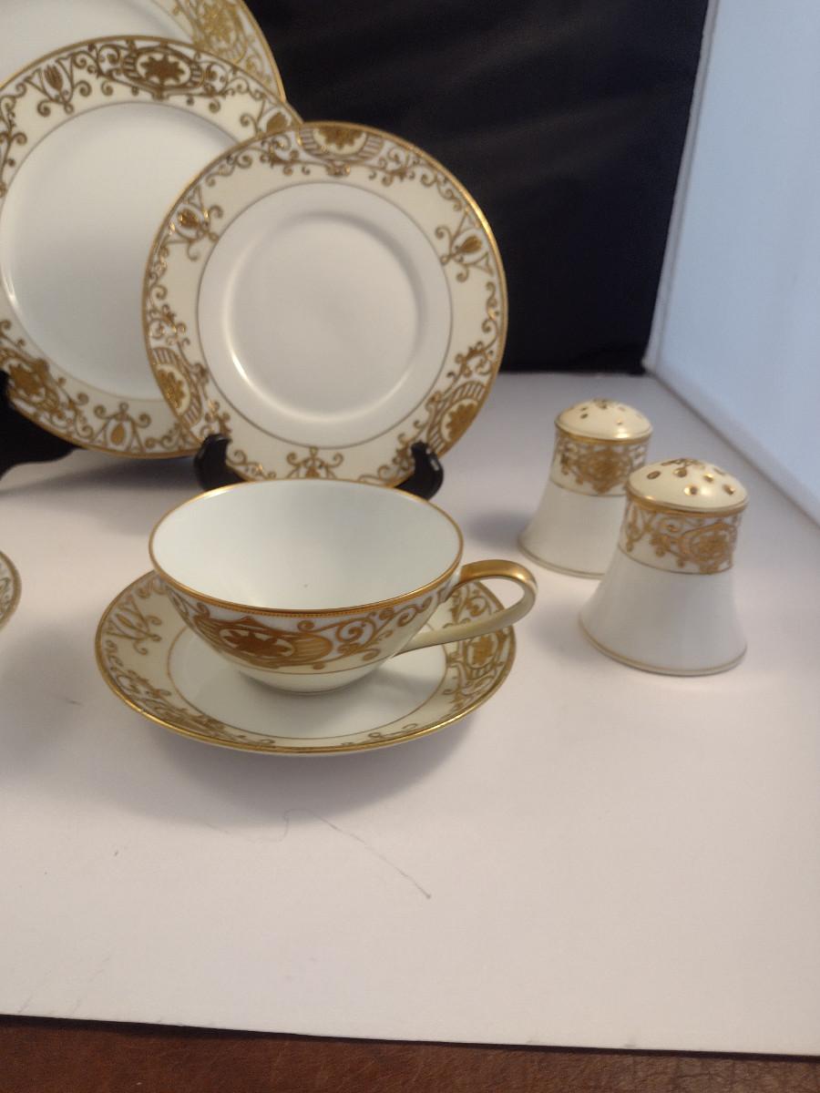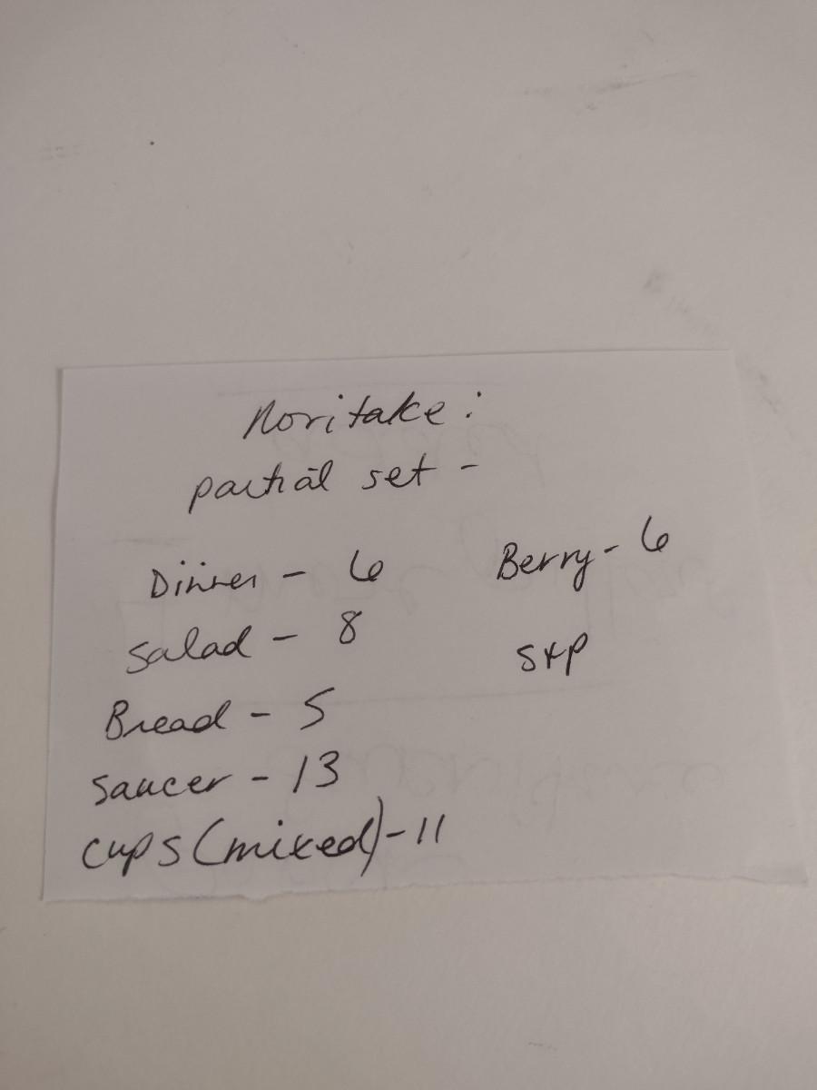 Noritake 'Christmas Ball' (16034) Assorted Dinner Ware- Approx 51 Pieces. Included are: Dinner plate- 6, Salad plate- 8, Bread/Dessert plate- 5, Berry bowl- 6, Saucer- 13, Cup (Mixed, some gold stamp, some green stamp)- 11, Salt and Pepper shakers.