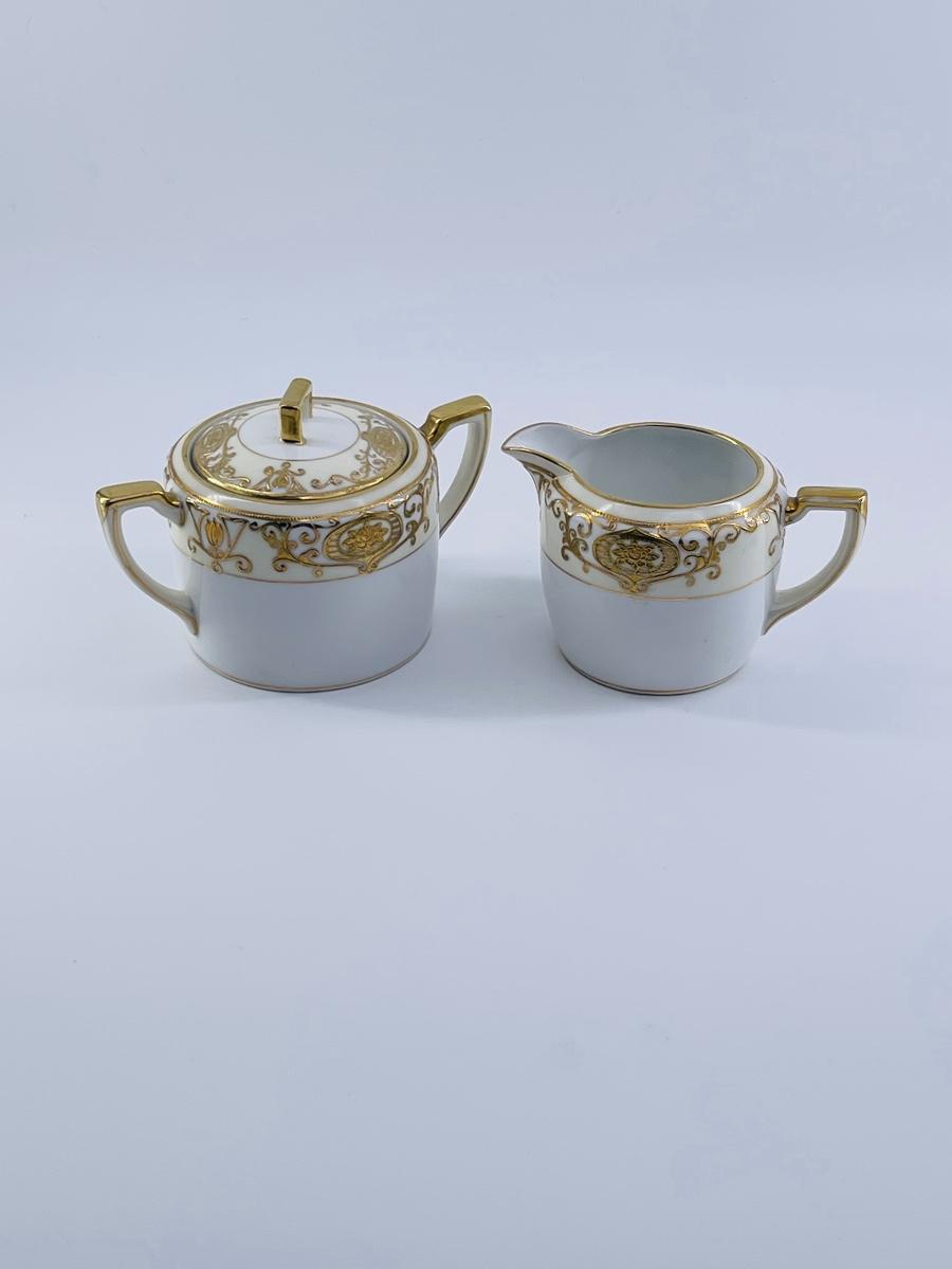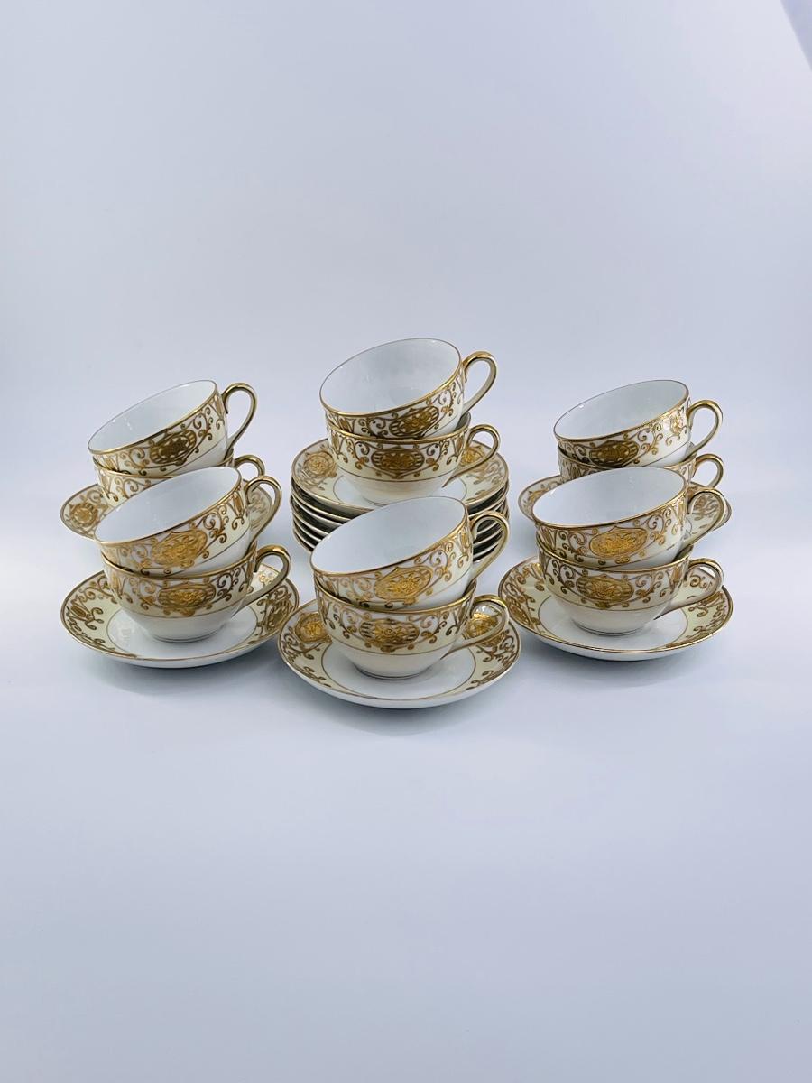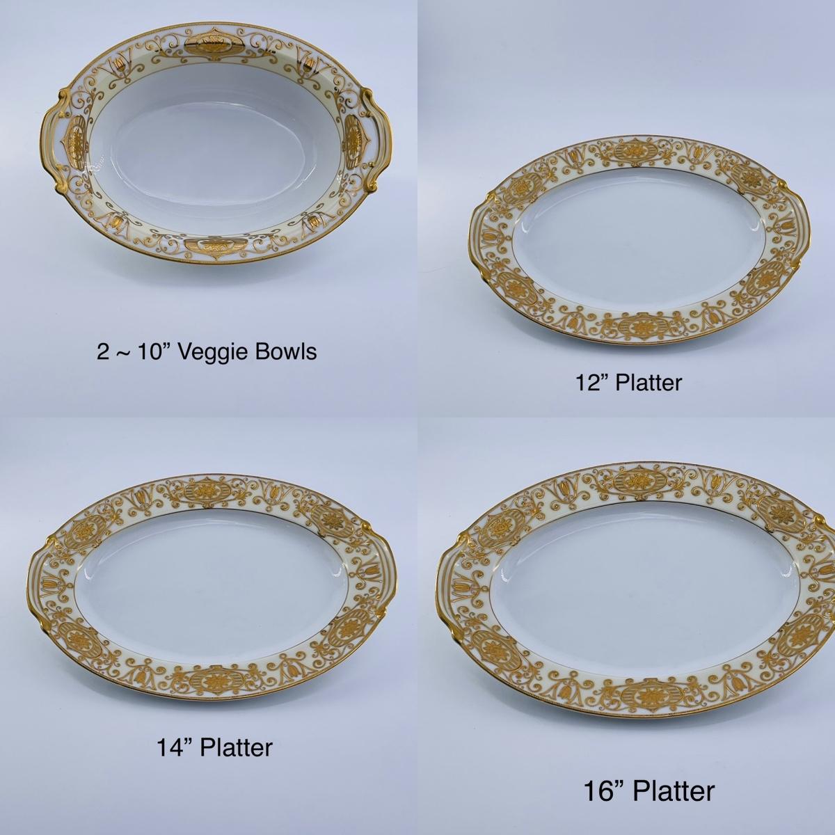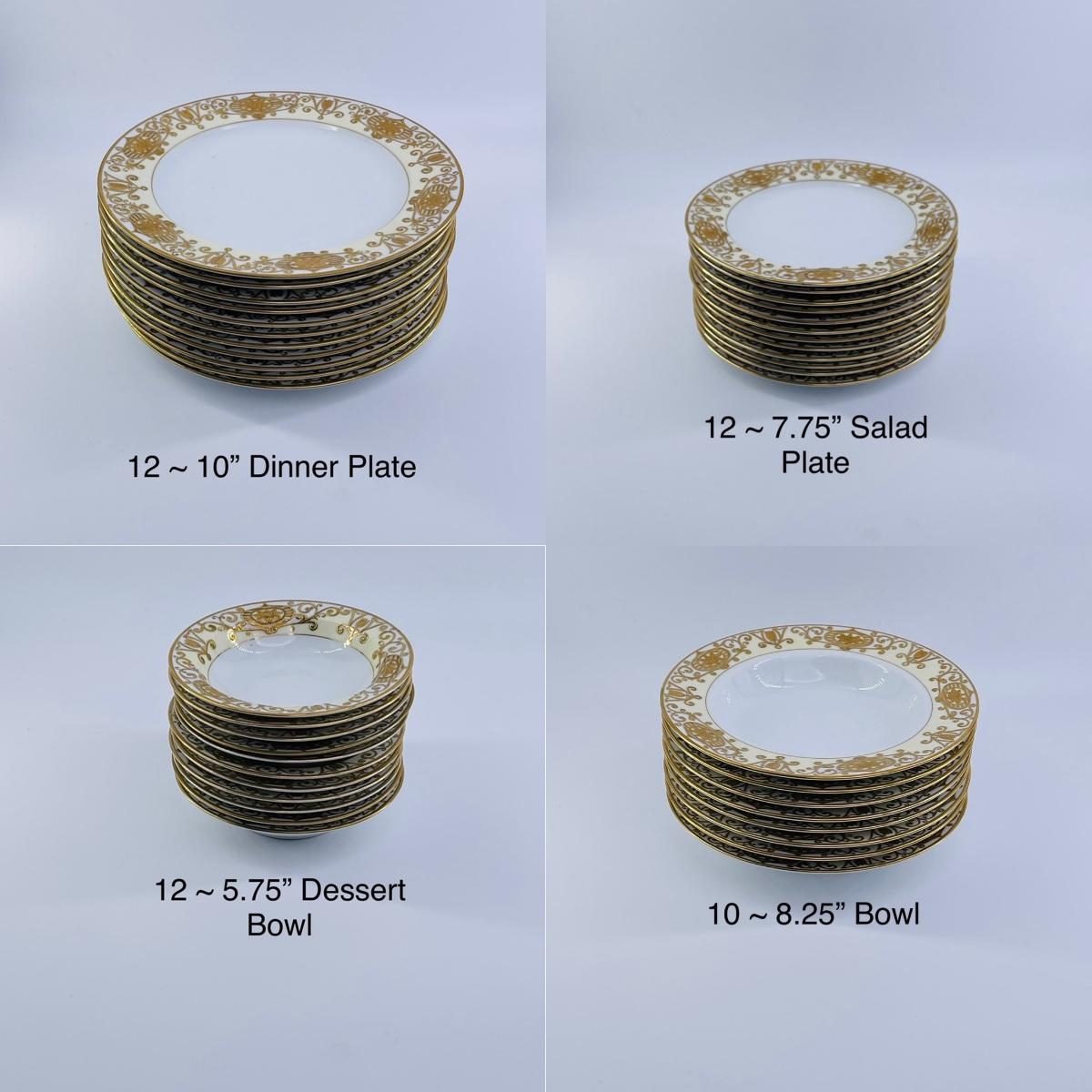 Gold Embossed ~ 6 Piece Place Setting with a Service for 12, however, there are 2 missing Soup Bowls.