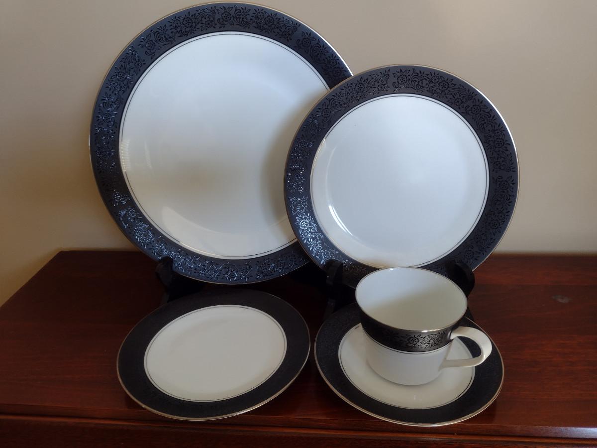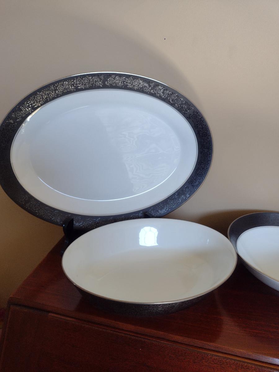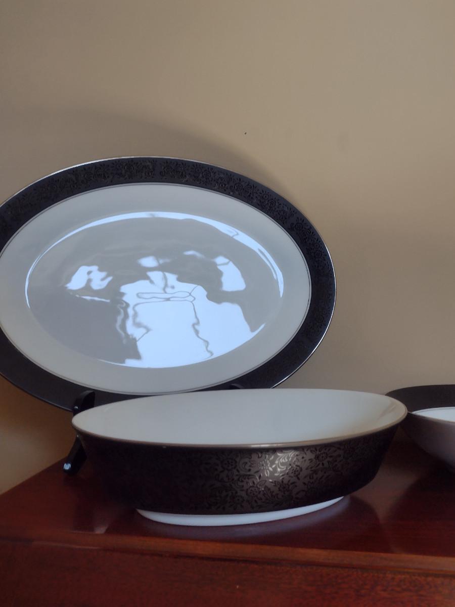 Noritake Dinnerware Set- Mirano Pattern- Approx 38 Pieces. Includes dinner plate, salad plate, cup, and saucer- 8 of each. Also, platter (14")- 1, oval vegetable bowl (9 1/2")- 1, round vegetable bowl (8 3/8")- 1, covered vegetable bowl (8 1/4")- 1, creamer and sugar. All are used, but appear to be in good condition.