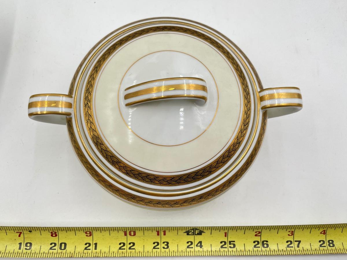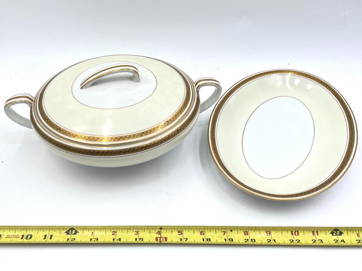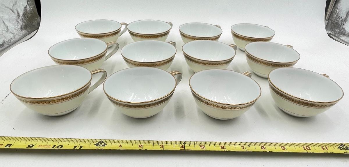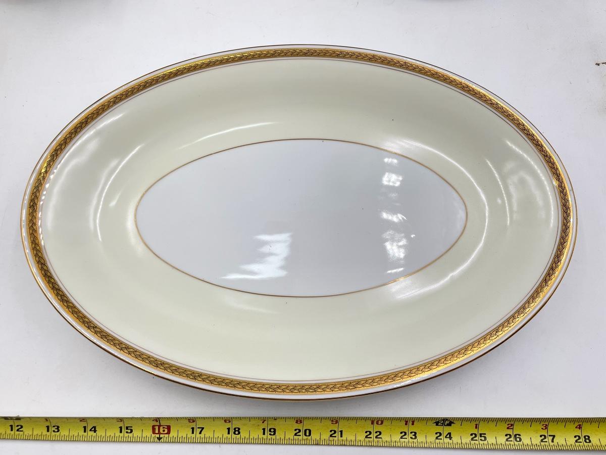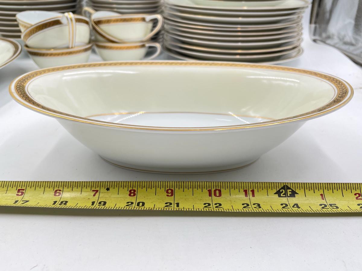 Includes (1) gravy boat with attached underplate; (1) lidded sugar dish; (1) creamer dish; (1) small oval bowl; (2) platters; (11) small bowls; (11) dinner plates; (11) salad plates; (12) small dessert plates; (12) medium bowls; (12) saucers; (12) teacups; (1) large lidded dish.