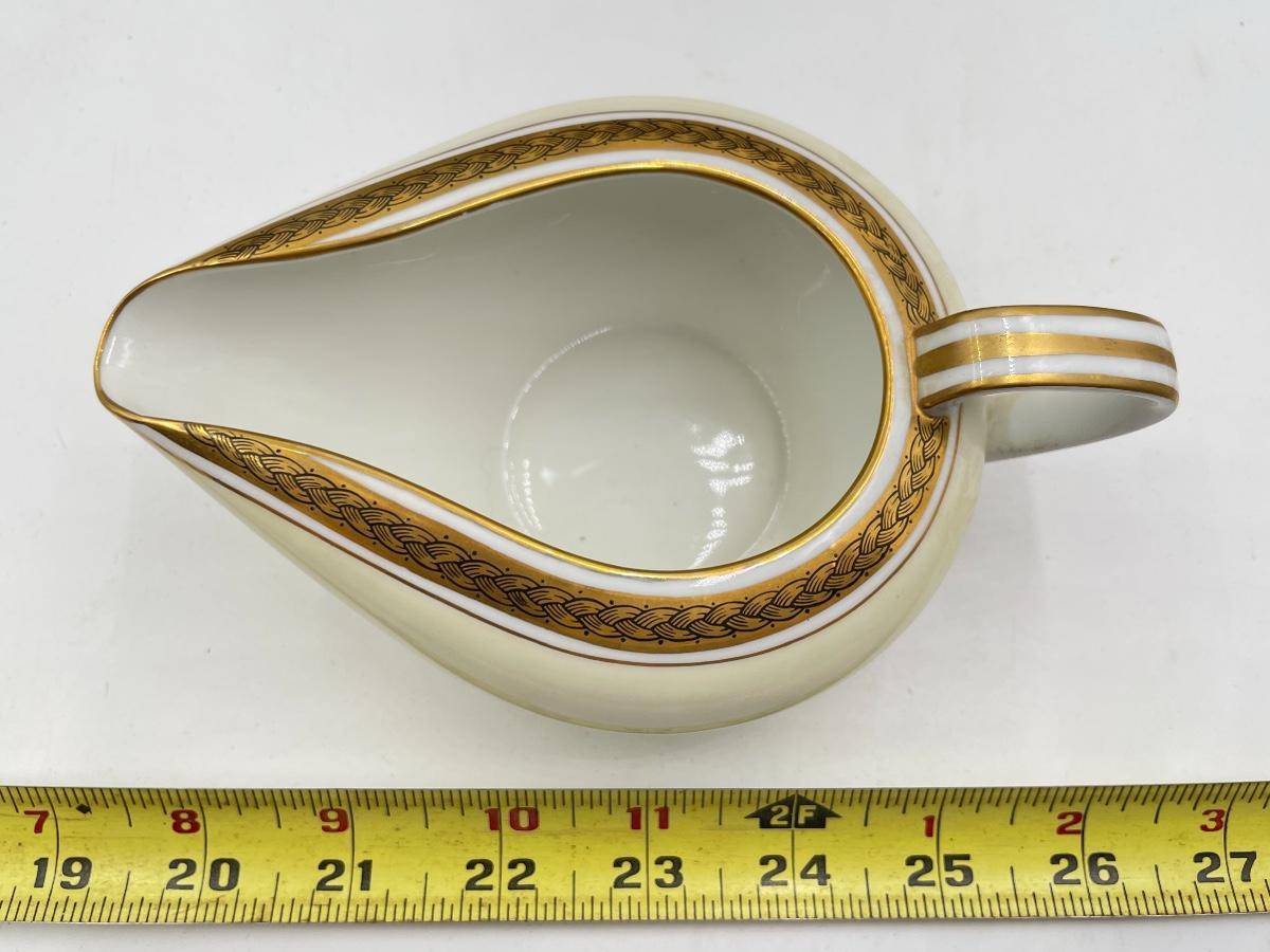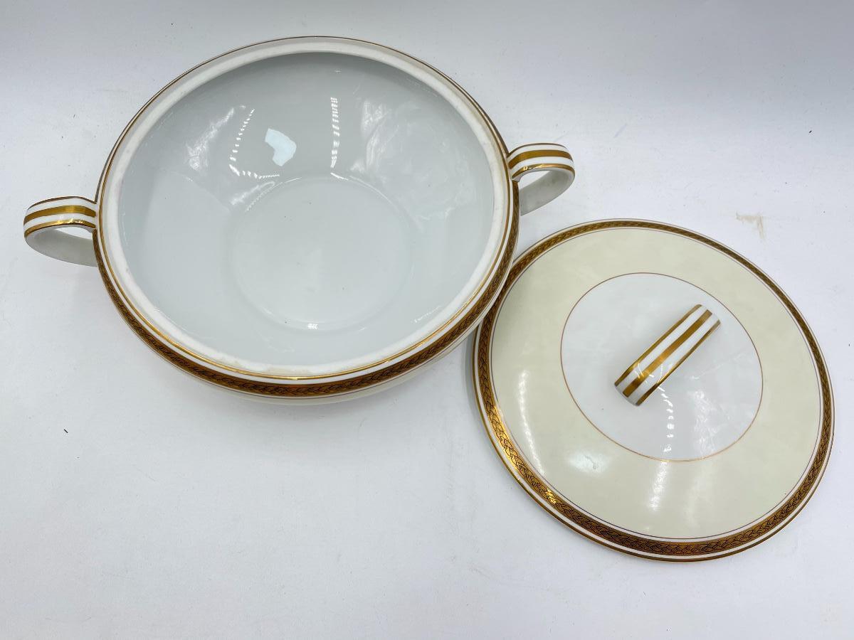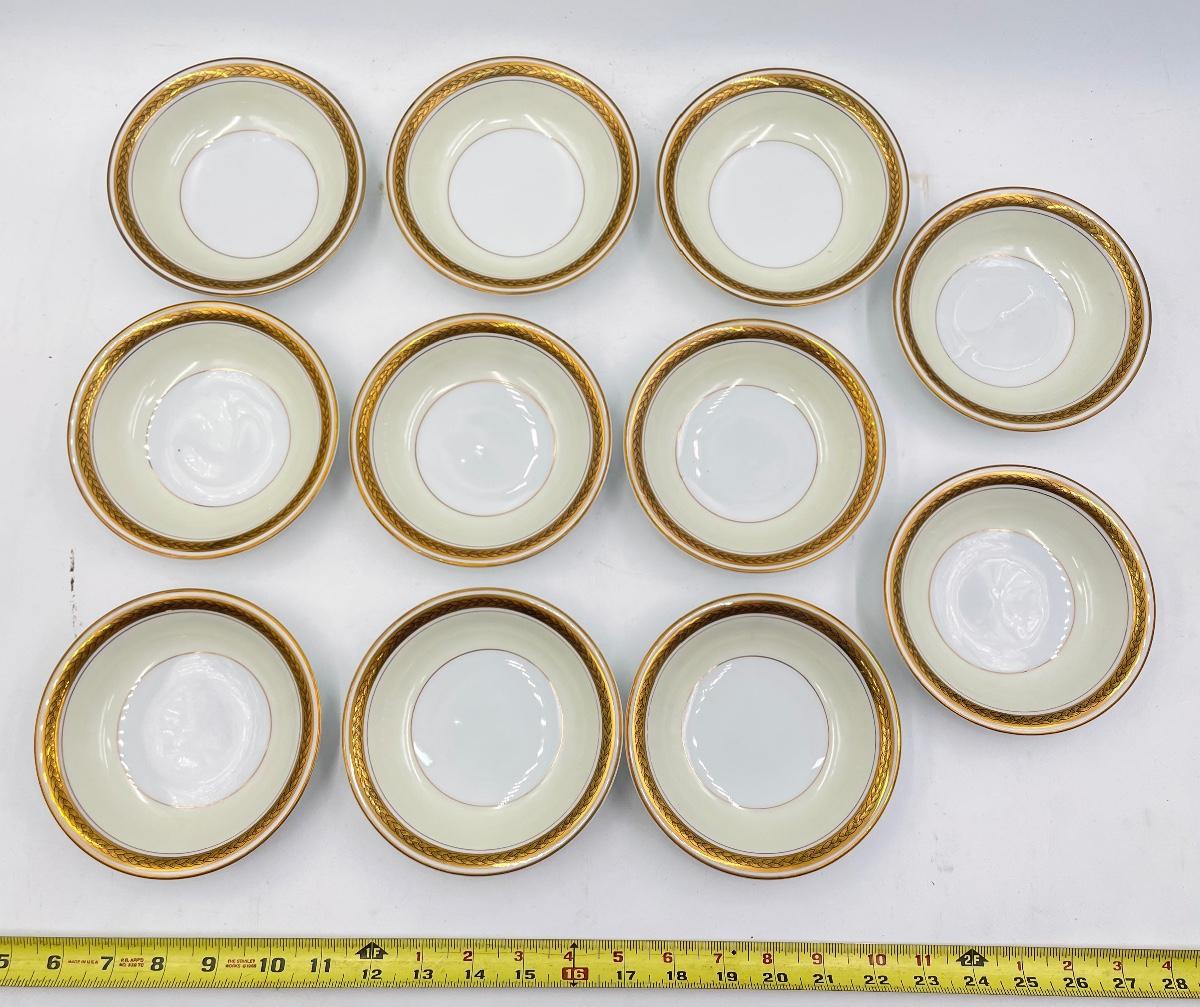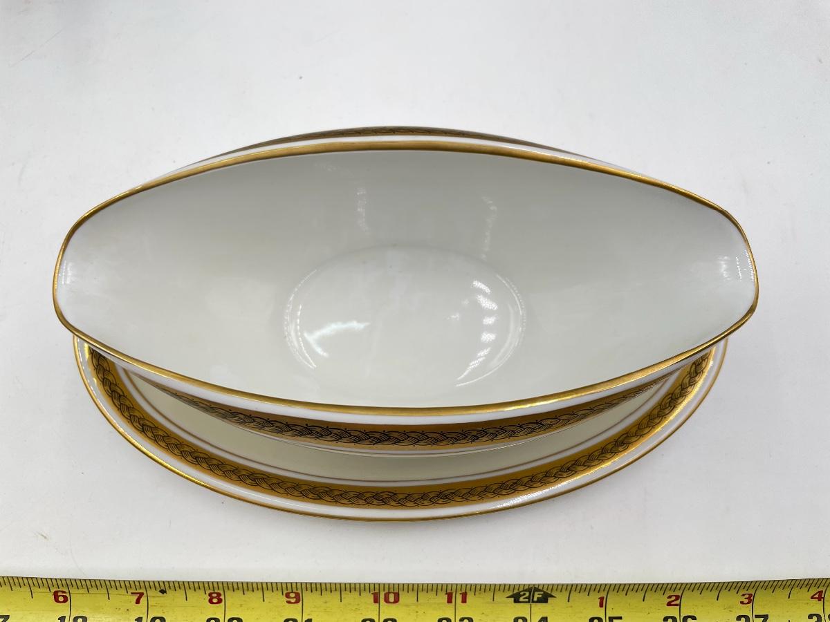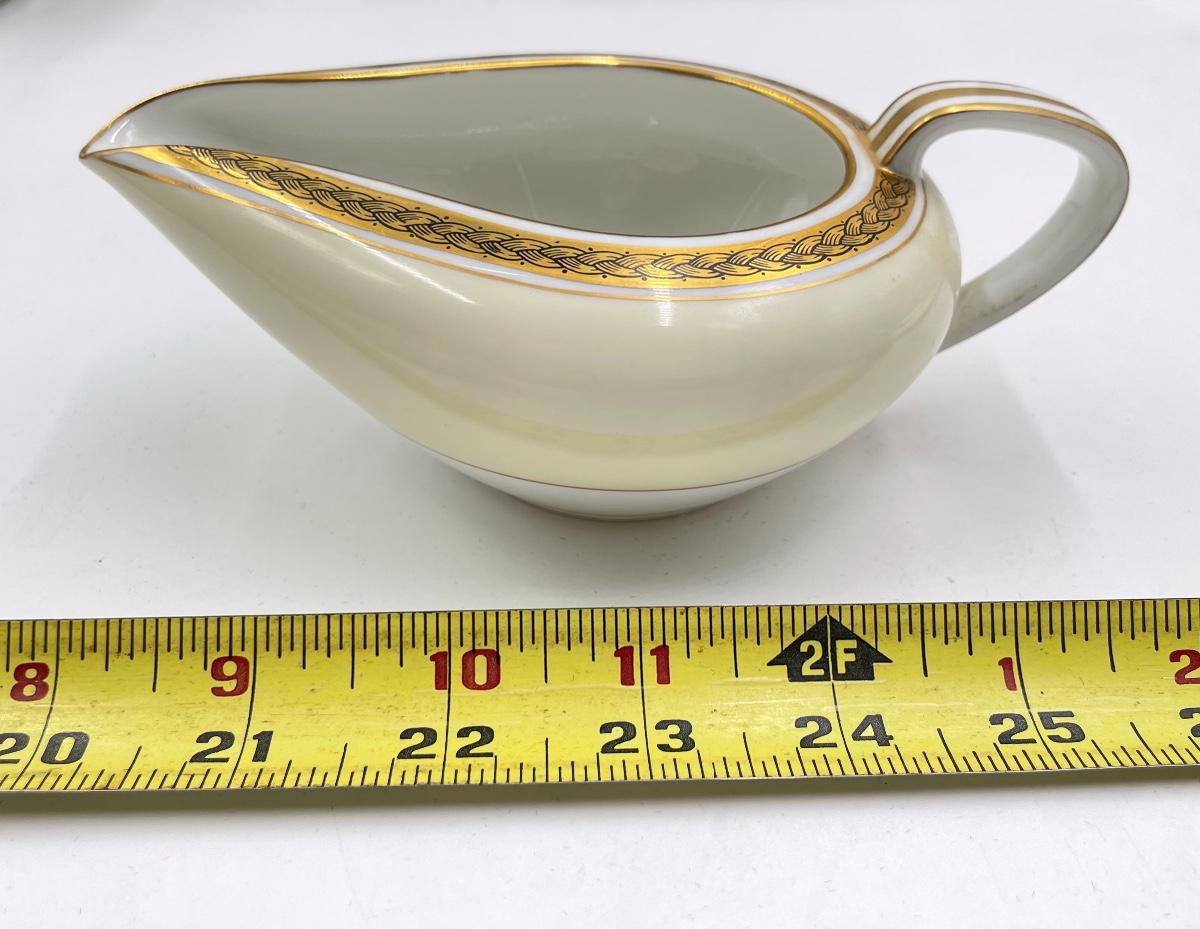 Includes (1) gravy boat with attached underplate; (1) lidded sugar dish; (1) creamer dish; (1) small oval bowl; (2) platters; (11) small bowls; (11) dinner plates; (11) salad plates; (12) small dessert plates; (12) medium bowls; (12) saucers; (12) teacups; (1) large lidded dish.