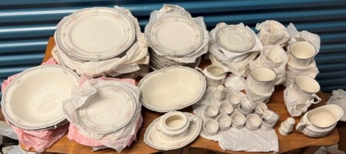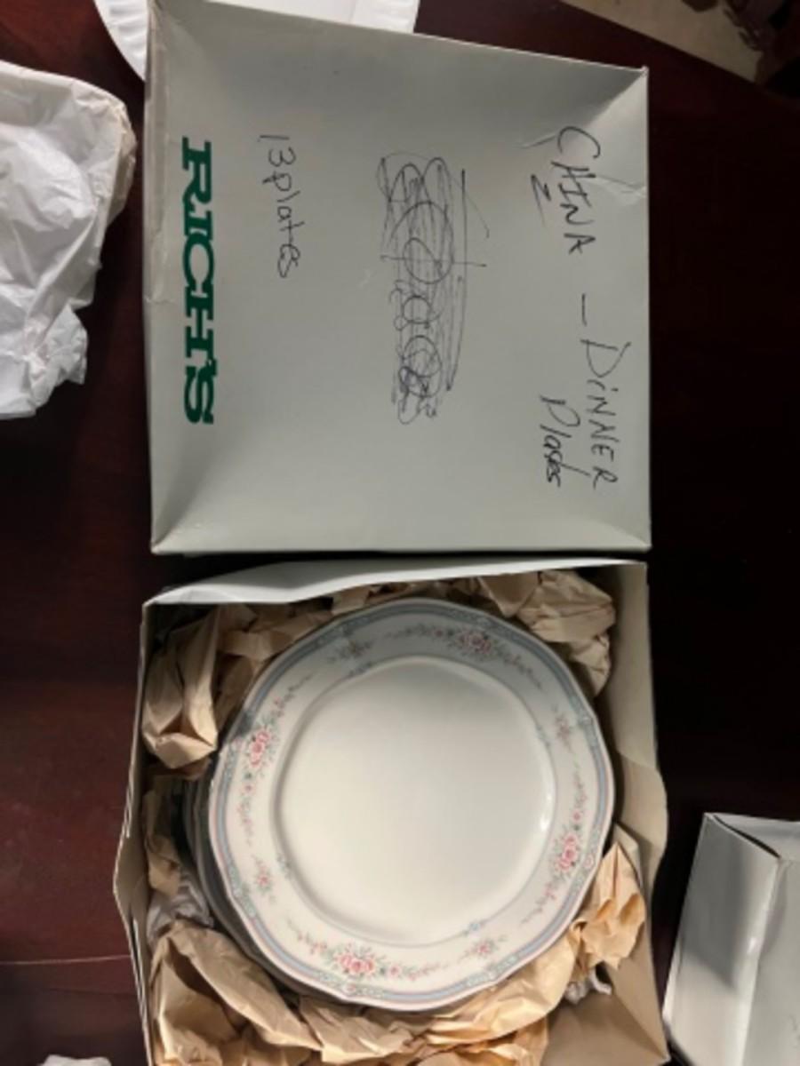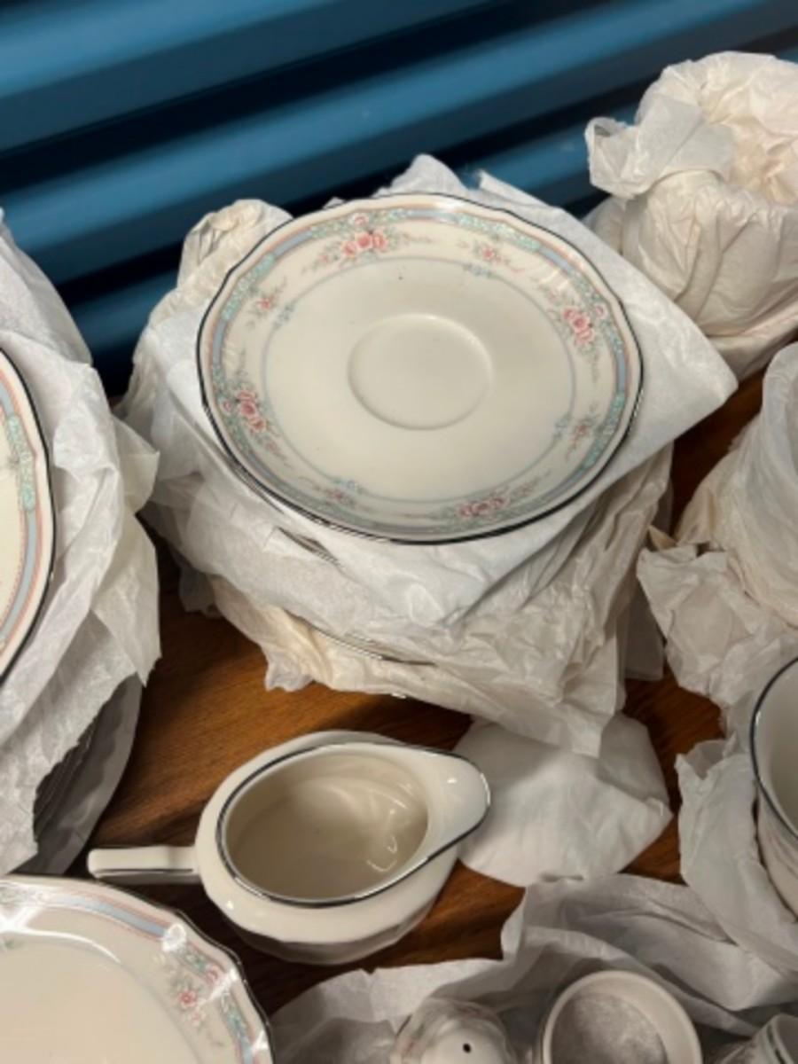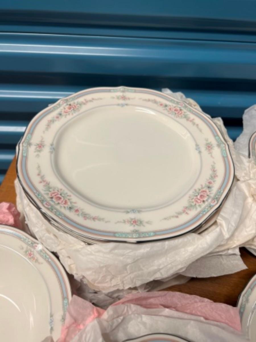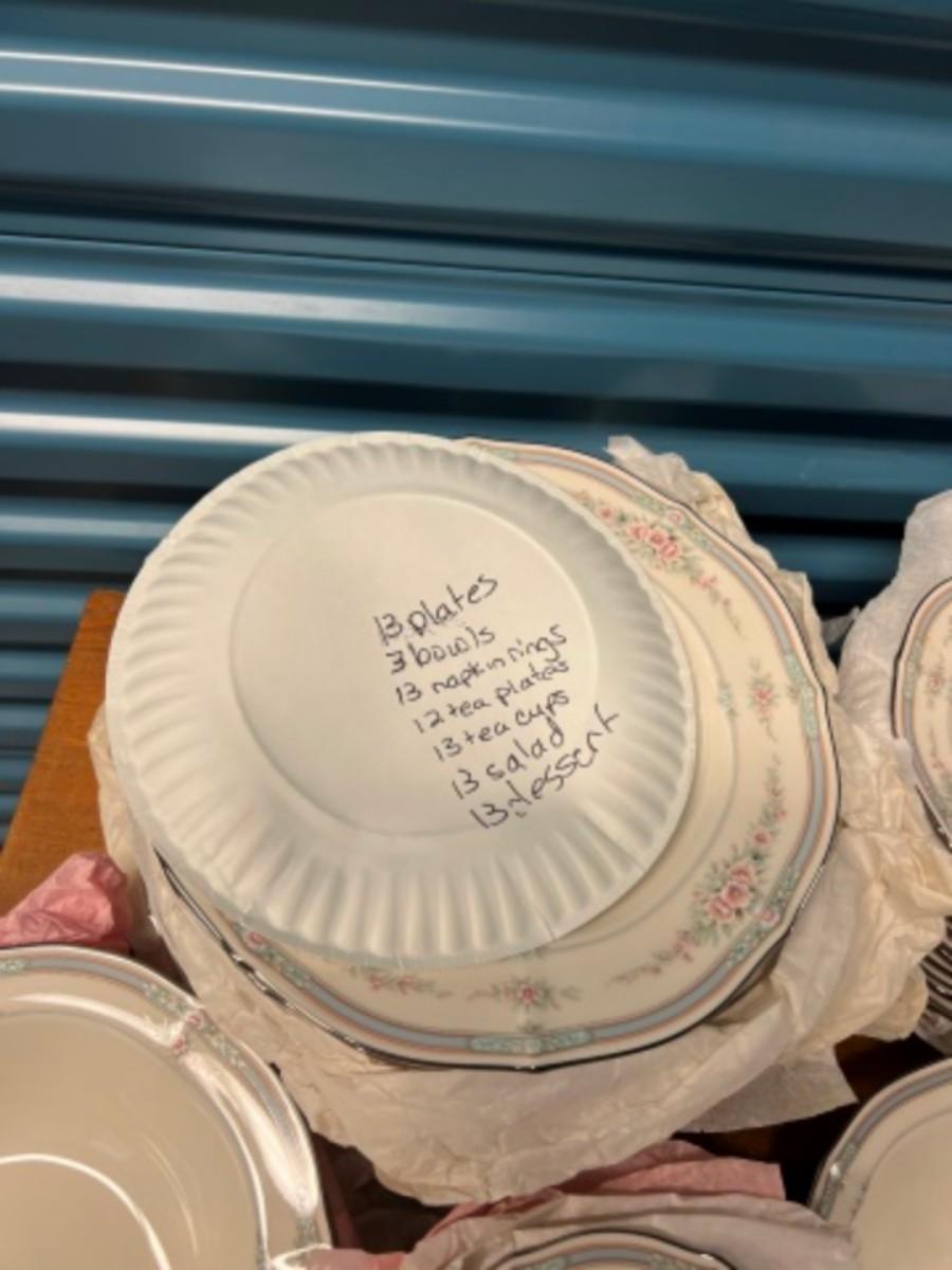 13 Plates, 13 napkin rings, 12 tea plates, 13 tea cups, 13 salad plates, 13 dinner plates, 3 bowls, plus serving dishes, salt and pepper,
