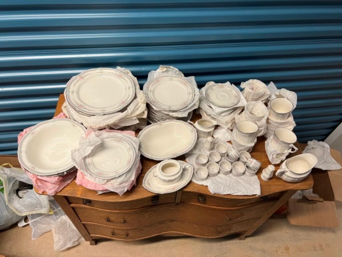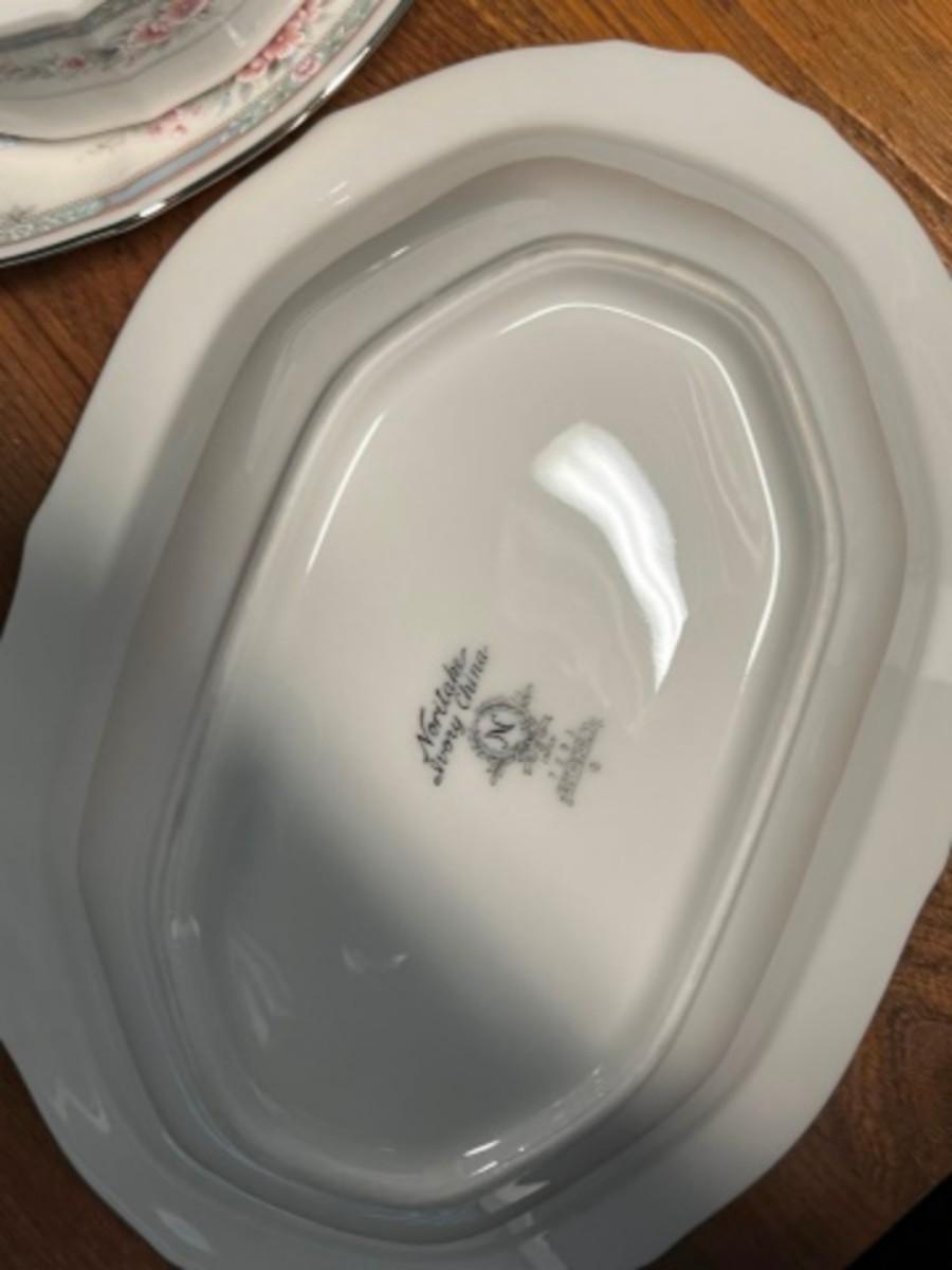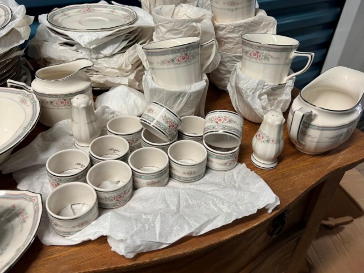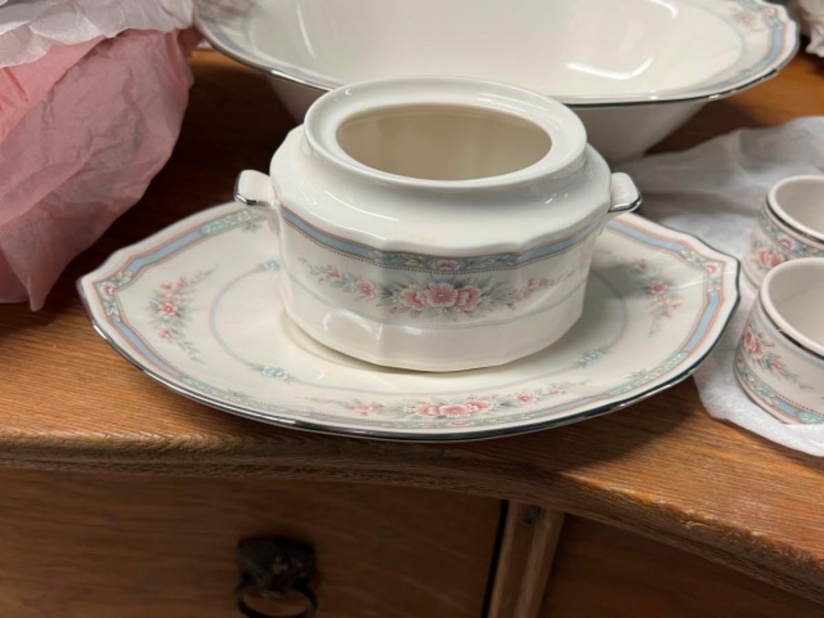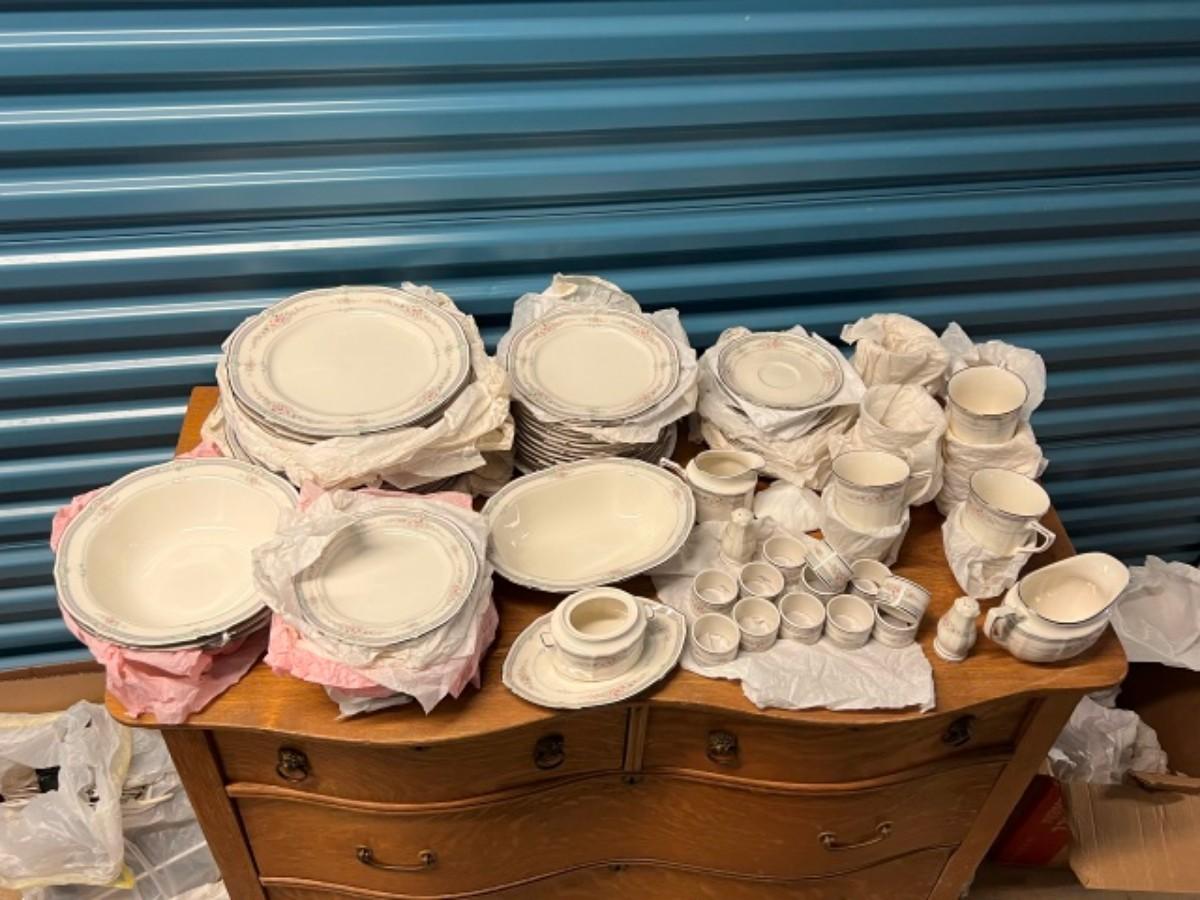 13 Plates, 13 napkin rings, 12 tea plates, 13 tea cups, 13 salad plates, 13 dinner plates, 3 bowls, plus serving dishes, salt and pepper,