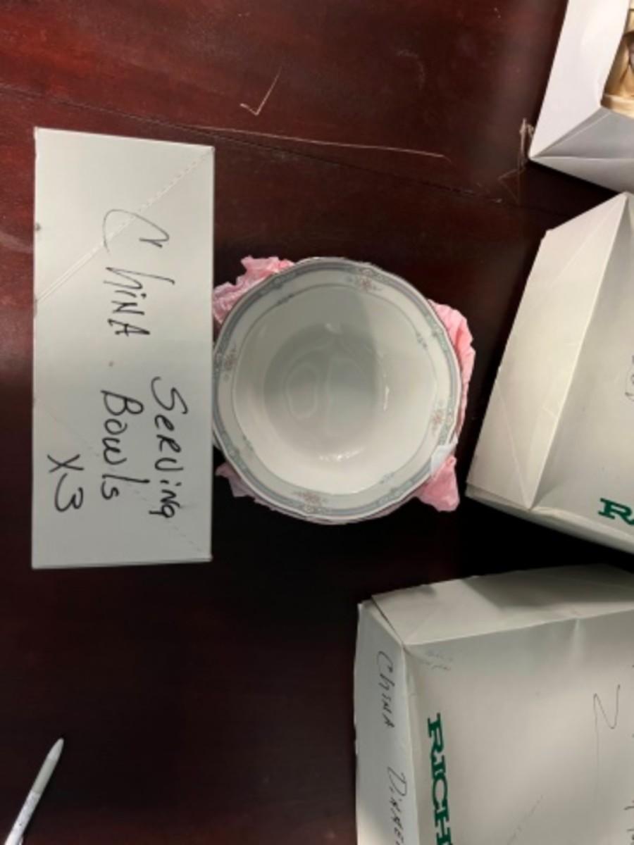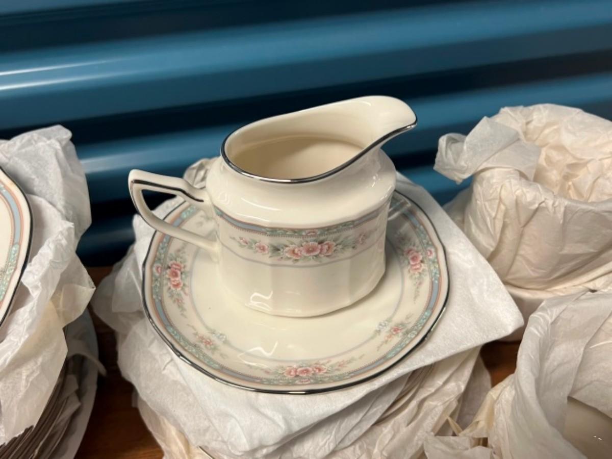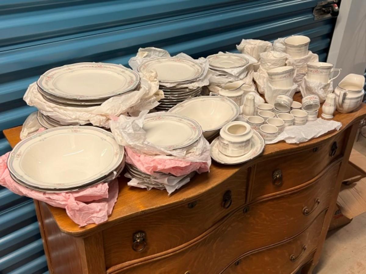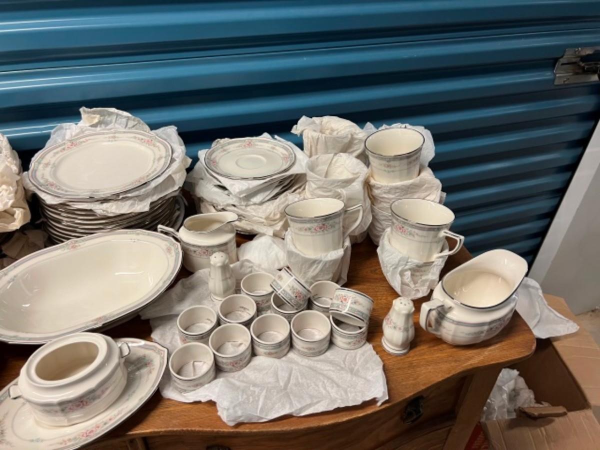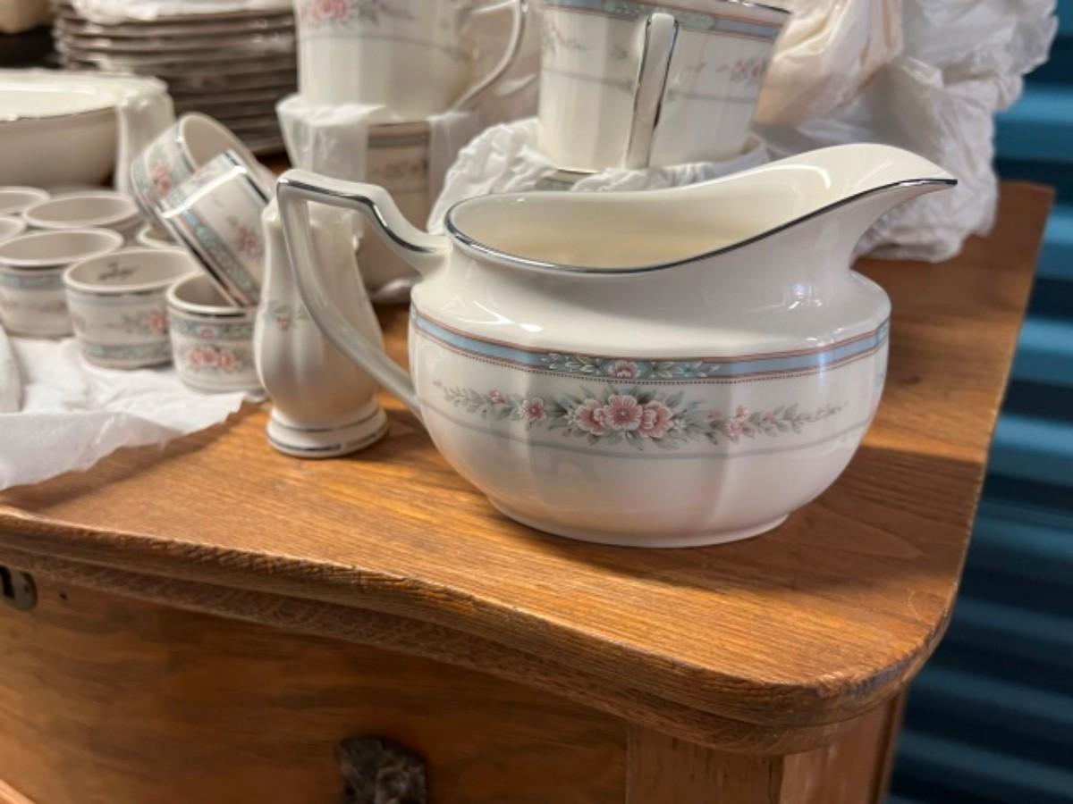 13 Plates, 13 napkin rings, 12 tea plates, 13 tea cups, 13 salad plates, 13 dinner plates, 3 bowls, plus serving dishes, salt and pepper,