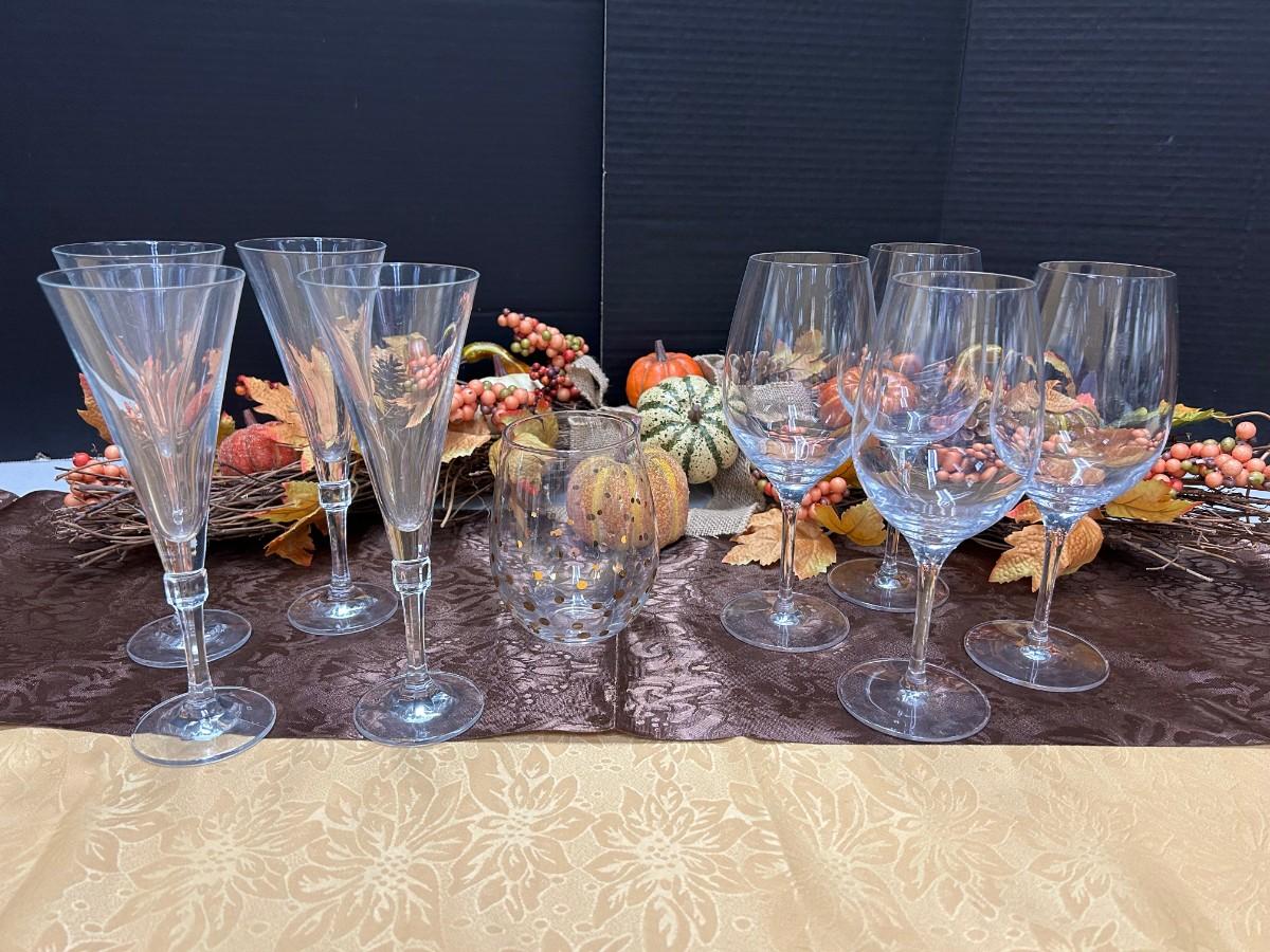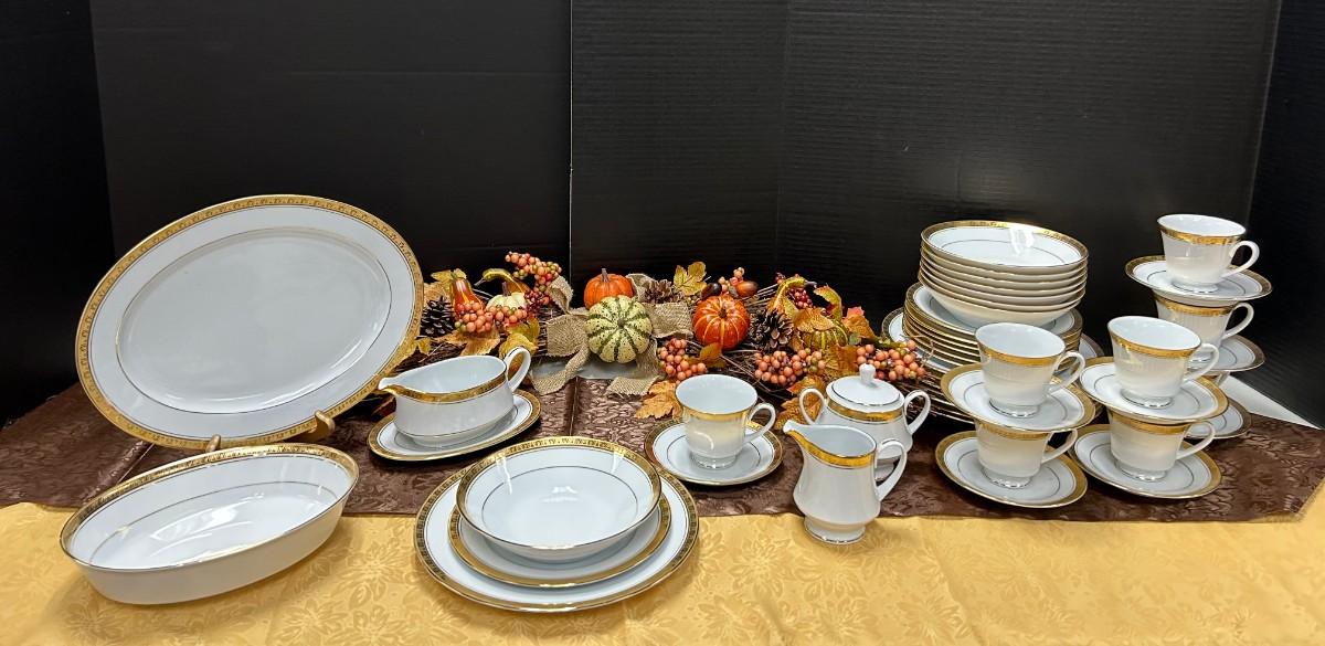 Included are: 8 dinner plates, 7 luncheon plates, 8 soup bowls, and 8 cups with saucers. Also there are 4 champagne flutes and 4 wine glasses. The centerpiece and table runners are included, Serving pieces include the large platter, oval serving bowl, plated gravy bowl, and cream and sugar set. All pieces are in very nice condition.