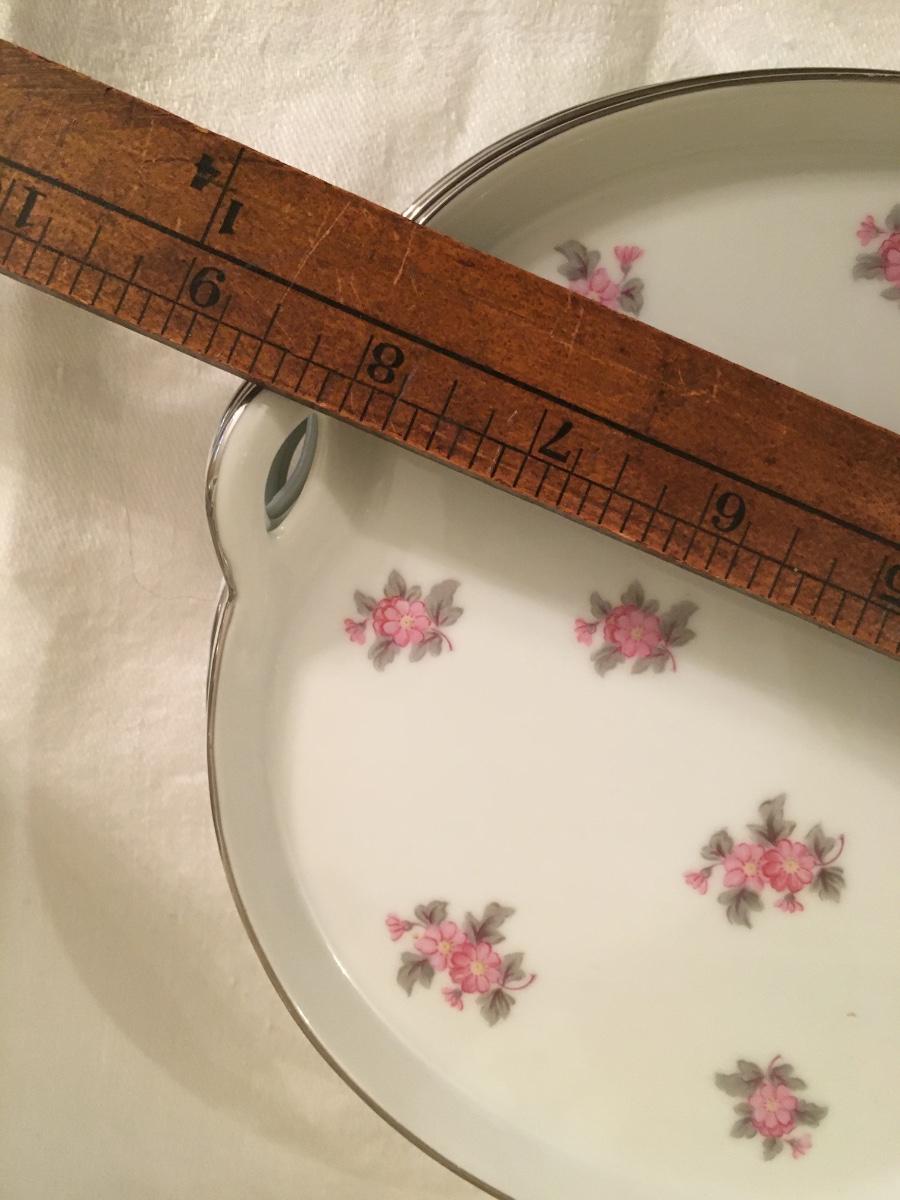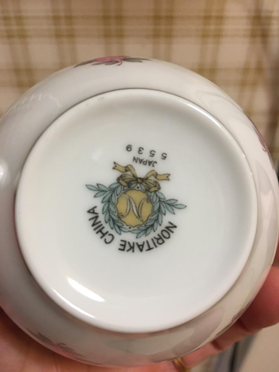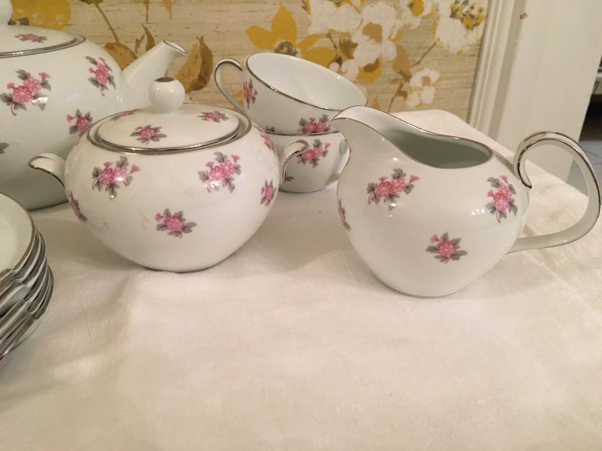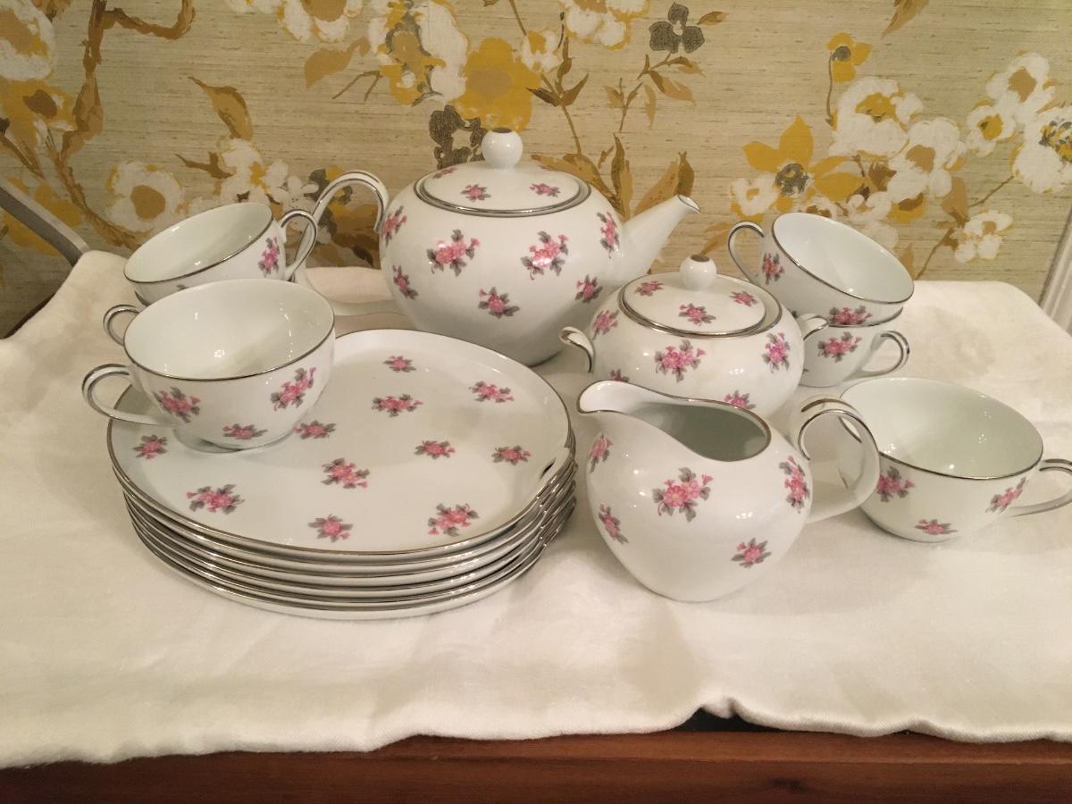 6 snack plates and tea cups with additional tea pot, sugar bowl and creamer.