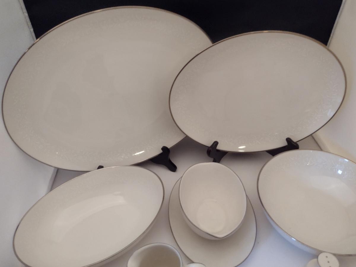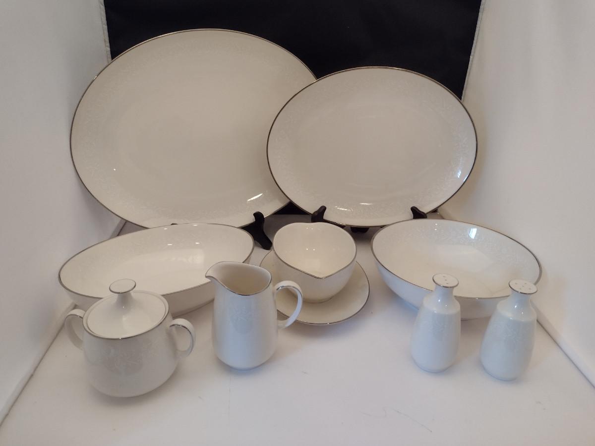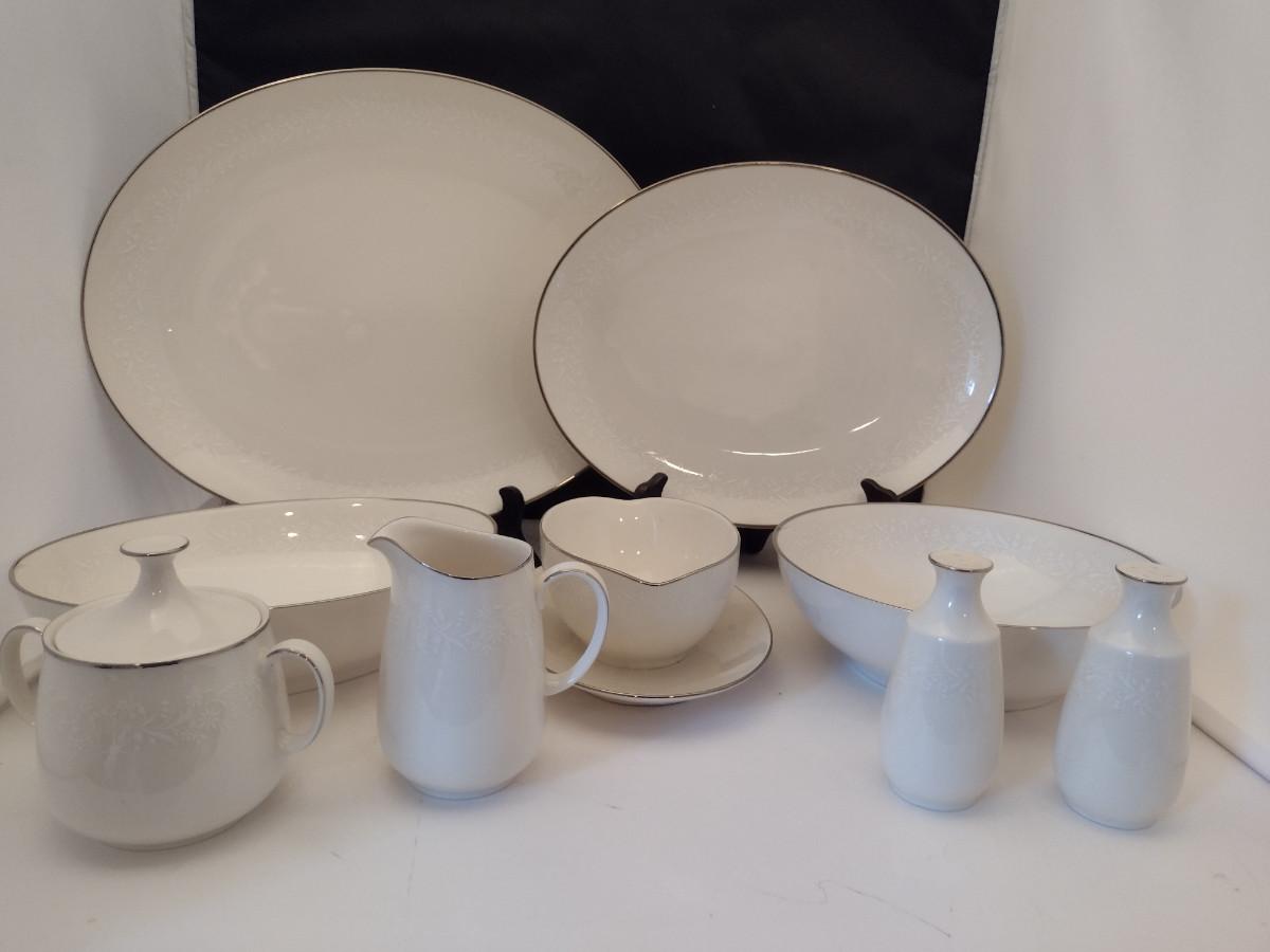 Noritake Serving Pieces- Lorelei Pattern- 15 Pieces. Set includes: Oval Bowls (9 1/2" x 6 7/8")- 4 pcs., Round bowl (8 1/4")- 1 pc., Oval platter (15")- 1 pc., Oval platter (12 1/2")- 2 pcs., Covered vegetable bowl (8 1/4")- 1 pc., Salt & Pepper shaker set, Creamer, Covered sugar bowl, Gravy boat with underplate- 2 pcs.