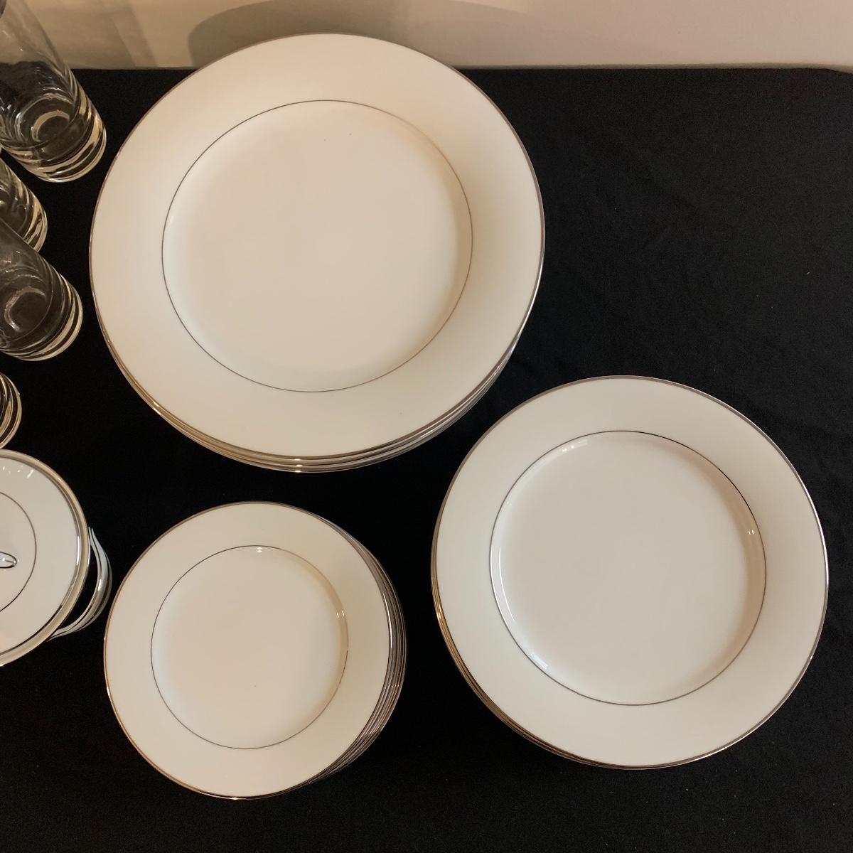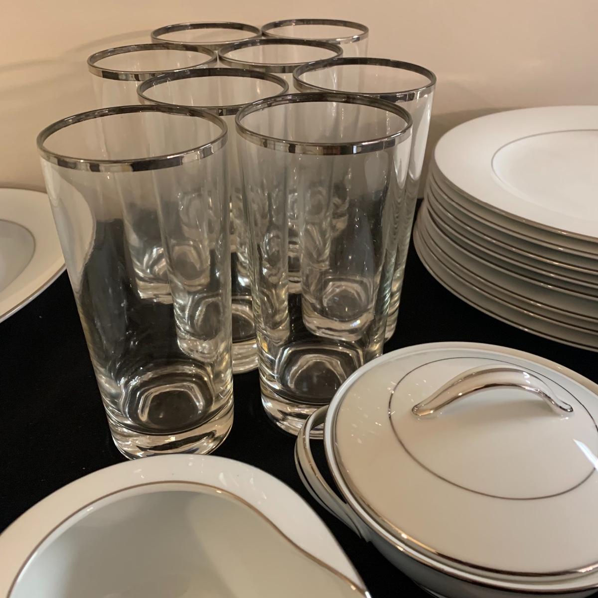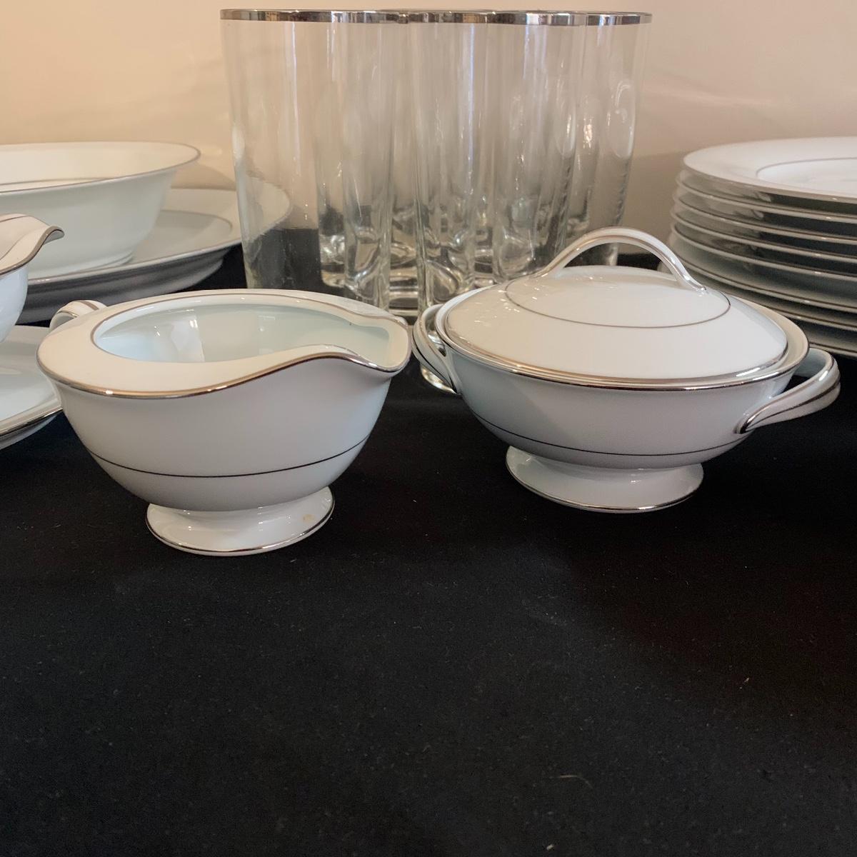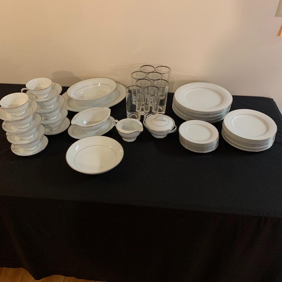Lot includes five pieces eight place setting (minus one desert plate) glasses along with six service pieces. All in great condition. Local pick up only.