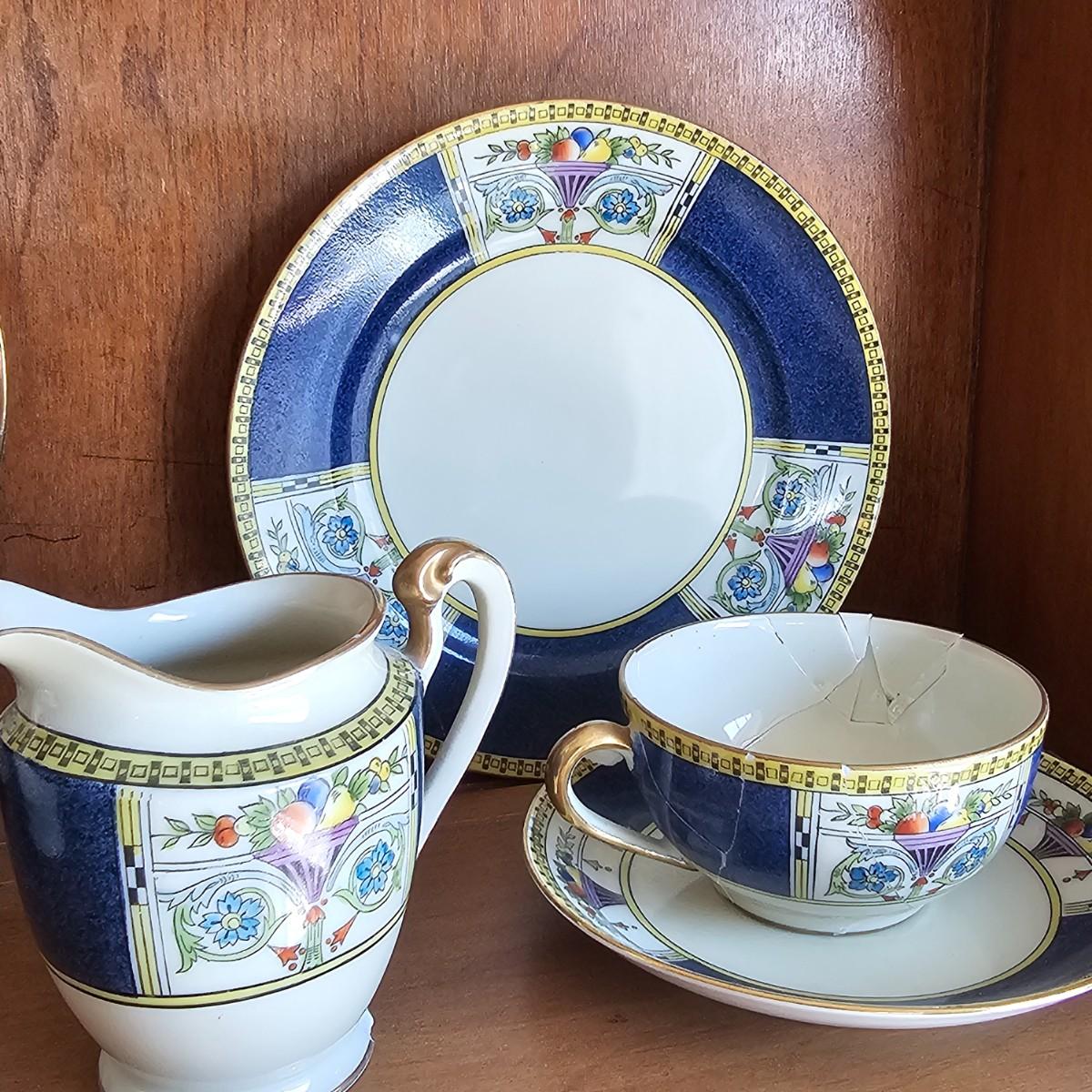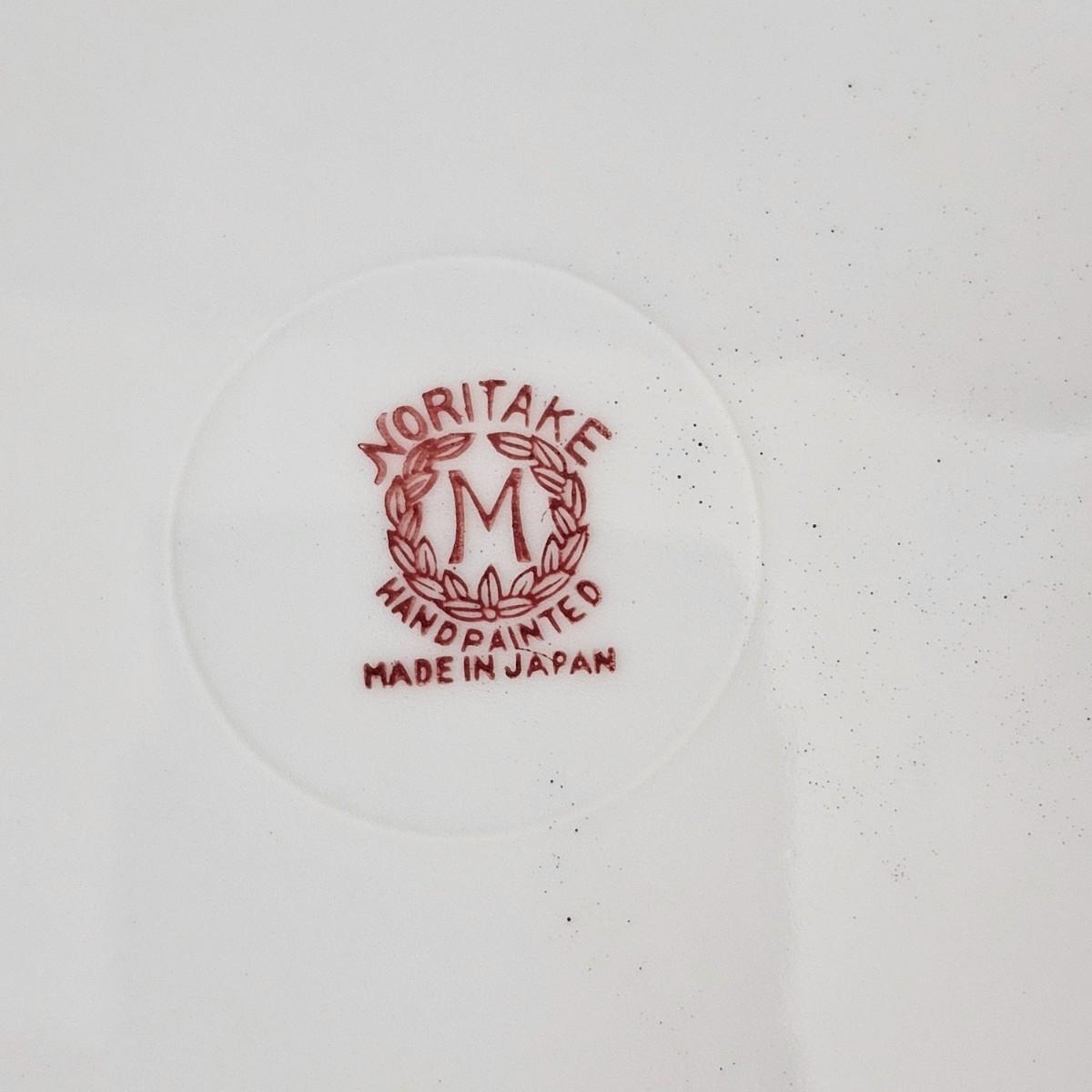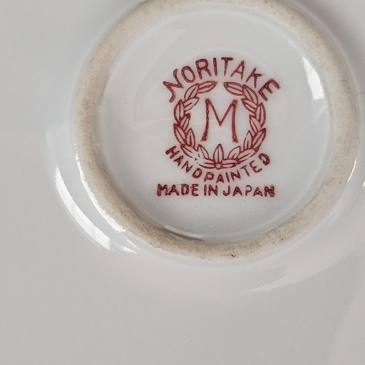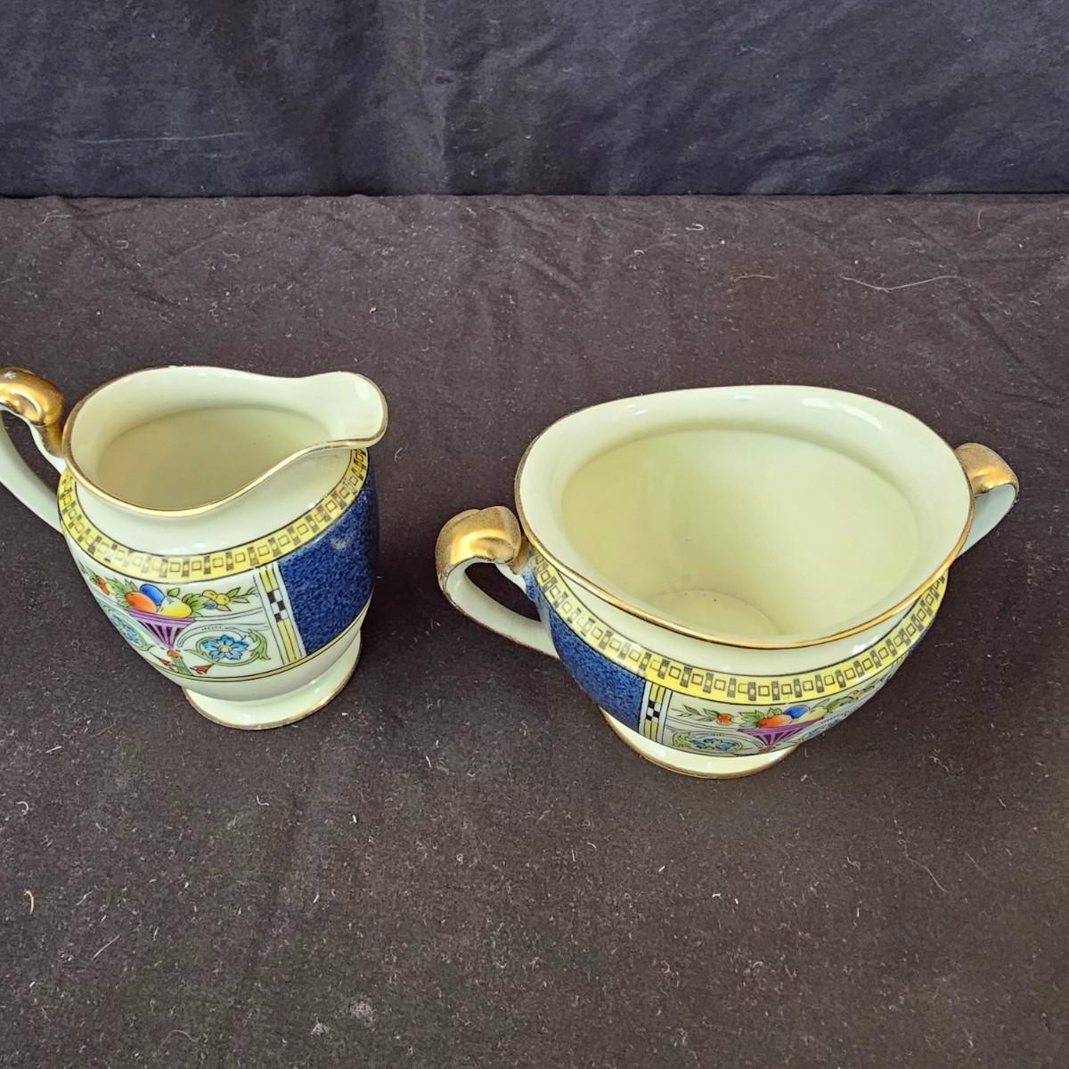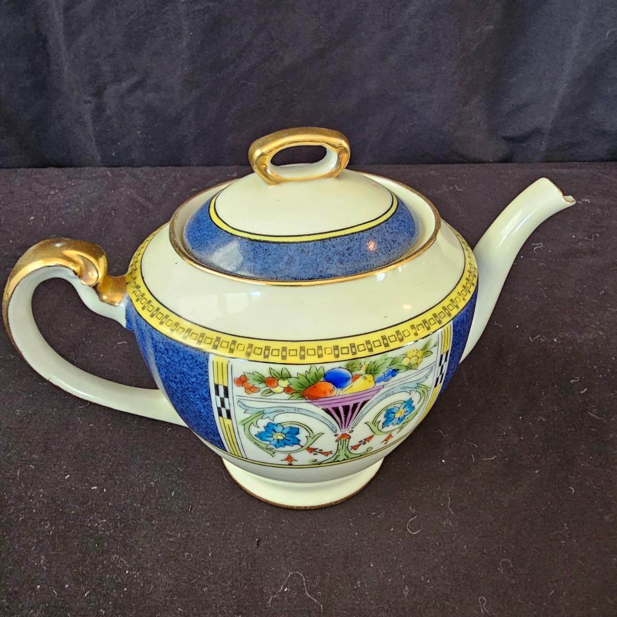 Fruit and flowers adorn these hand-painted Noritake cups, saucers and plates. Gold rimmed edges and handles. One large plate, six smaller plates, teapot, cream & sugar, two saucers and six cups. Large plate is 9.5"D, smaller plates are 7"D. Teapot measures 8.5" x 4.5"x 5"H. There are three broken/chipped items. Teapot has a missing piece on spout, one saucers has edge chips and one teacup has been completely glued back together. Please note, display rack not included with tea set, but available elsewhere in this auction. See photos for details. Shipping available.
