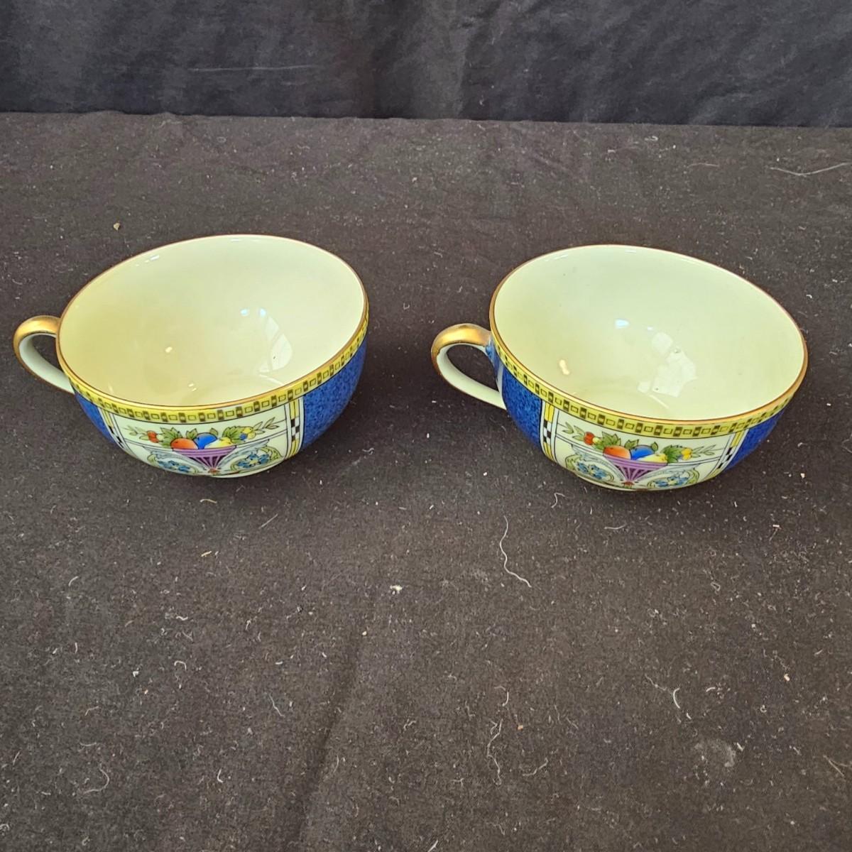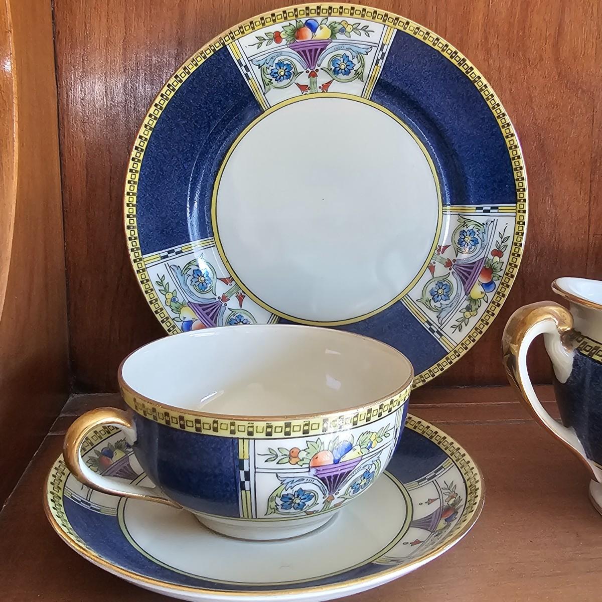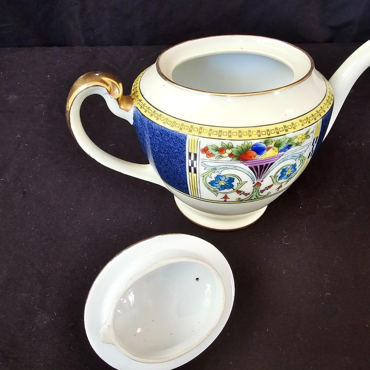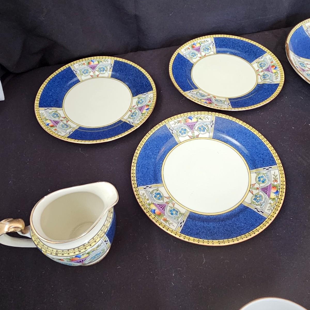 Fruit and flowers adorn these hand-painted Noritake cups, saucers and plates. Gold rimmed edges and handles. One large plate, six smaller plates, teapot, cream & sugar, two saucers and six cups. Large plate is 9.5"D, smaller plates are 7"D. Teapot measures 8.5" x 4.5"x 5"H. There are three broken/chipped items. Teapot has a missing piece on spout, one saucers has edge chips and one teacup has been completely glued back together. Please note, display rack not included with tea set, but available elsewhere in this auction. See photos for details. Shipping available.