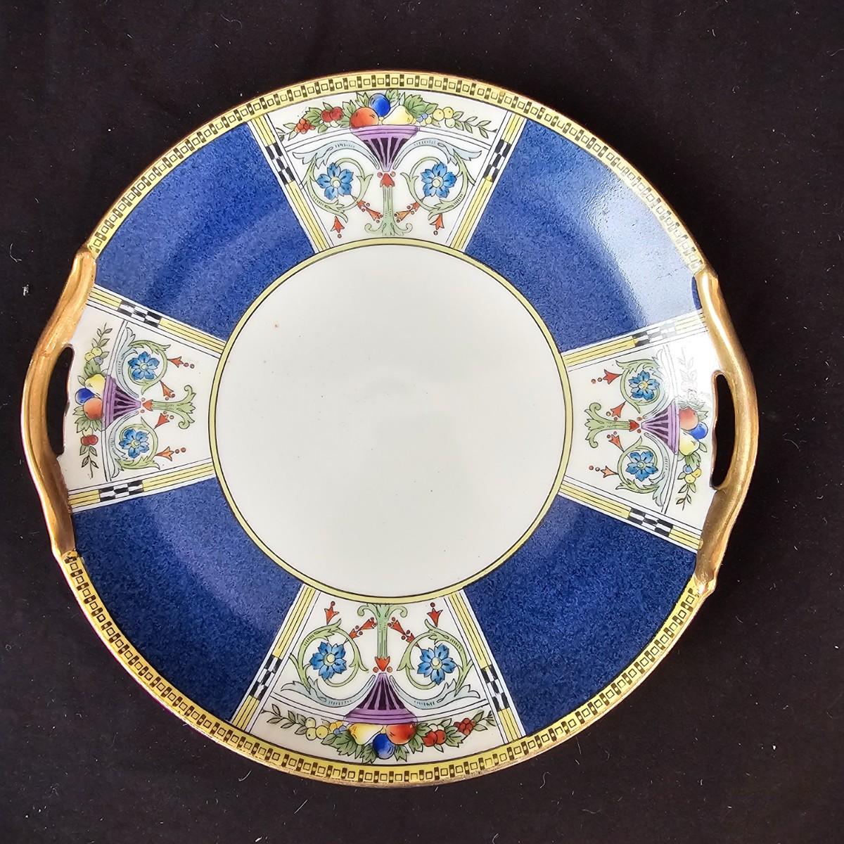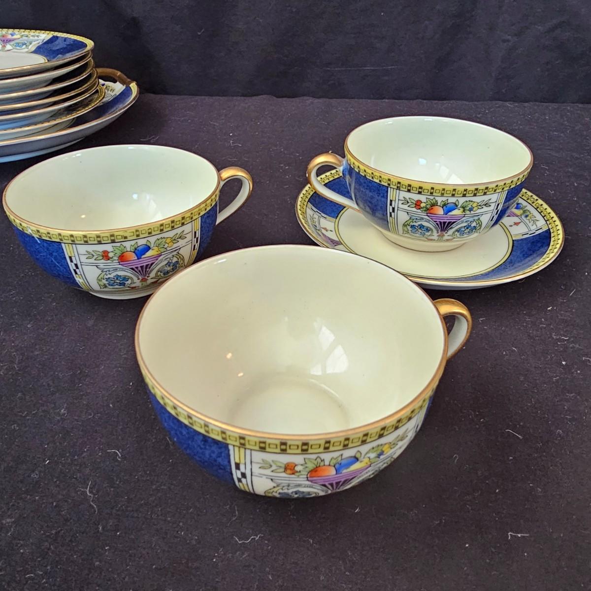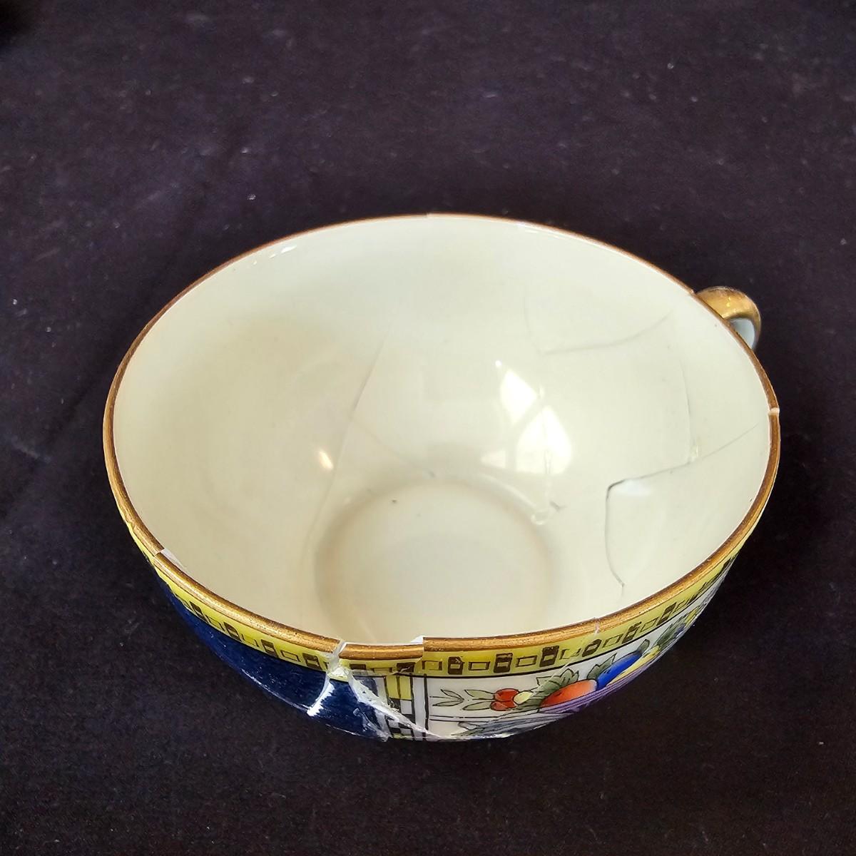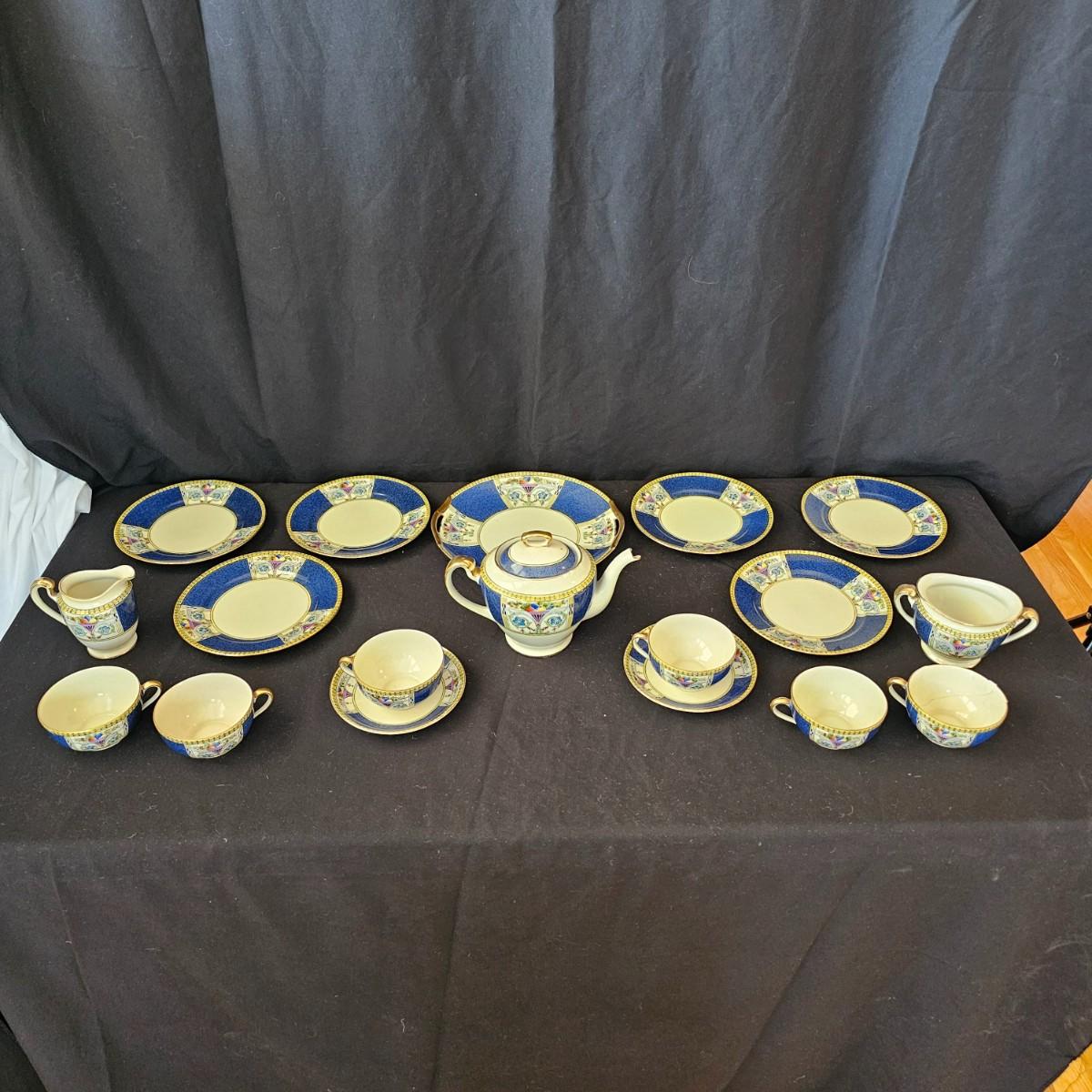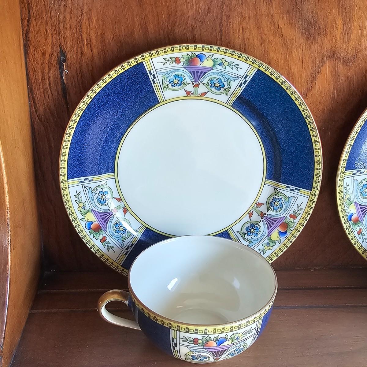 Fruit and flowers adorn these hand-painted Noritake cups, saucers and plates. Gold rimmed edges and handles. One large plate, six smaller plates, teapot, cream & sugar, two saucers and six cups. Large plate is 9.5"D, smaller plates are 7"D. Teapot measures 8.5" x 4.5"x 5"H. There are three broken/chipped items. Teapot has a missing piece on spout, one saucers has edge chips and one teacup has been completely glued back together. Please note, display rack not included with tea set, but available elsewhere in this auction. See photos for details. Shipping available.