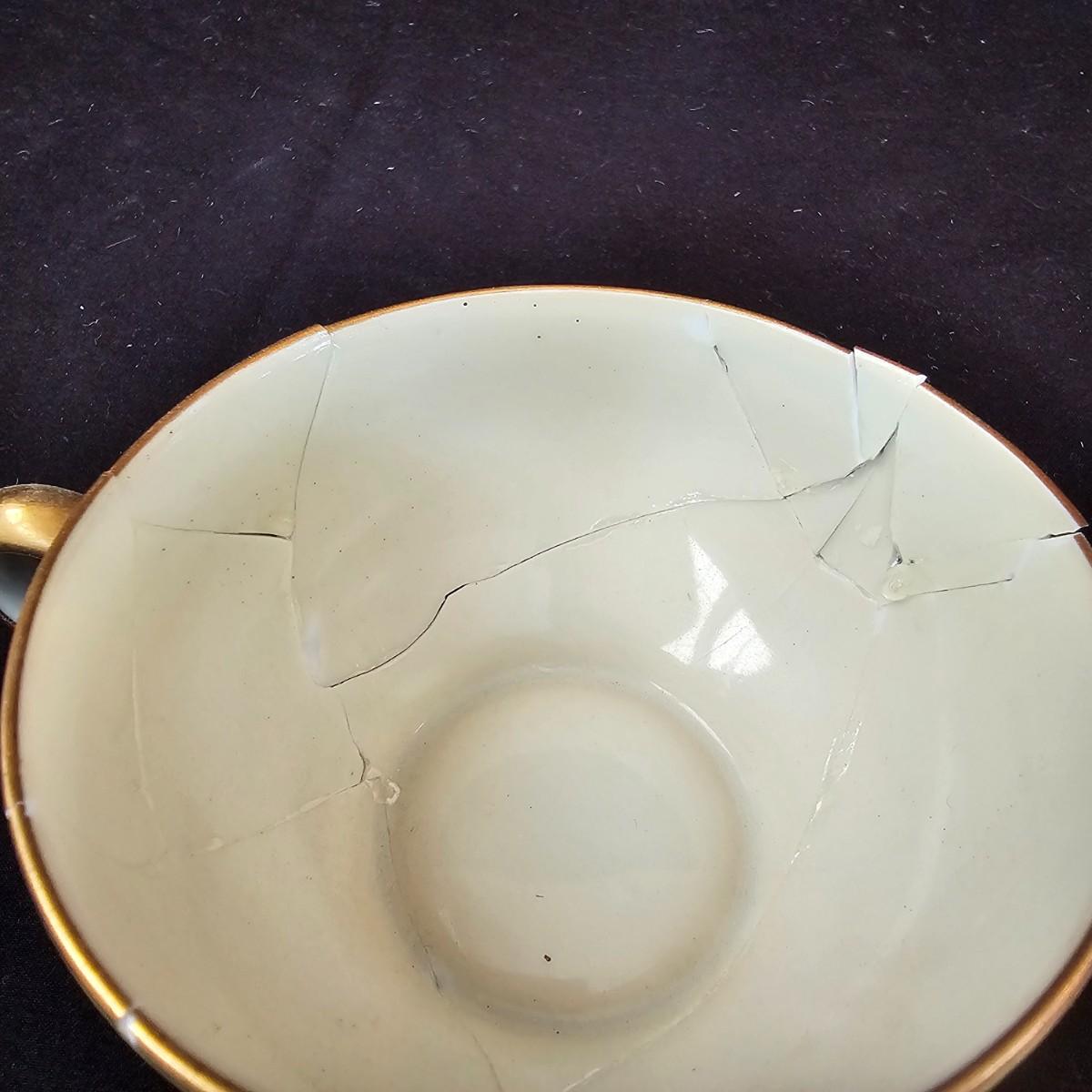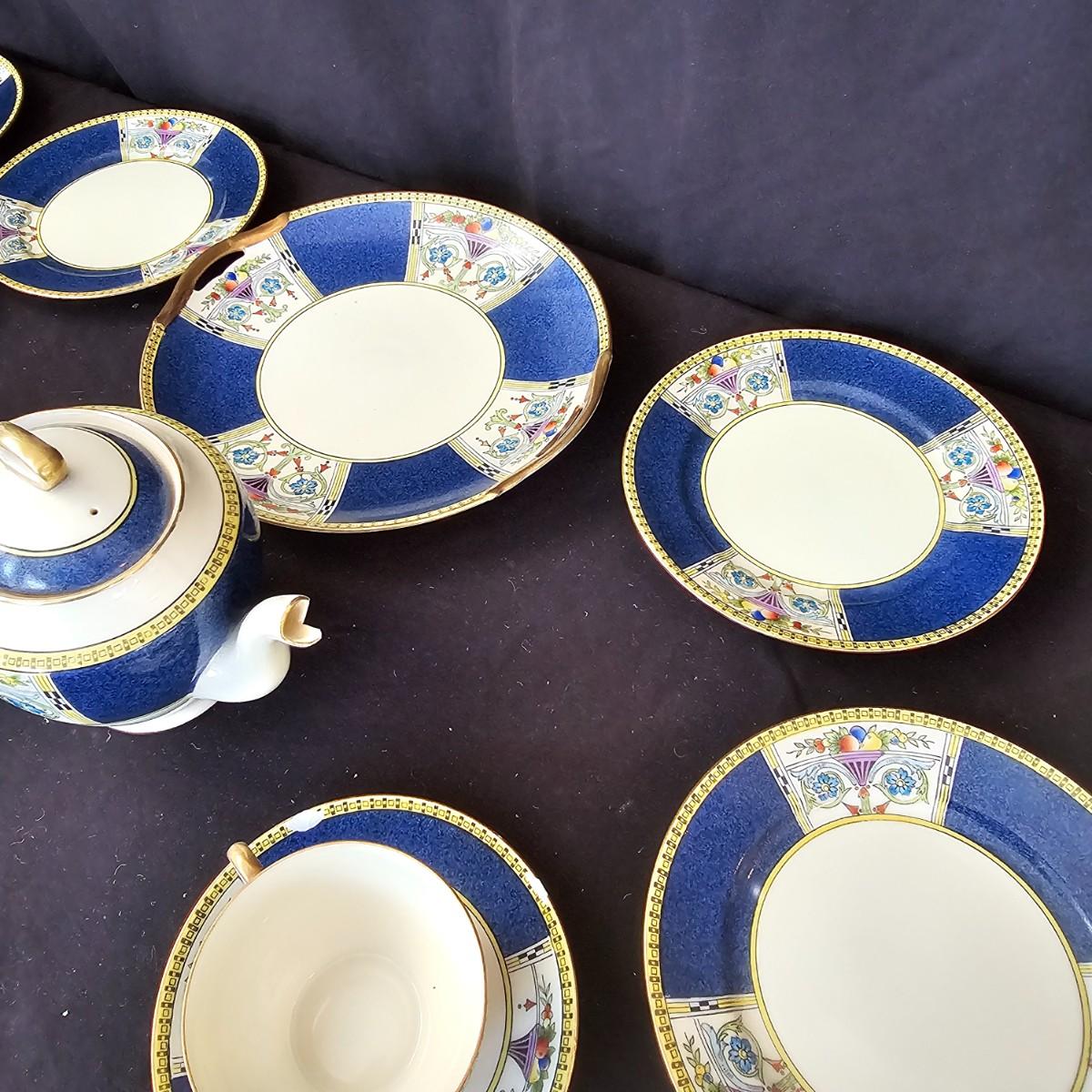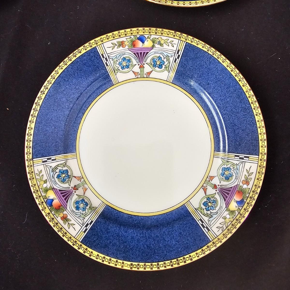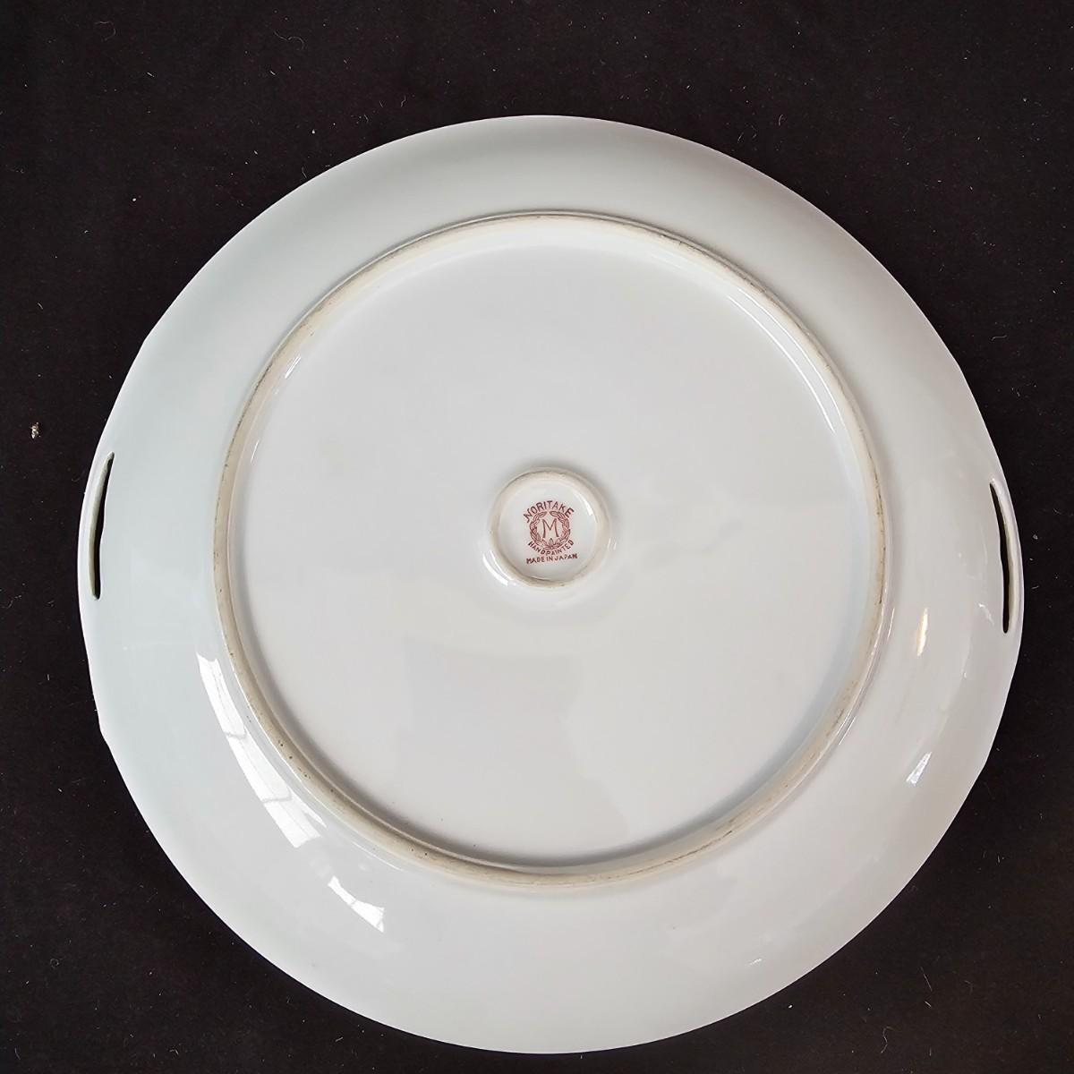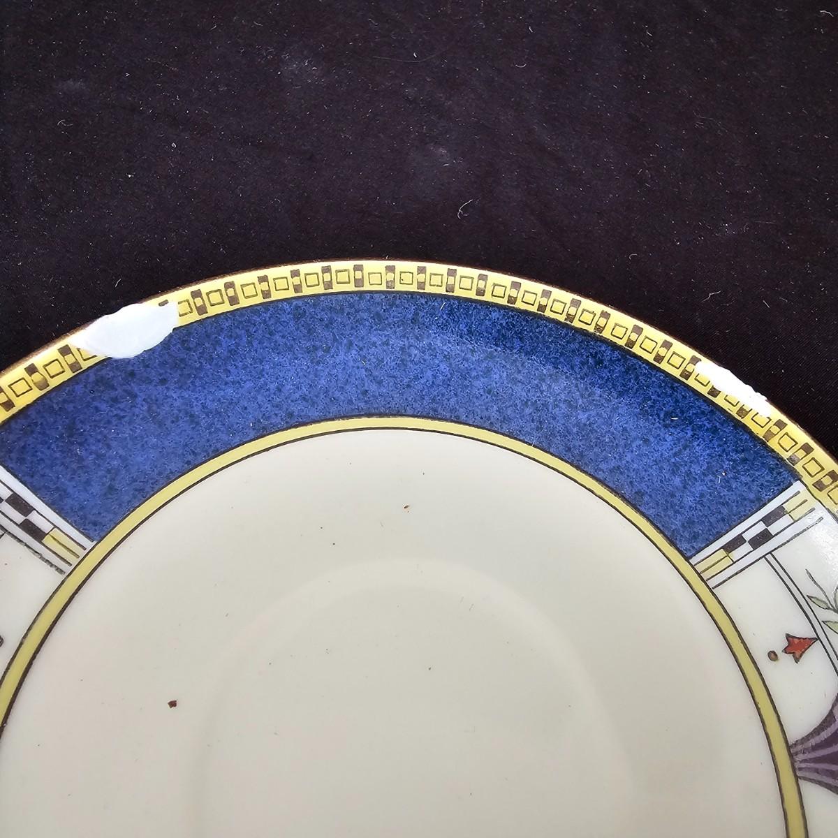 Fruit and flowers adorn these hand-painted Noritake cups, saucers and plates. Gold rimmed edges and handles. One large plate, six smaller plates, teapot, cream & sugar, two saucers and six cups. Large plate is 9.5"D, smaller plates are 7"D. Teapot measures 8.5" x 4.5"x 5"H. There are three broken/chipped items. Teapot has a missing piece on spout, one saucers has edge chips and one teacup has been completely glued back together. Please note, display rack not included with tea set, but available elsewhere in this auction. See photos for details. Shipping available.