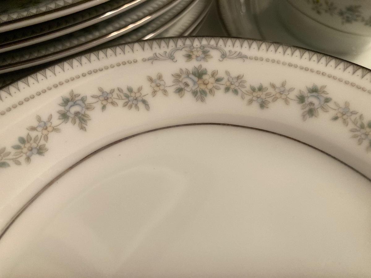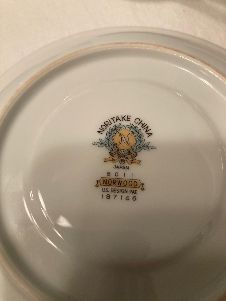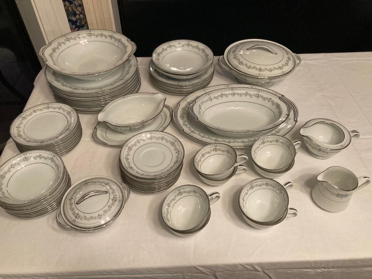 Noritaki China Set, Norwood pattern, vintage, 46 pieces: 8 dinner plates, 5 salad plates, 8 bread plates, 8 small bowls, 8 tea cups w/saucers, 2 soup bowls, gravy boat, oval vegetable bowl, lg round serving bowl, lg. round covered serving bowl, oblong platter, covered sugar bowl and Creamer. One salad plate has a couple of chips; otherwise, all in very good vintage condition.