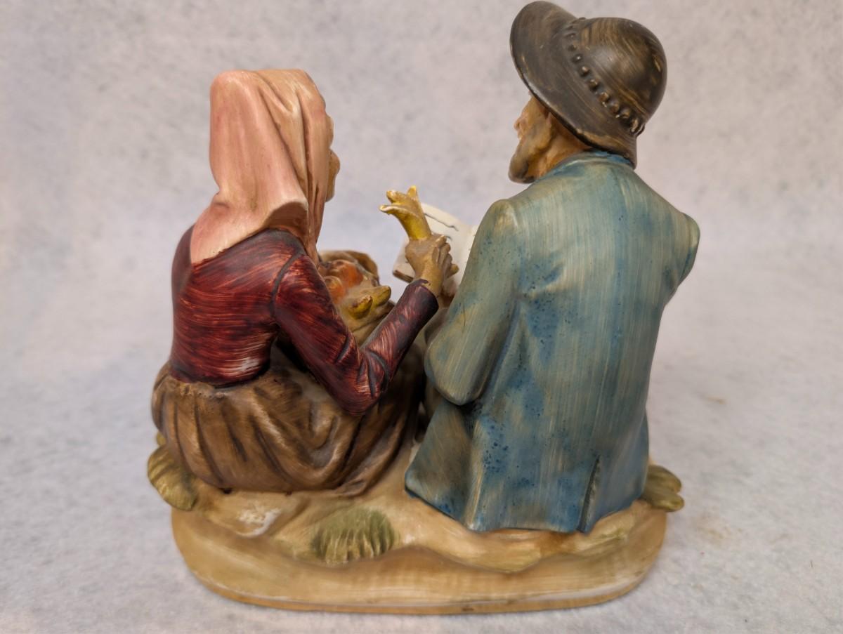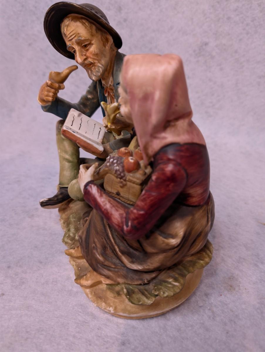Depicts man sitting down w/ a hat, pipe and book and a woman holding a basket