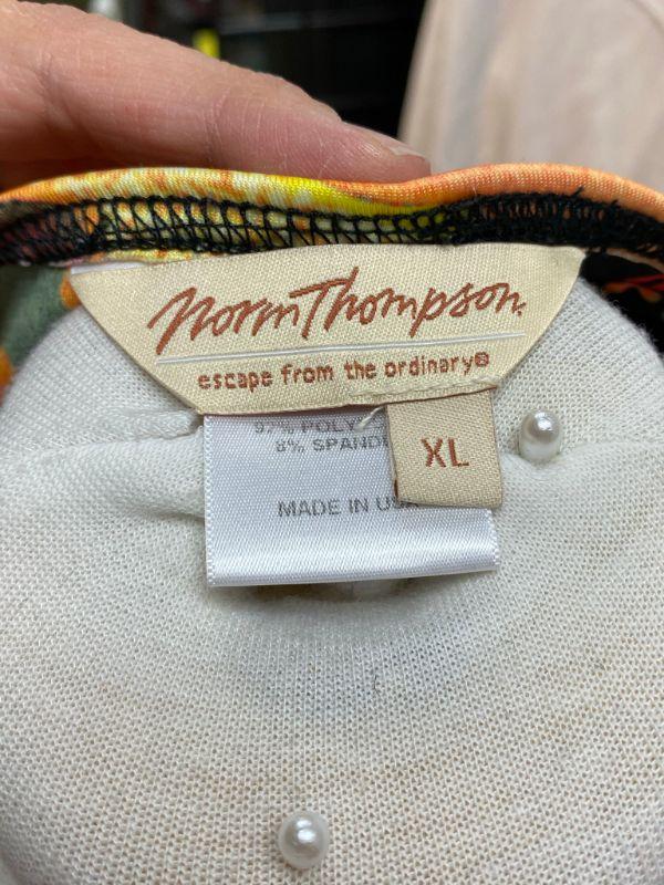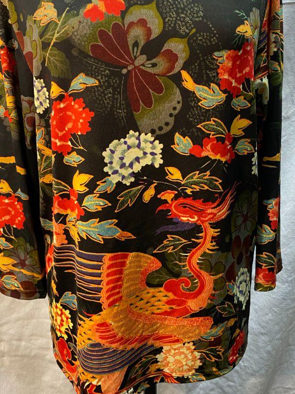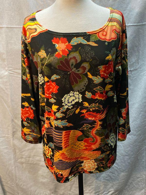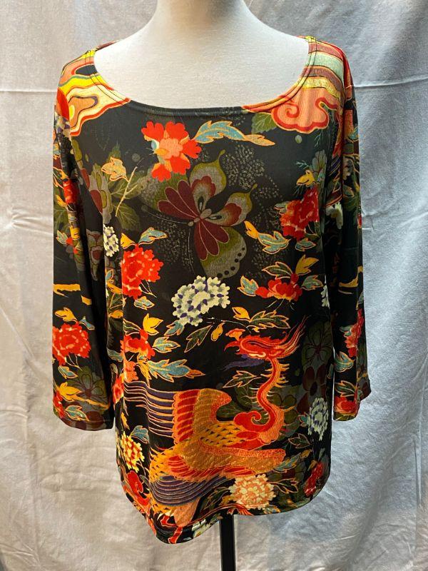Norm Thompson Asian inspired blouse. Floral design with a bird and butterfly in bright oranges and muted greens. Size XL. Poly/spandex gives this shirt some stretch. Good condition.