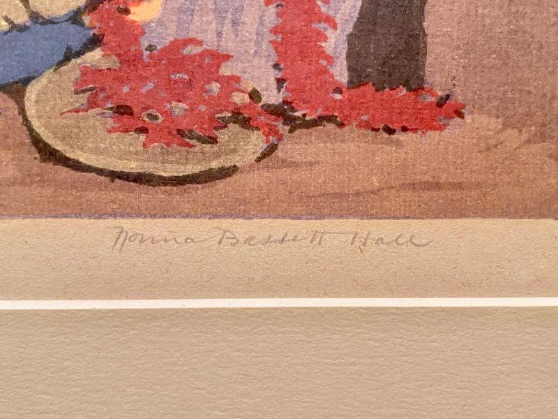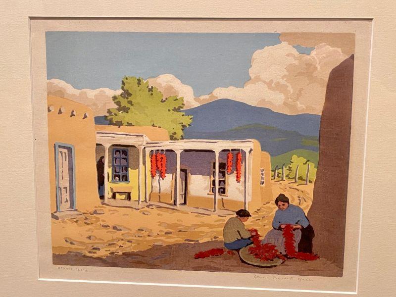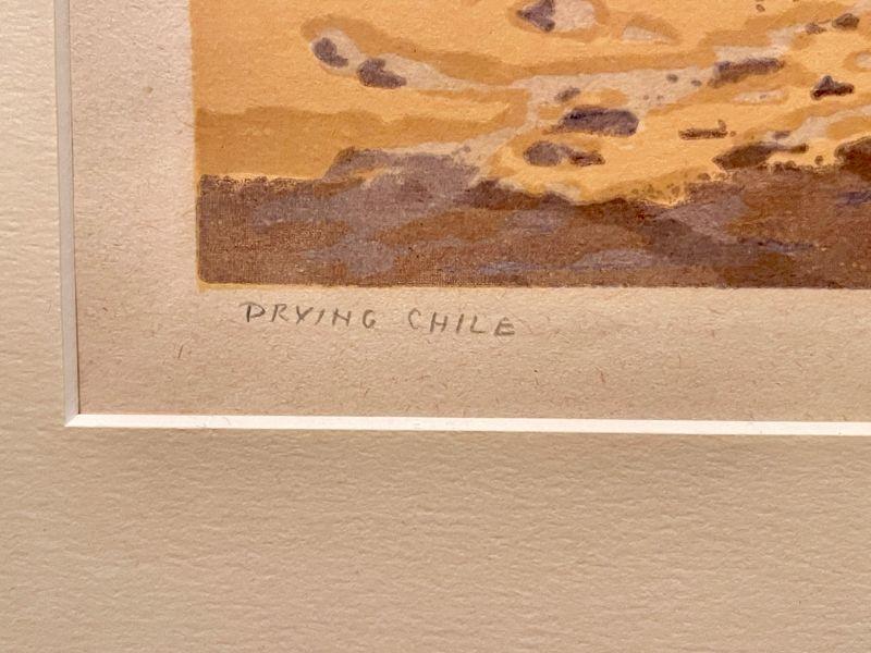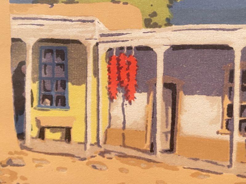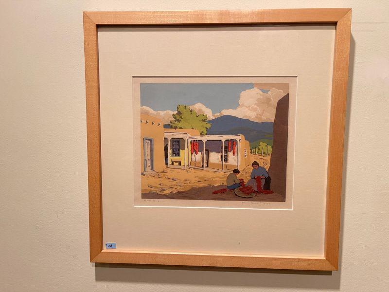 This is an original serigraph by the only female founding member of the Prairie Printmakers, Norma Bassett Hall. This artist, the first of the bunch to work with color as well, has rendered a traditional Southwest adobe structure with two Native American women weaving together bundles of chilis to hang out in the sun to dry. Towering sunlit clouds crown the mountain backdrop. Reserve price of $545.