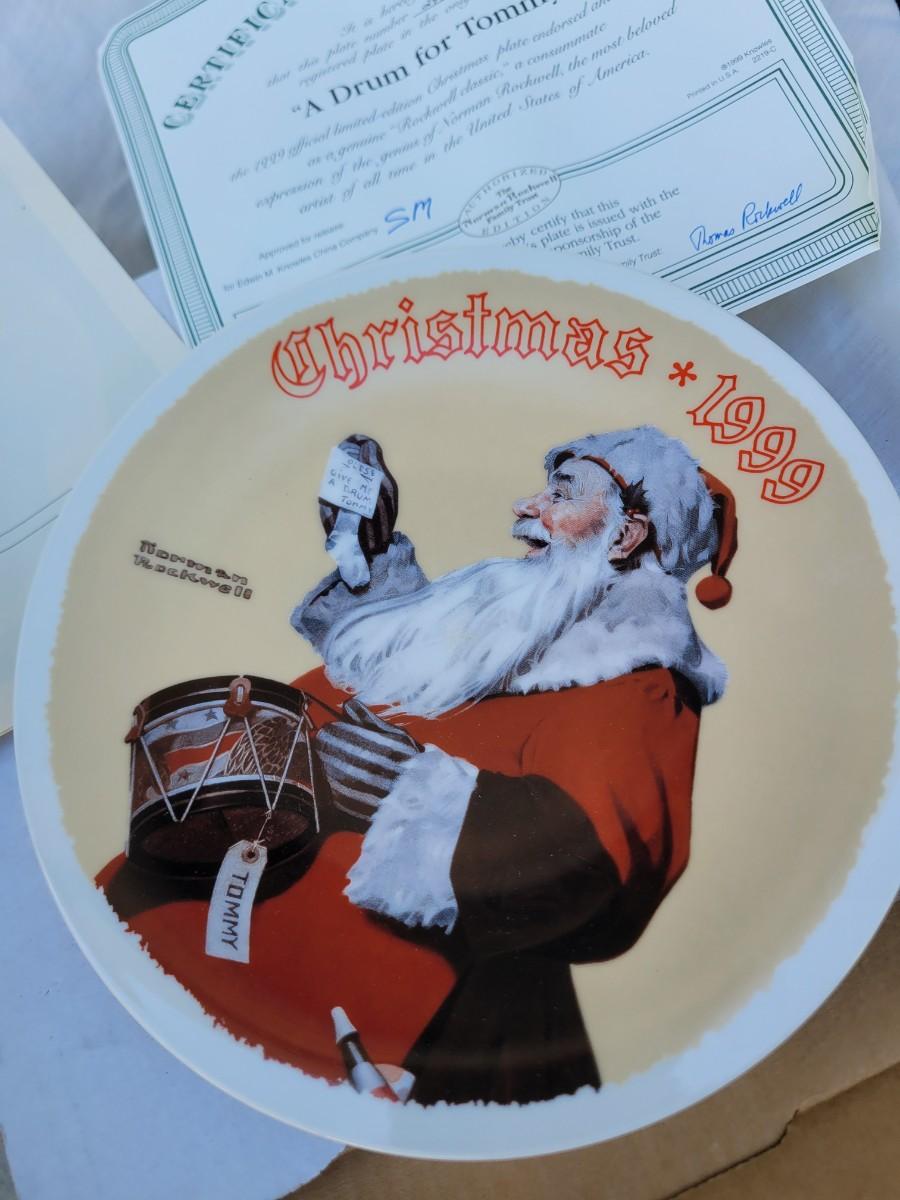 The plate depicts Santa Claus with a drum and a note that reads "Please give me a drum, Tommy," reflecting the spirit of Christmas giving.