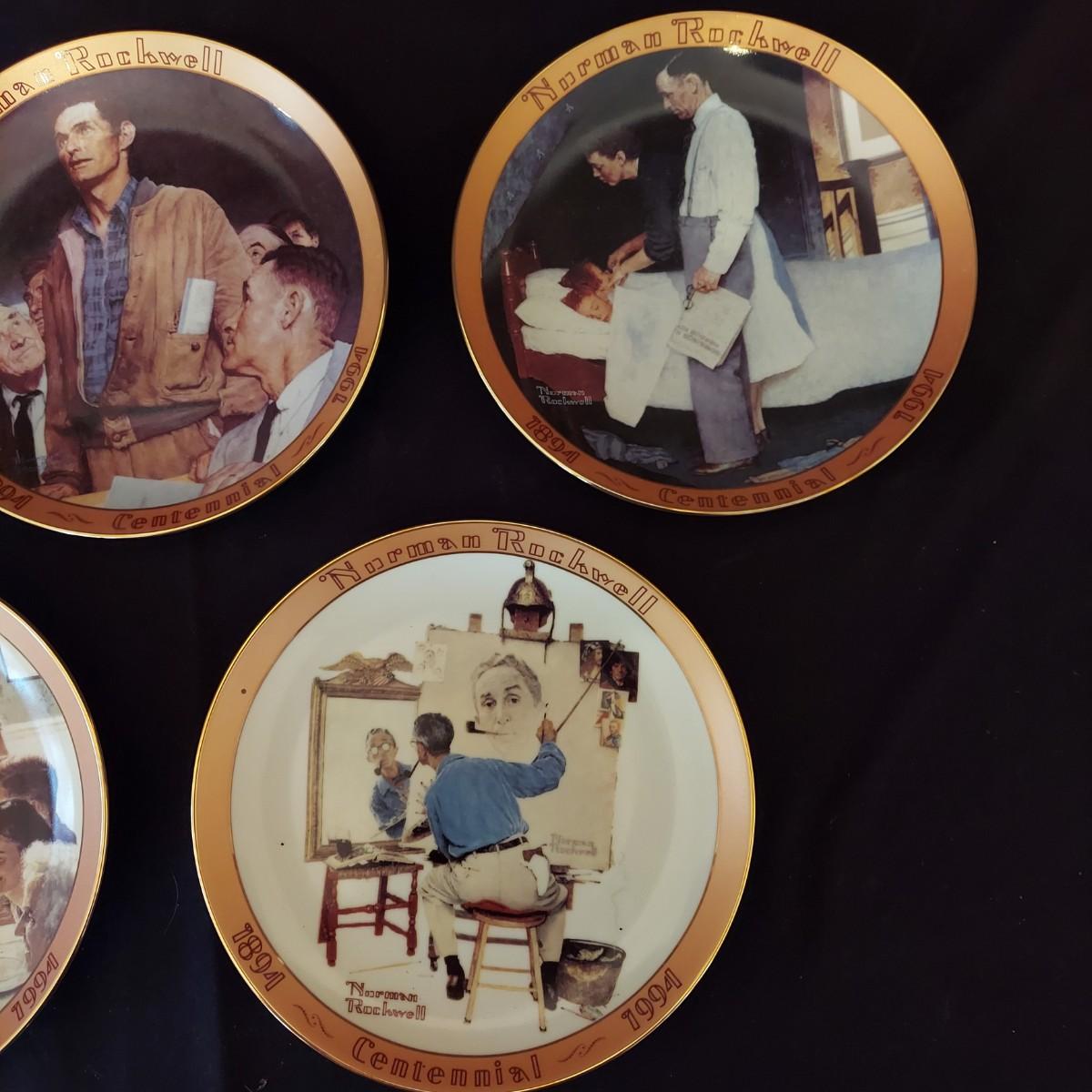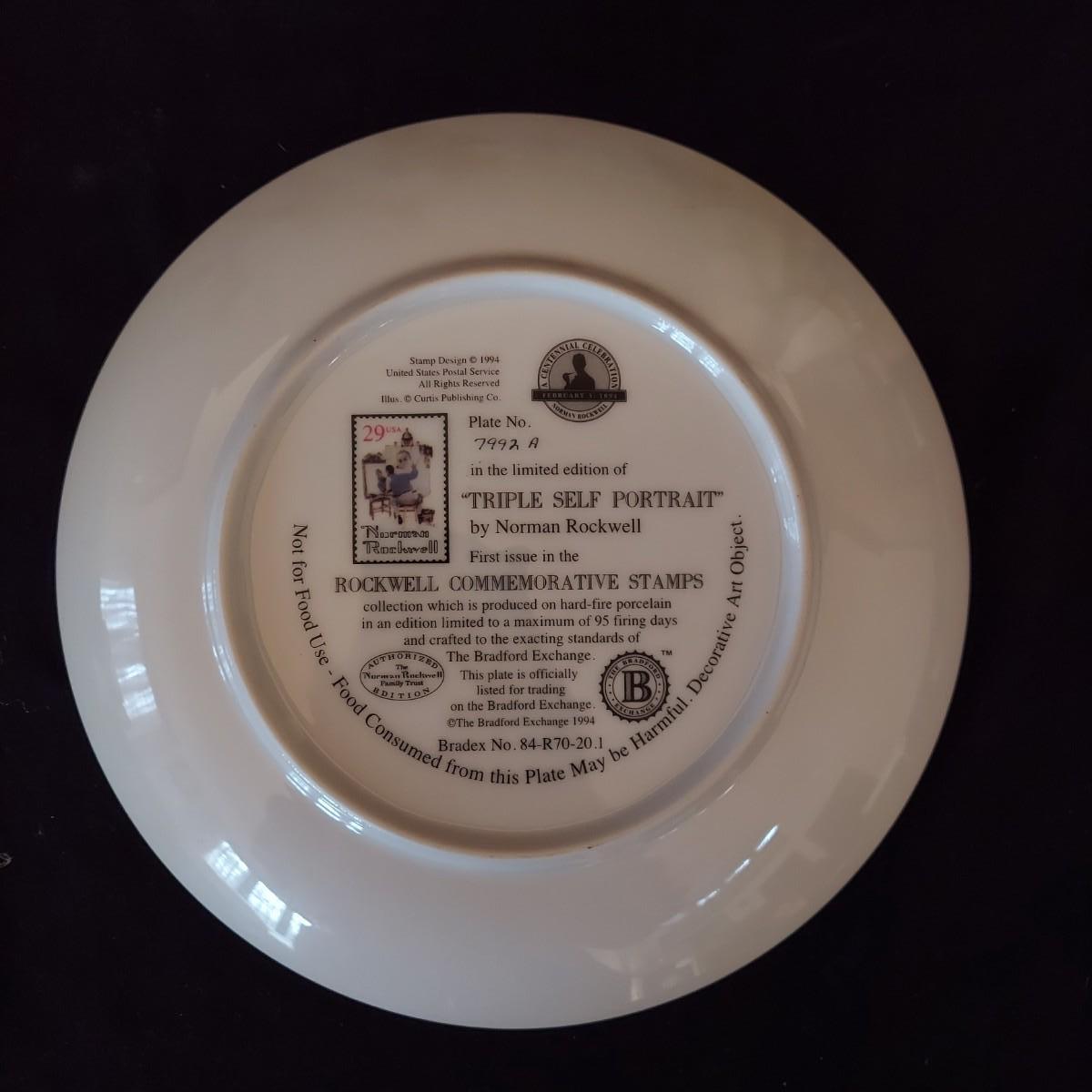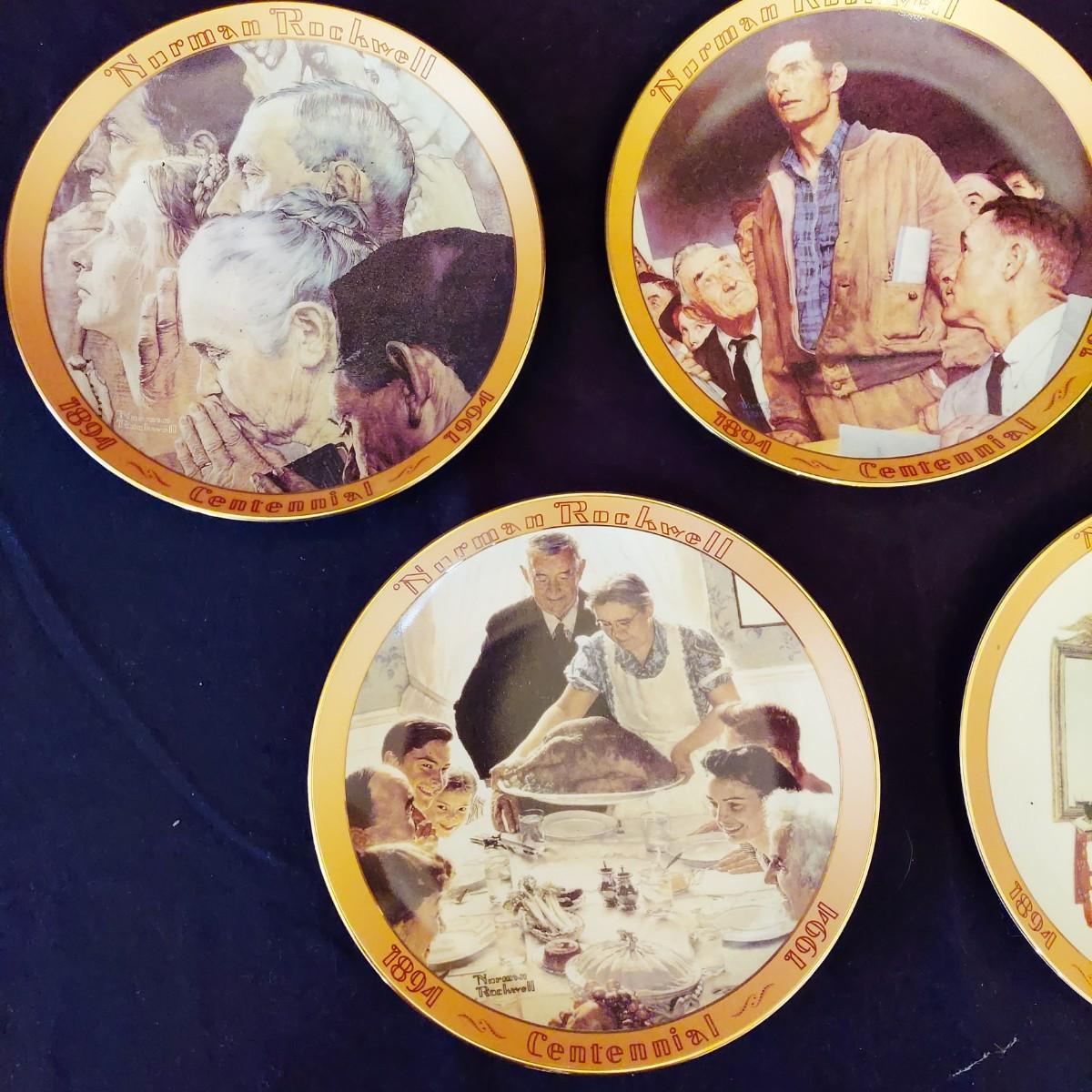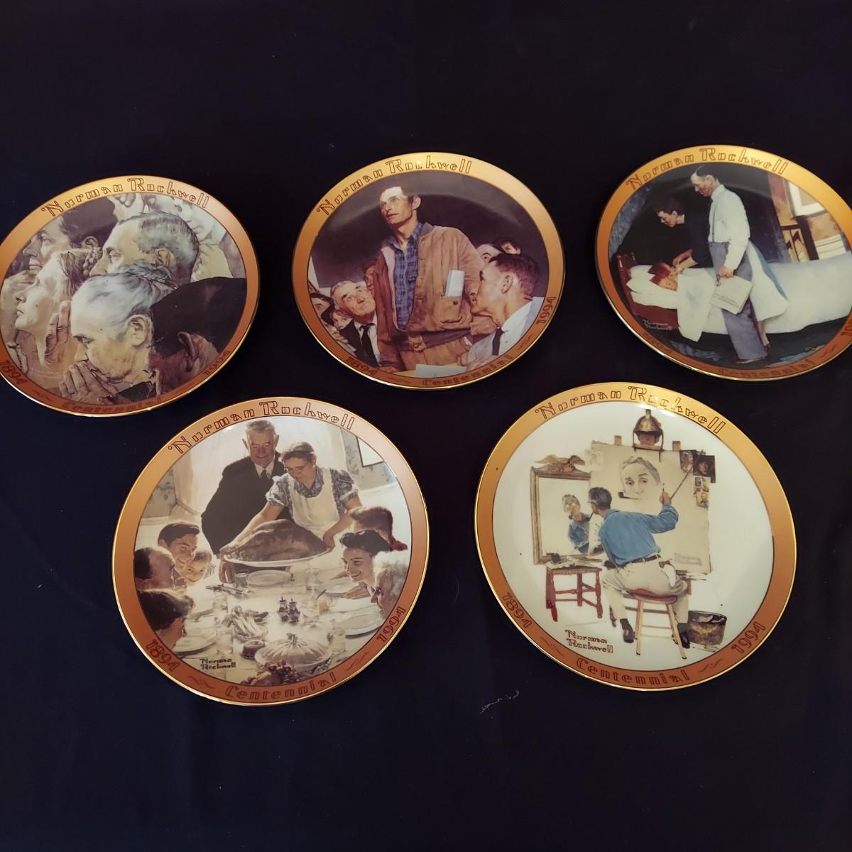 Lot of five collectible Norman Rockwell plates featuring works by the artist that were featured on commemorative stamps. The Bradford Exchange 1994. Plates are 8"D. Also includes seven collectible plate frames. Frame measures approximately 11"D. Made for an 8-8.5"D plate. Some have scratches. Please see photos. Shipping available. Shipping can be costly. We suggest contacting our preferred local shipping provider, Postage Express, with dimensions and getting an estimate before bidding: (828) 670-5501 or postageexpress@yahoo.com.
