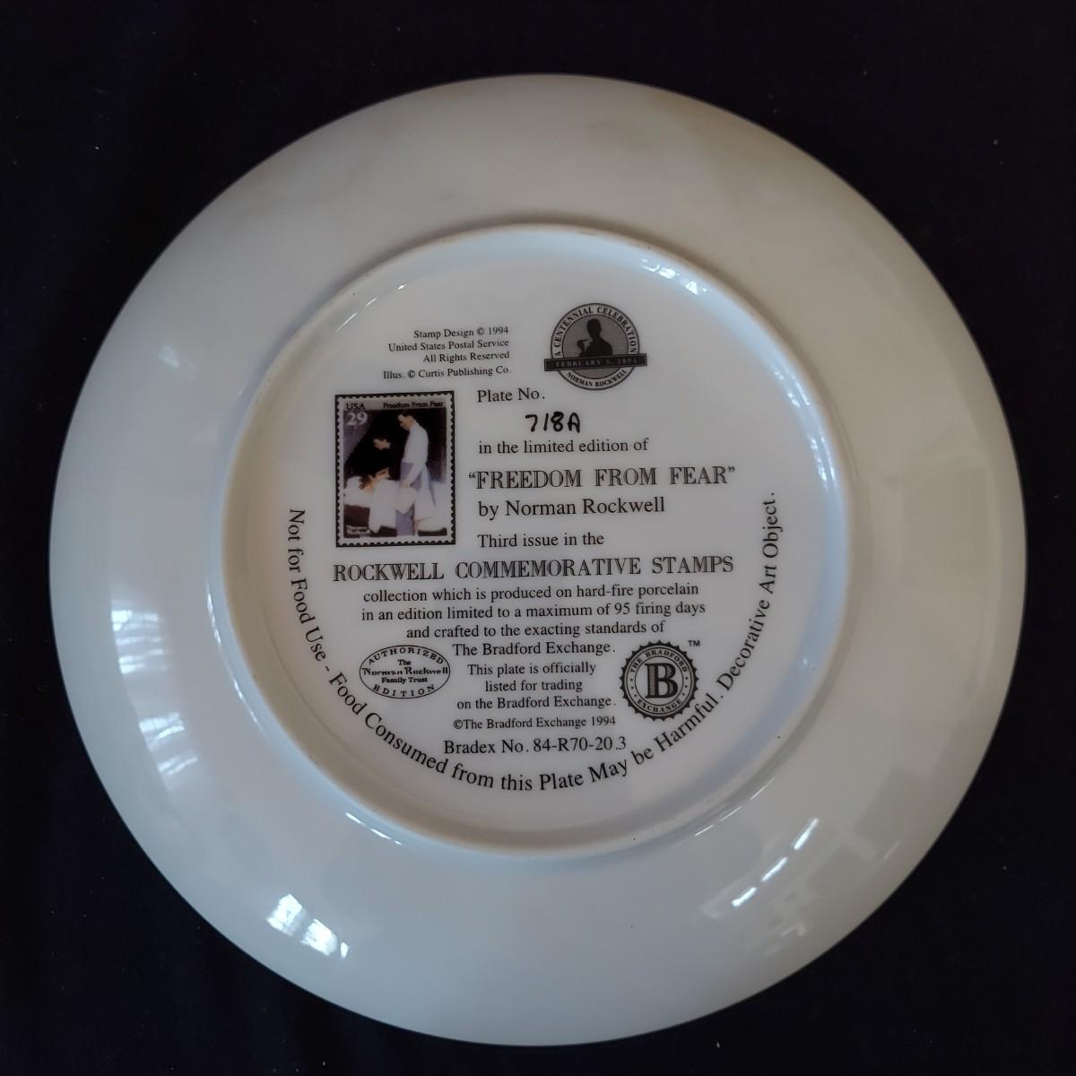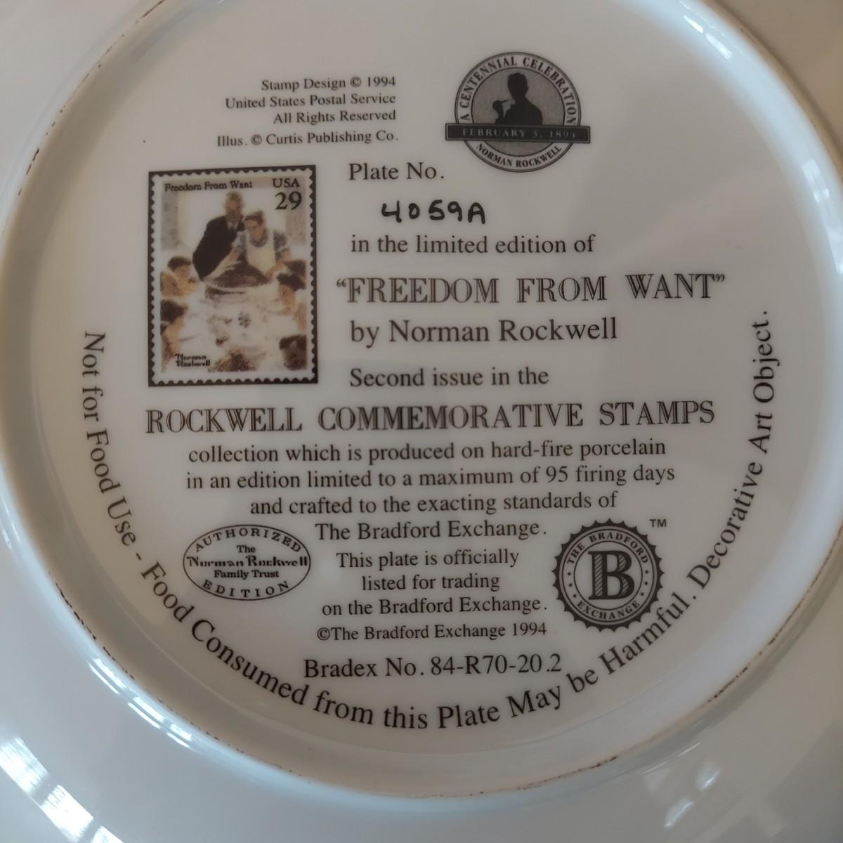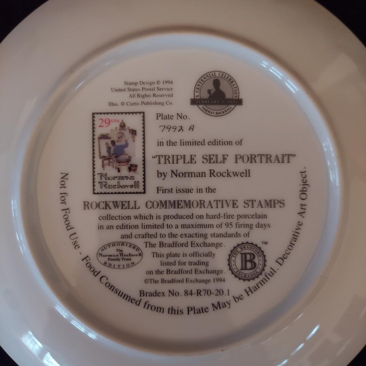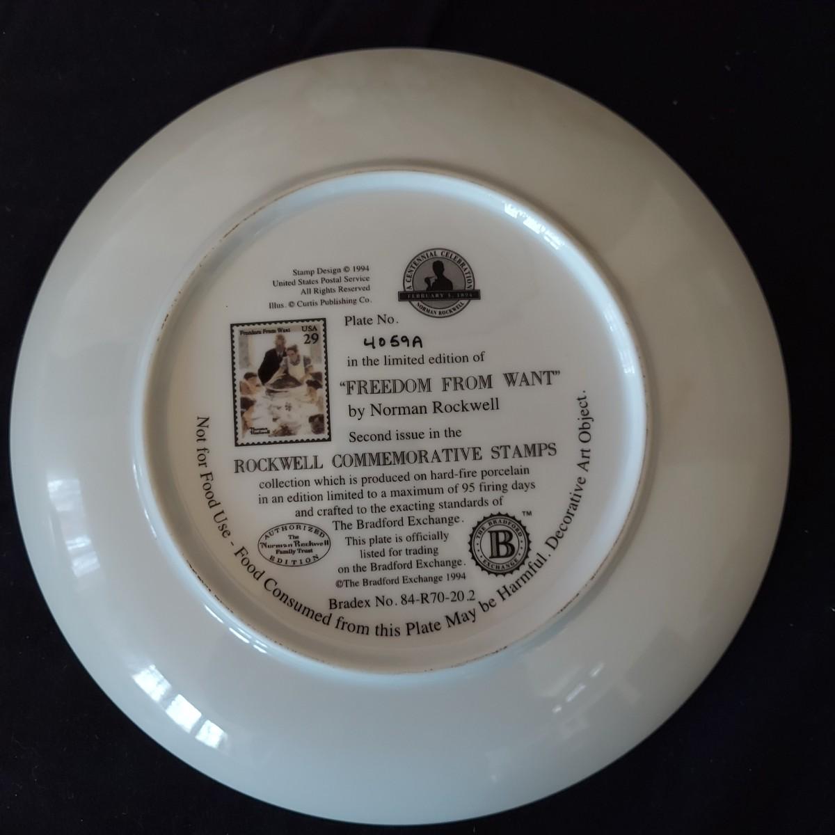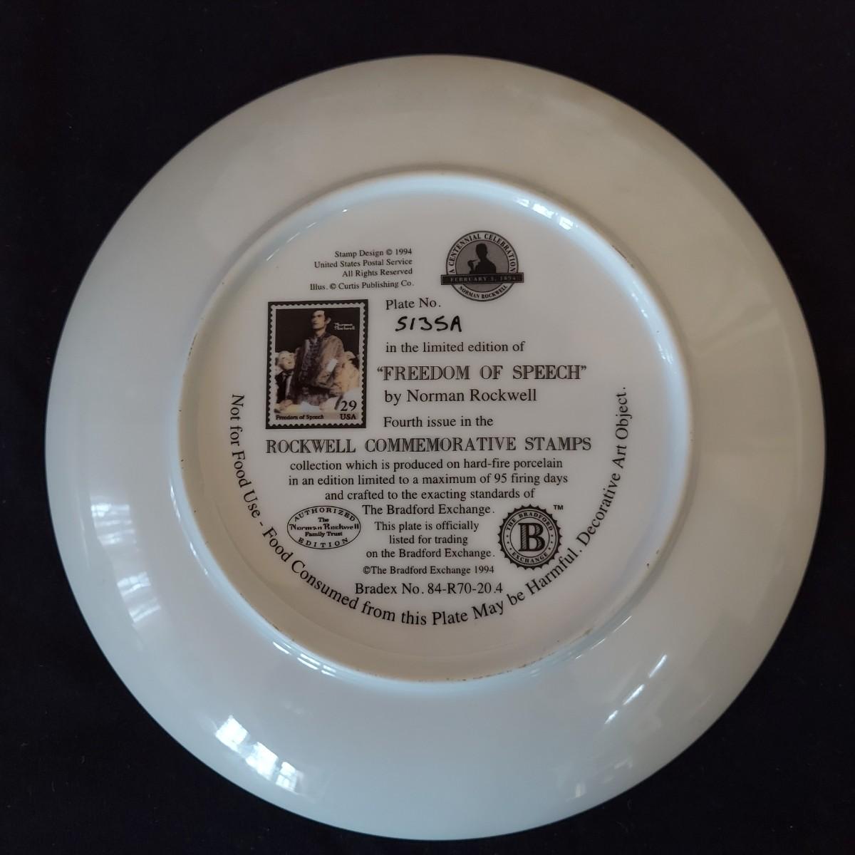 Lot of five collectible Norman Rockwell plates featuring works by the artist that were featured on commemorative stamps. The Bradford Exchange 1994. Plates are 8"D. Also includes seven collectible plate frames. Frame measures approximately 11"D. Made for an 8-8.5"D plate. Some have scratches. Please see photos. Shipping available. Shipping can be costly. We suggest contacting our preferred local shipping provider, Postage Express, with dimensions and getting an estimate before bidding: (828) 670-5501 or postageexpress@yahoo.com.